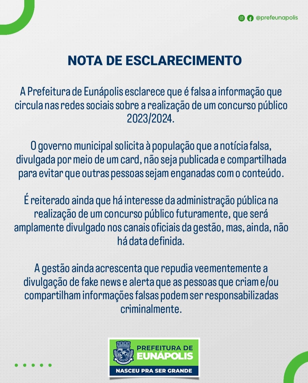 A Prefeitura de Eunápolis esclarece que é falsa a informação que circula nas redes sociais sobre a realização de um concurso público 2023/2024.