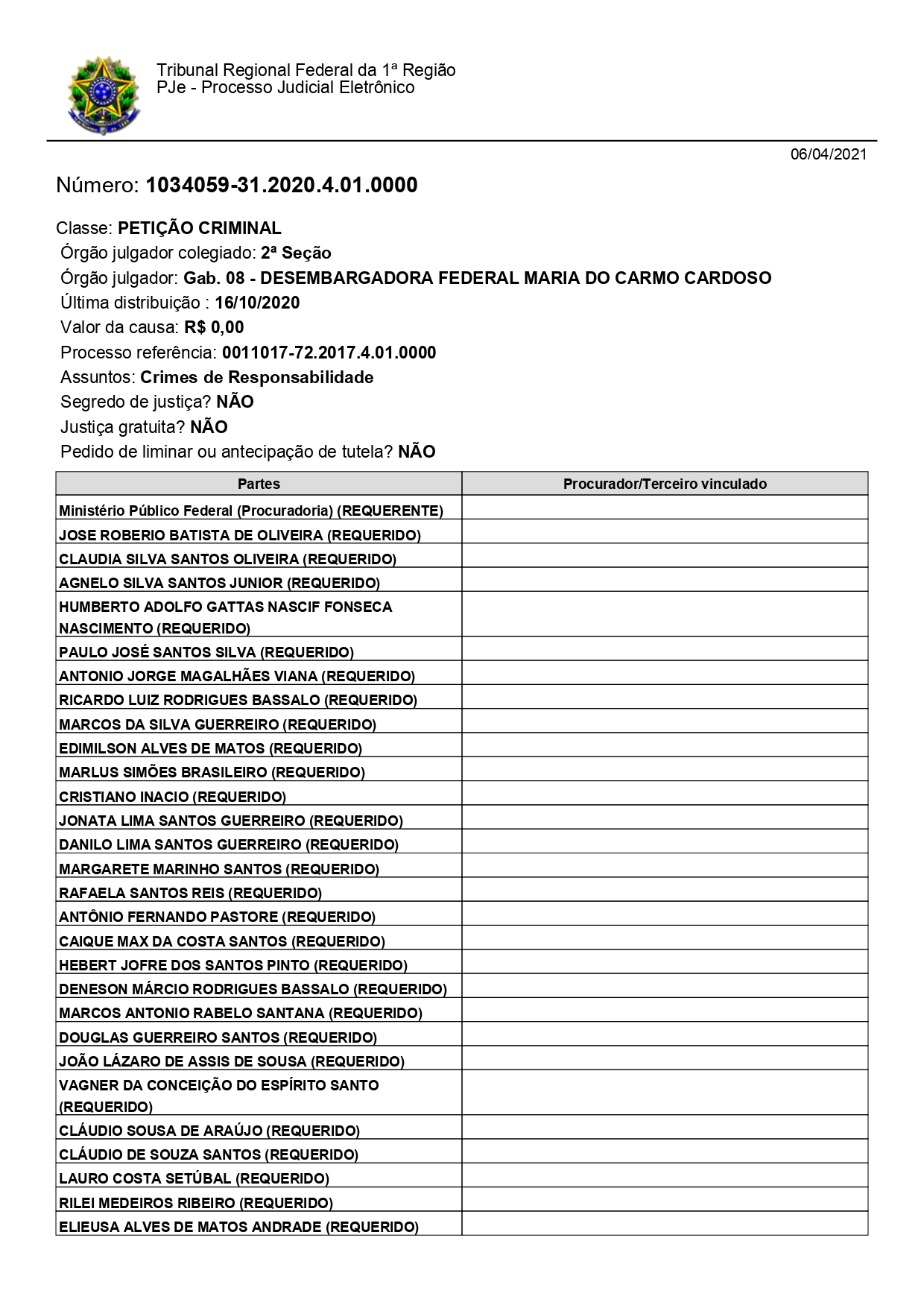 Desde o dia 30 de março de 2021, o inquérito já está concluso, e foi remetido a DESEMBARGADORA FEDERAL MARIA DO CARMO CARDOSO, e após o recebimento pela magistrada será formalizada a ação penal no âmbito do poder judicial, começando assim o processo e todos os trâmites legais.