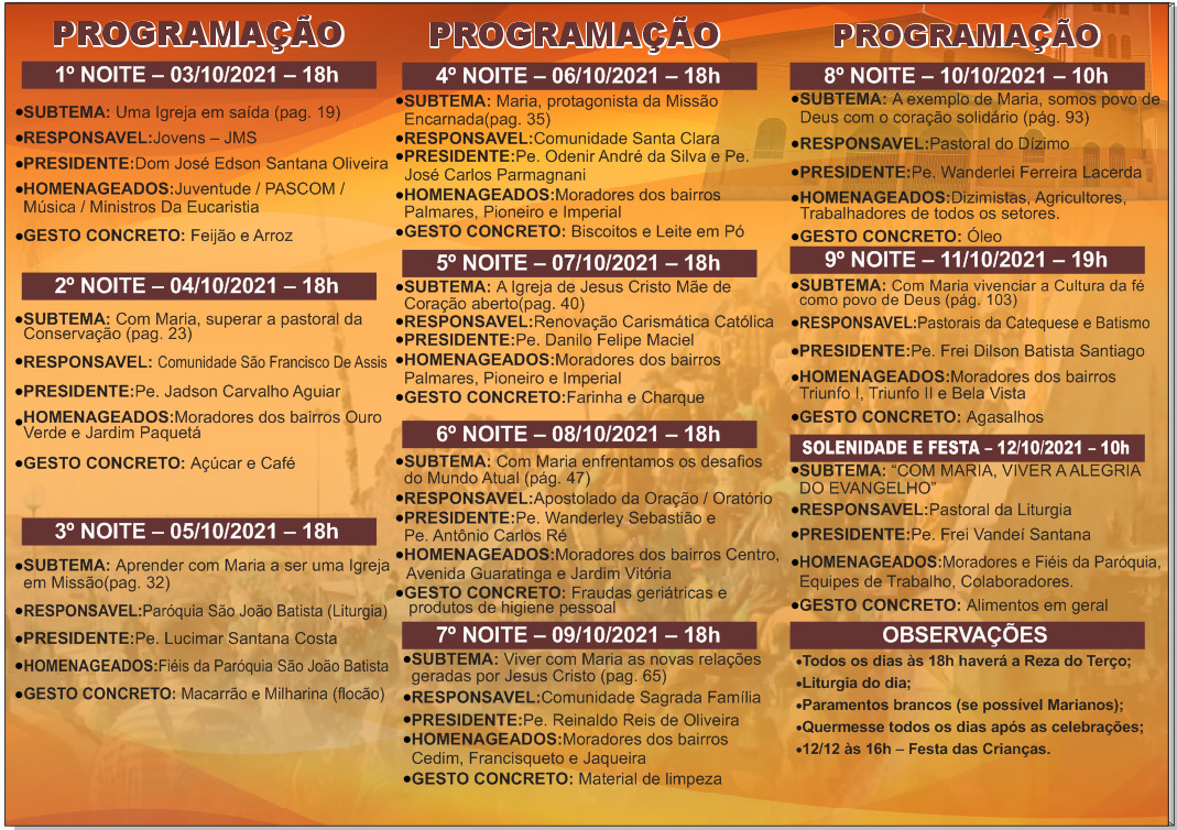 ” Quanto mais refletimos sobre a vida de Maria, mais podemos ver quanto tempo ela deve ter gasto olhando e adorando seu Filho, o salvador do mundo. Por isso convidamos a todos para viver conosco estes dias de fé e confraternização”, diz Pe. Reinaldo Reis de Oliveira, pároco da Paróquia.