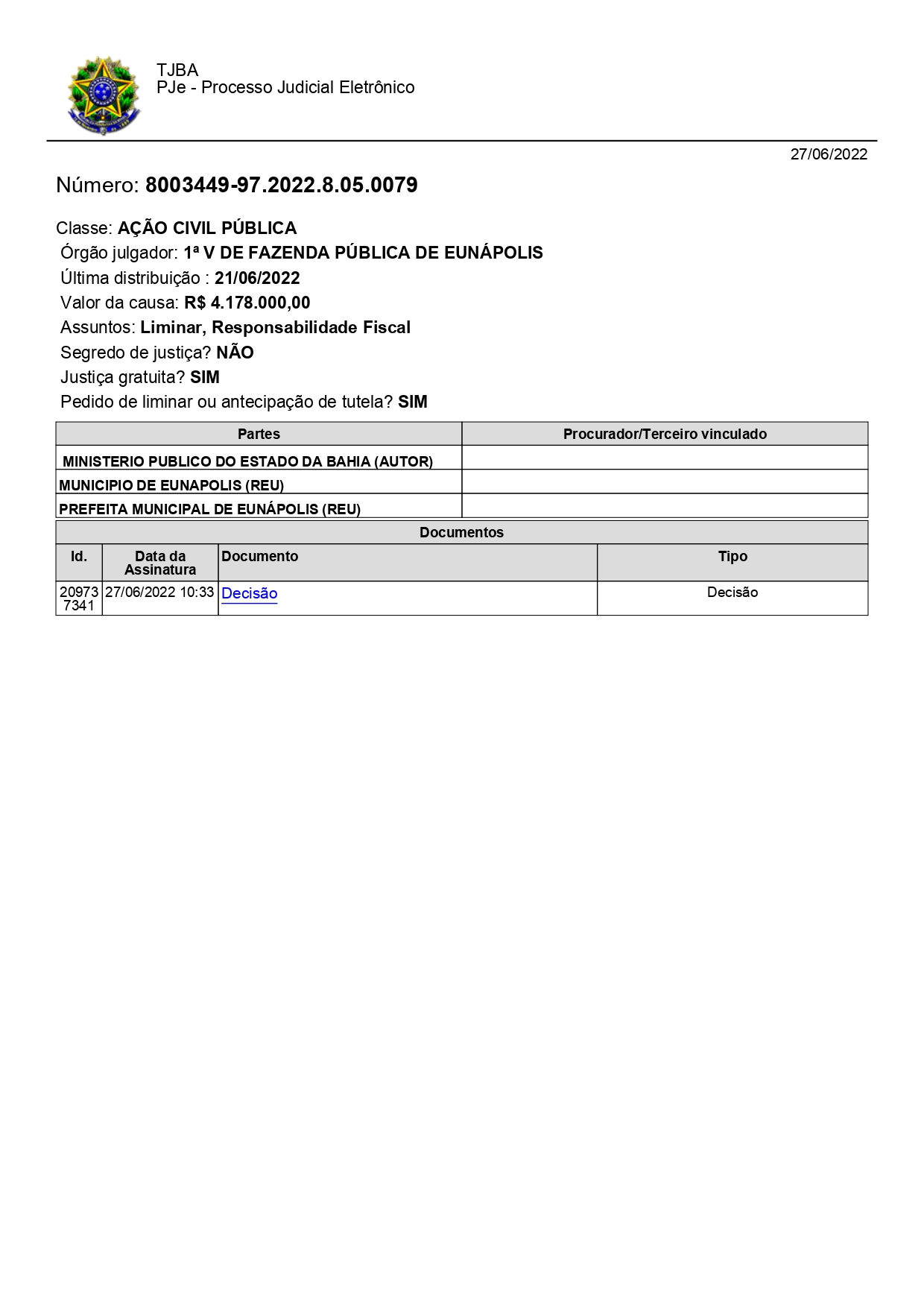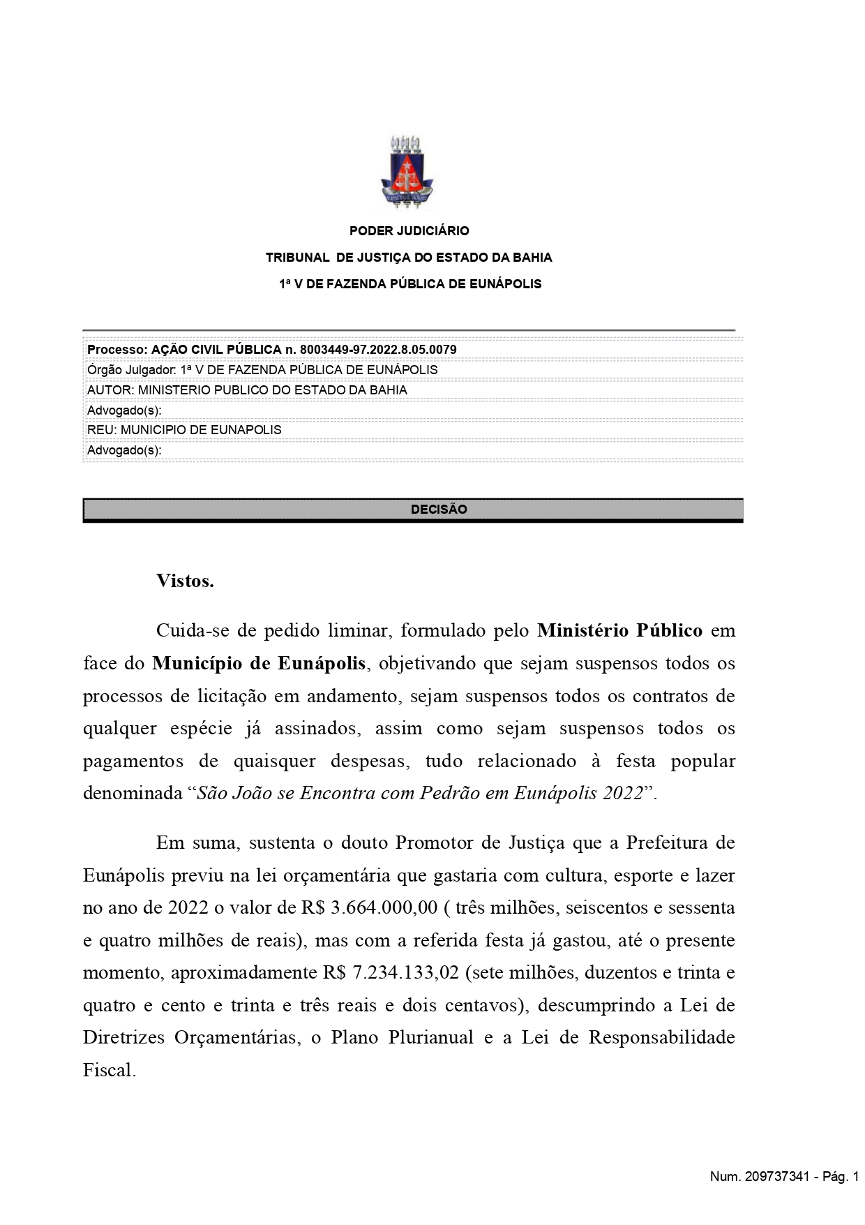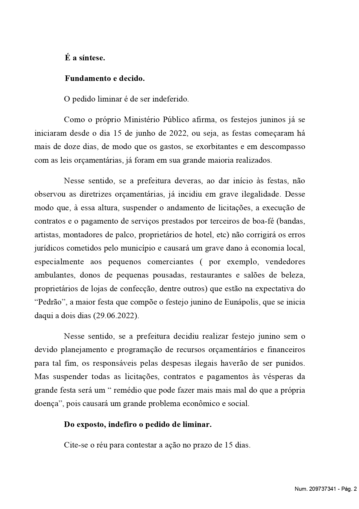 Em decisão proferida hoje (27), o juiz da da 1ª Vara da Fazenda Pública de Eunápolis, Roberto Freitas, indeferiu o pedido de liminar do Ministério Público da Bahia pelo cancelamento da festa das festas juninas. “São João se encontra com Pedrão”, segundo a Prefeitura de Eunápolis, está confirmada entre os dias 29 de junho e 03 de julho. Festa tradicional da cidade, o Pedrão tem sido amplamente divulgado desde maio e o MP/BA ingressou com uma representação somente no dia 21 de junho.