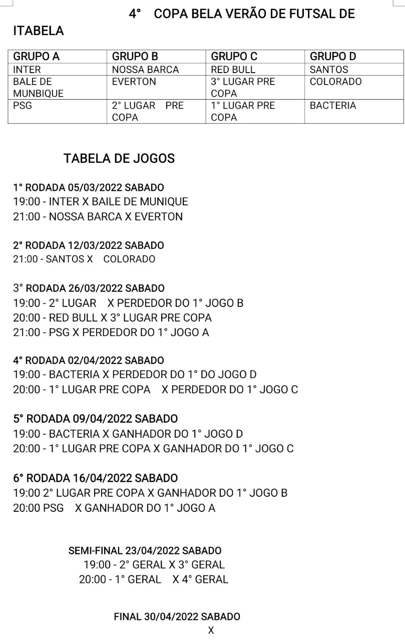 Segue aqui a tabela das próximas partidas principal da 4ª COPA BELA VERÃO DE ITABELA 2022.