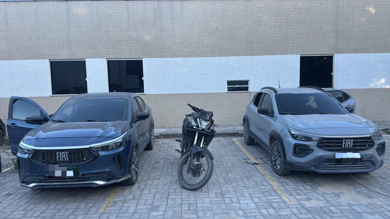 Durante a varredura nas imediações, foram localizados dois veículos e uma motocicleta estacionados mais à frente.