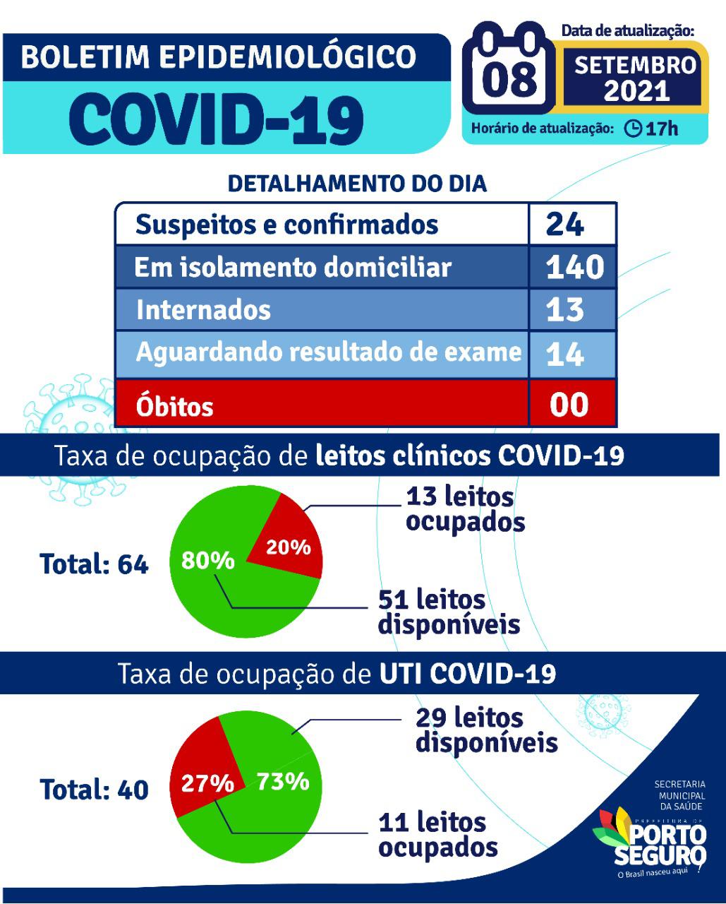 A Prefeitura de Porto Seguro, através da Secretaria Municipal de Saúde, informa que no período de 14/03/2020 a 08/09/2021, foram 25.983 casos de COVID-19, sendo 11.484 confirmados e 14.499