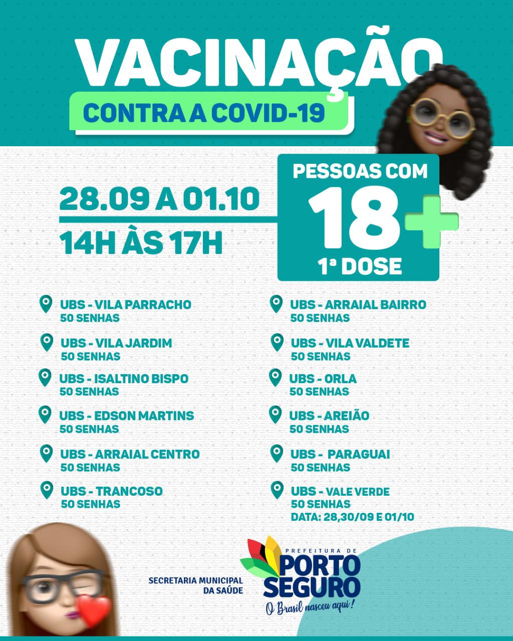 🗓 No período de 28/09 à 01 de de outubro, procure a Unidade Básica de Saúde (UBS) mais próxima da sua residência para receber a 1ª dose da vacina contra a COVID-19.