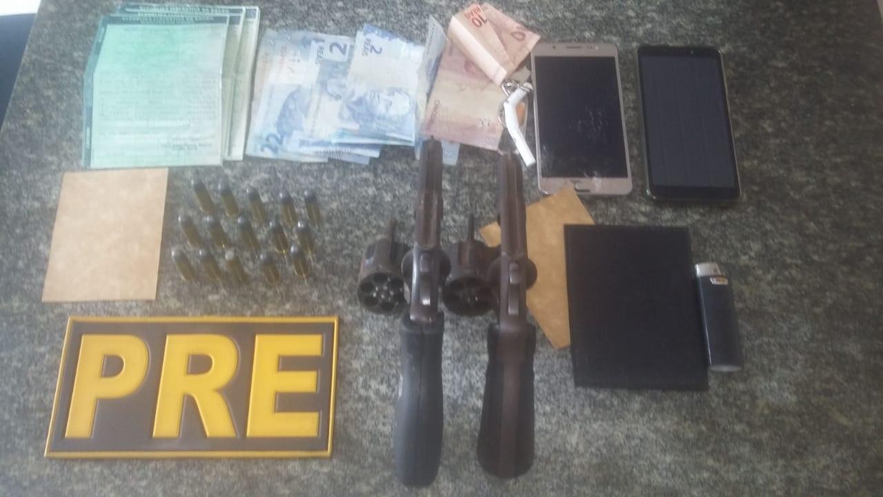 O veículo, os ocupantes, as duas armas de fogo e as munições intactas foram apresentados na Delegacia de Polícia de Itabela.
