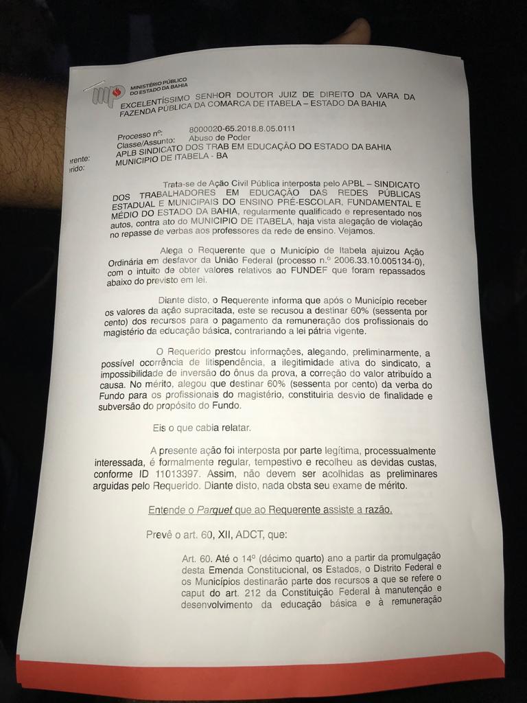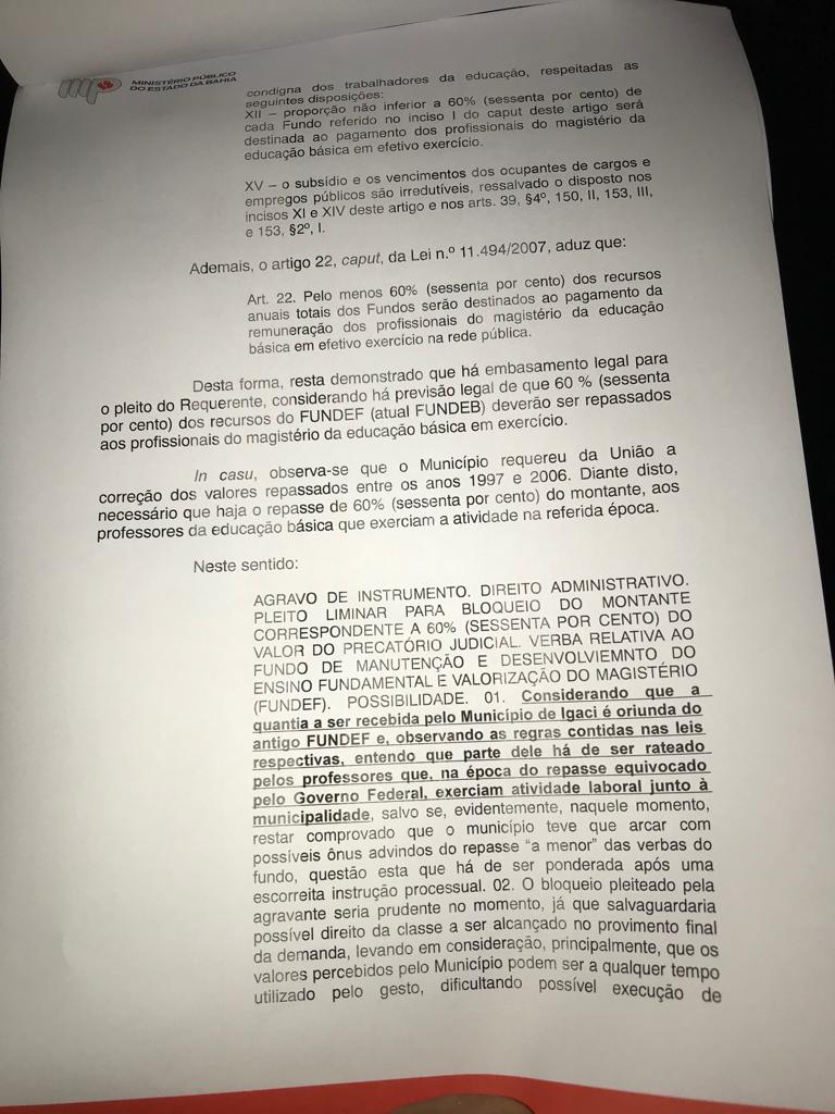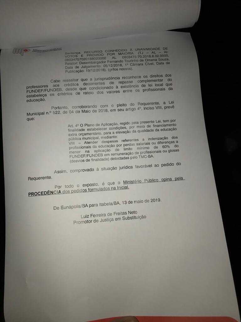 Na manhã desta quinta-feira (14/05/2019) o Promotor de Justiça Dr. Luiz Ferreira de Freitas Neto se manifestou dentro do processo de nº 8000020-65.2018.8.05.0111 que trata de uma Ação Civil Pública interposta pela APLB – SINDICATO DOS TRABALHADORES EM EDUCAÇÃO DAS REDES PÚBLICAS ESTADUAL E MUNICIPAIS DO ENSINO PRÉ-ESCOLAR, FUNDAMENTAL E MÉDIO DO ESTADO DA BAHIA, requerendo que seja destinado 60% dos precatórios do antigo FUNDEF ao pagamento dos profissionais da Educação.