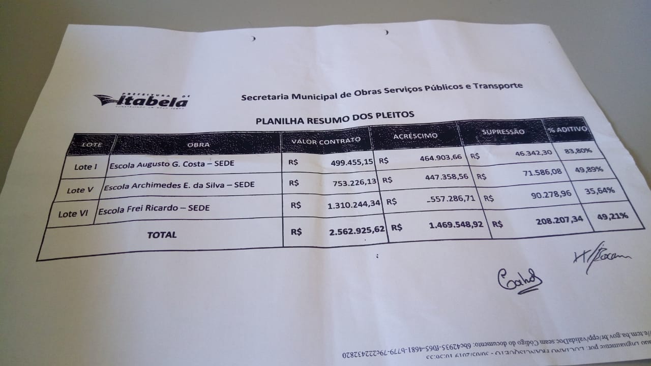 4º Ponto: Aditivos milionários nas obras das reformas das escolas. No colégio Municipal, em que a obra foi licitada com o valor próximo dos 3,5 milhões, mesmo estando há apenas 30% das obras concluídas, o contratado já sofreu aditivo de quase 600 mil. O mesmo ocorreu com a construção do Ginásio que licitado a um valor de um pouco mais de 3,5 milhões, também já sofreu aditivo. Também já sofreram aditivos os contratos das reformas das escolas Archimedes, Frei Ricardo e Augusto Costa que estão descritos na tabela abaixo: