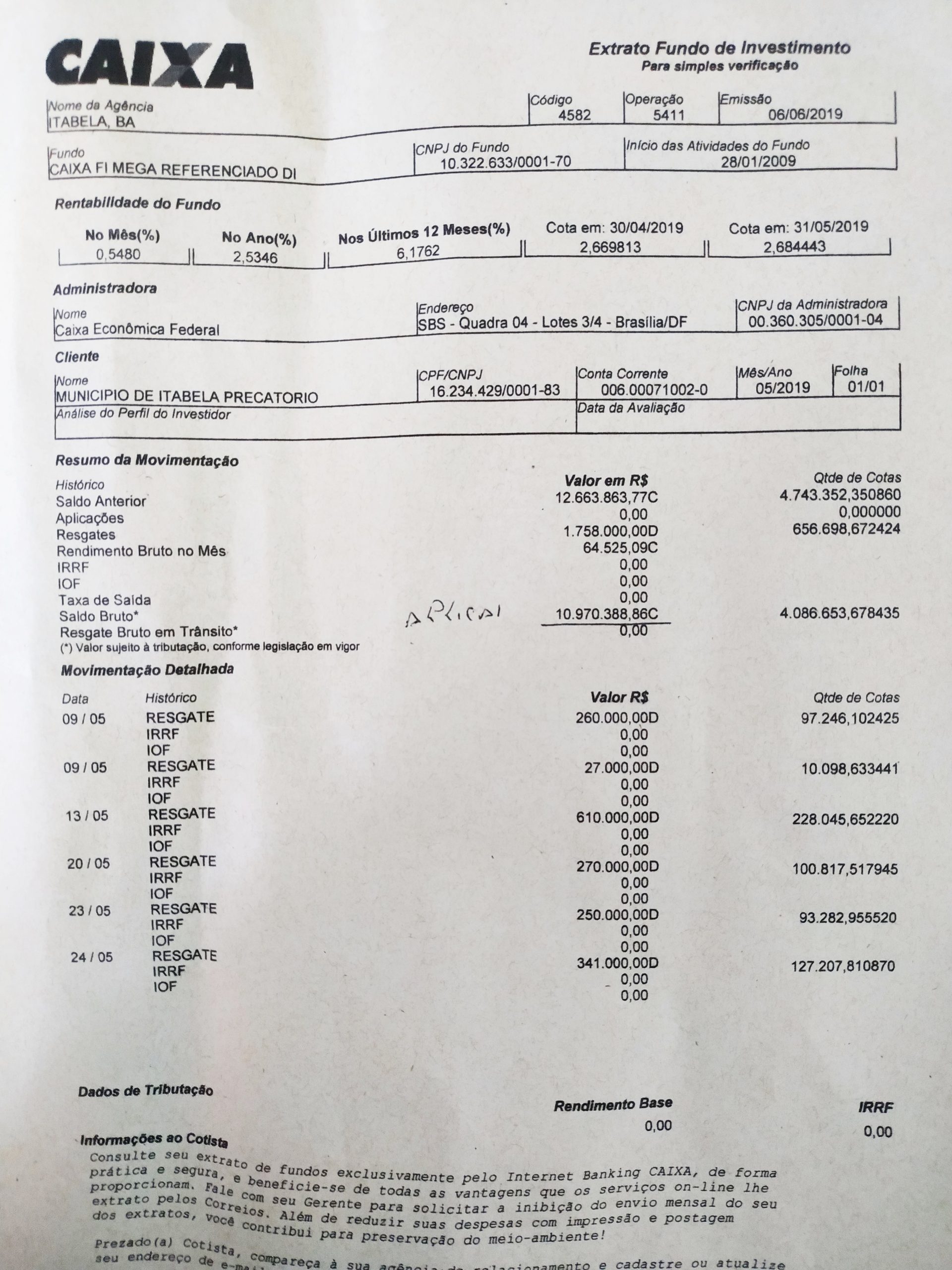 No entanto, o Gestor Municipal vem entrando em contradição com o que sempre disse: “Se a justiça determinar EU PAGO os 60%”. Ele diz uma coisa, mas nos bastidores faz outra totalmente contrária, pois dos recursos existentes nas contas do Precatório do Fundef, que com juros e correções monetárias ultrapassava os R$ 30.000.000,00 (Trinta milhões de reais), até o dia 31 de maio, restavam nas contas do oriundo fundo os valores descritos abaixo: