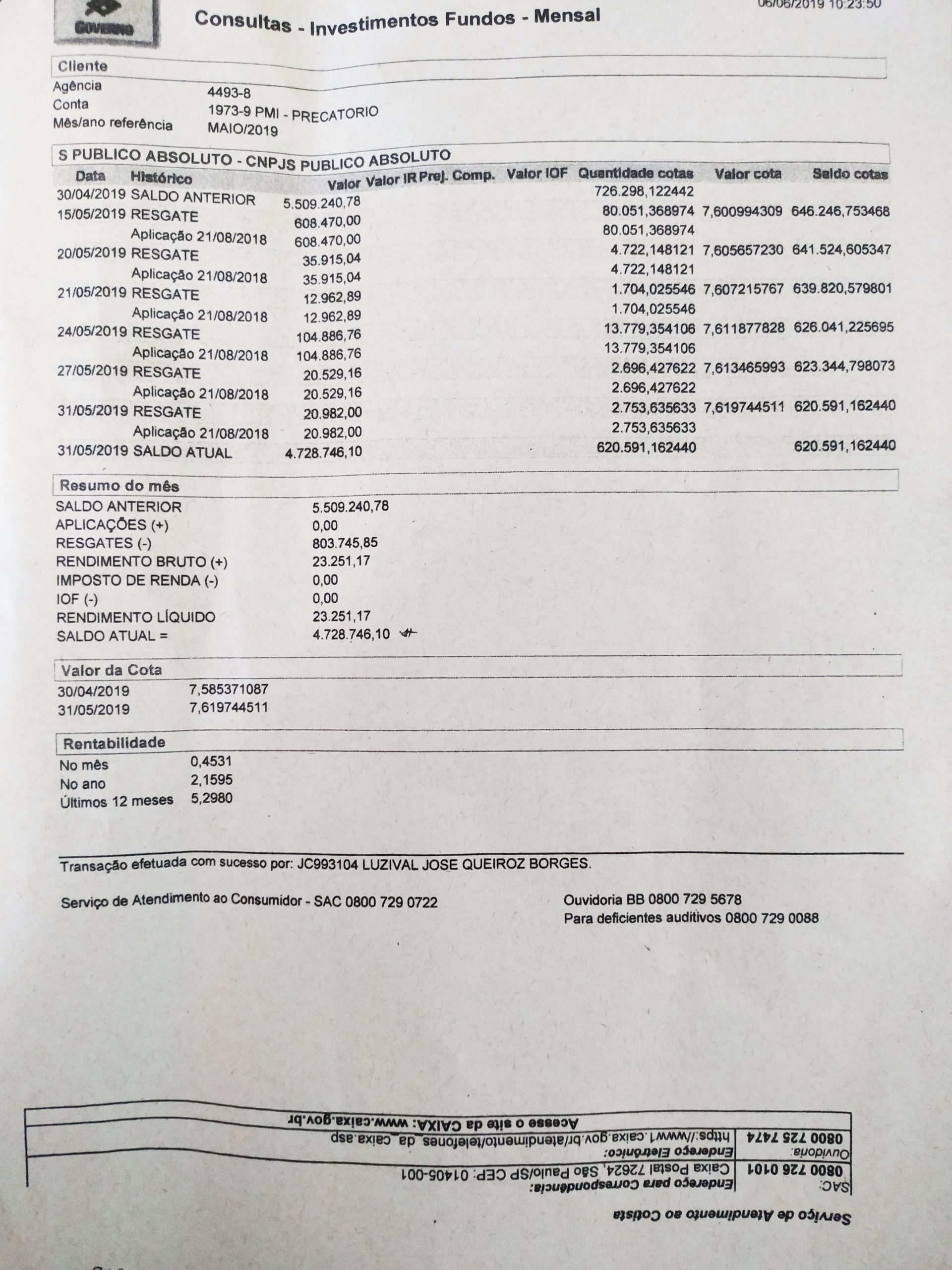 Conta Banco do Brasil: R$ 4.728.746,10 (quatro milhões setecentos e vinte e oito mil setecentos e quarenta e seis reais e dez centavos.