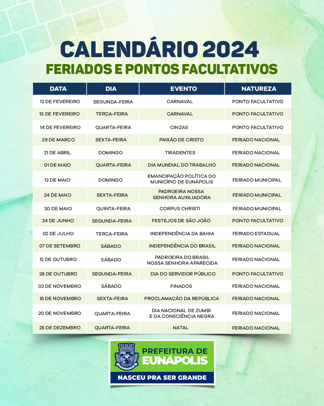 A prefeita de Eunápolis, Cordélia Torres, tomou uma medida significativa para a gestão municipal ao assinar recentemente o decreto n° 11.646, que institui o calendário de feriados e pontos facultativos para o ano de 2024 na cidade.