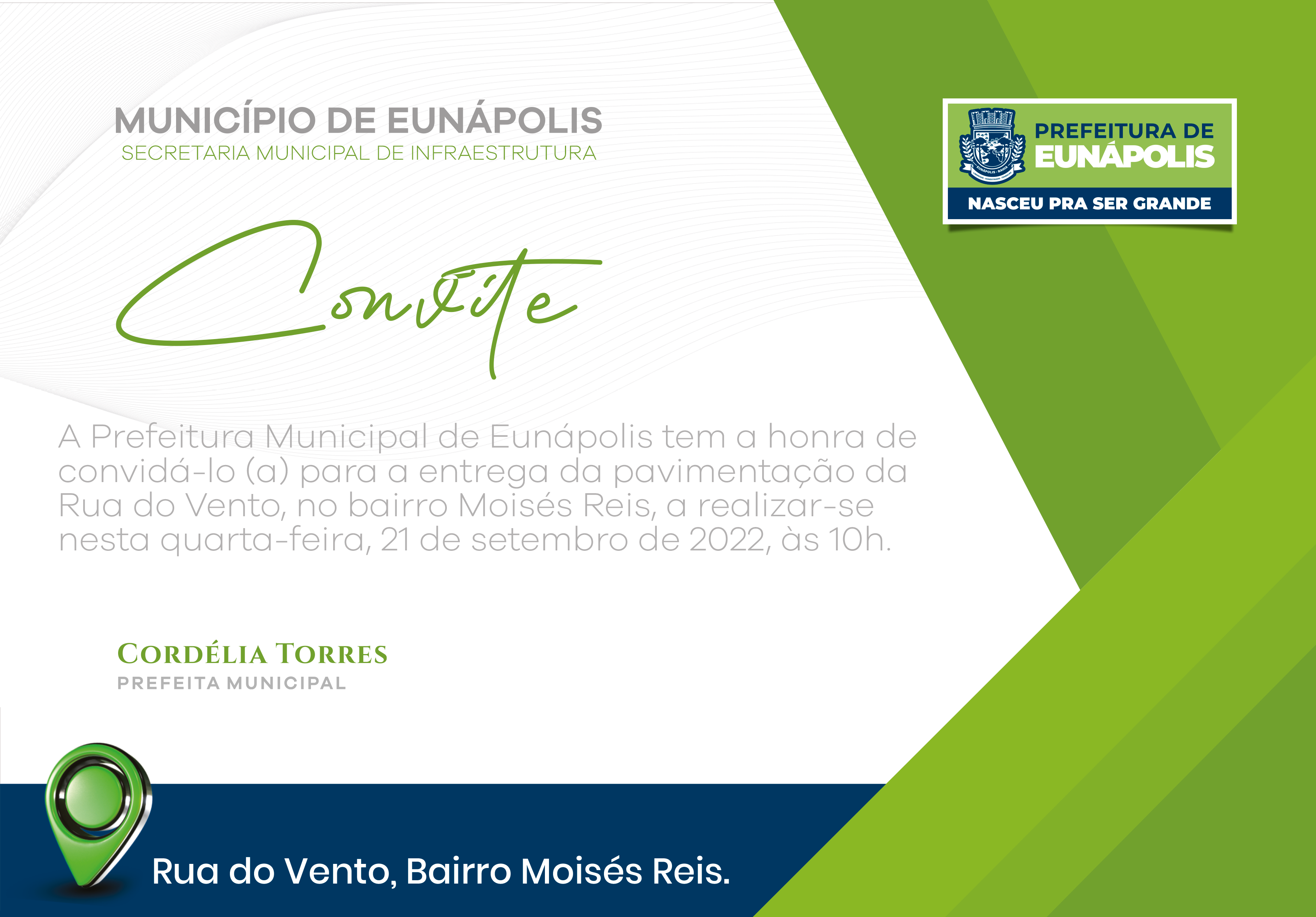 A pavimentação da Rua do Vento faz parte do projeto de requalificação urbanística, que já compreendeu mais de 20 mil metros quadrados de vias públicas pavimentadas, atendendo, sobretudo a parcela mais carente dos eunapolitanos, evidenciando o olhar humanizado da gestão, que tem como compromisso cuidar de gente.