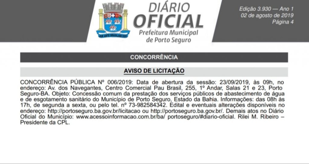 A Prefeita de Porto Seguro, Claudia Oliveira, passou por cima de todos e na última sexta-feira (02/08) publicou o aviso de licitação na modalidade de Concorrência Pública, Nº 006/2019, com data de abertura das propostas prevista para 23/09, onde o objeto será escolher a empresa que operará o sistema de água e saneamento da cidade. Segundo denúncias dos contrários à proposta da gestora, o processo apresenta diversas irregularidades como:  A falta de um Plano Básico de Saneamento, a falta de um Conselho Gestor Público/Privado como prever a lei, Não há previsão orçamentária para ativos não amortizados e débitos comerciais que, segundo estudos da EMBASA, superam a casa dos R$79 milhões e não há identificação da fonte de custeio dessas despesas exigida pela lei de Responsabilidade Fiscal.