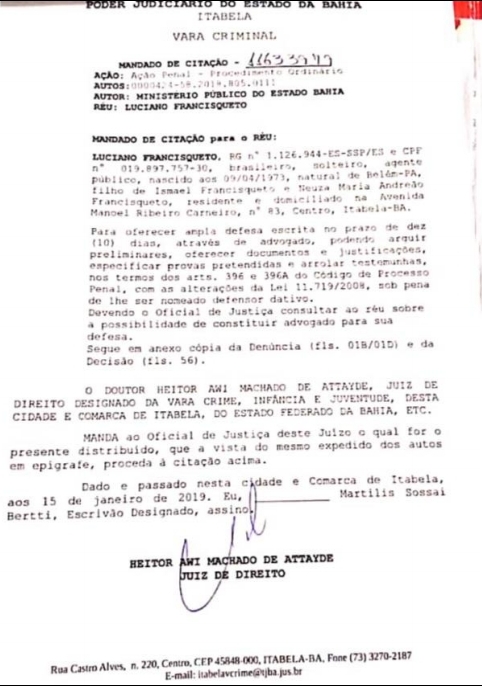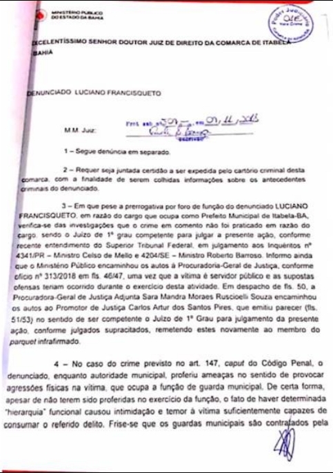 O Prefeito de Itabela no Extremo Sul da Bahia – Luciano Francisqueto, foi denunciado Pelo Ministério Público e virou réu em uma ação penal na Vara Crime daquela cidade – processo nº: 0000424-58.2018.805.0111 – por ter ameaçado de mal físico, proferido palavras de baixo calão e quebrado o celular de um Guarda Civil Municipal – GCM daquela cidade, por estar o referido GCM defendendo os interesses da categoria.