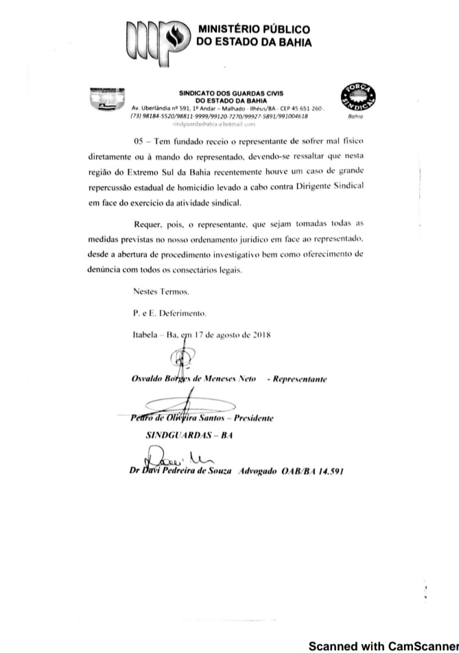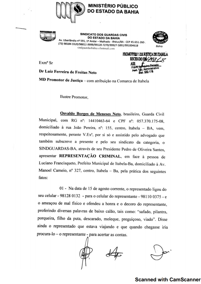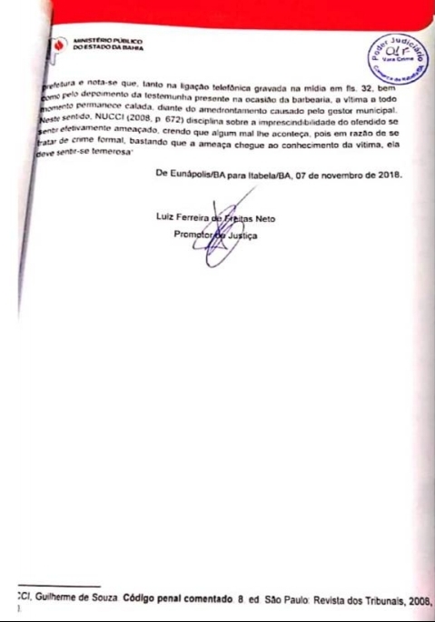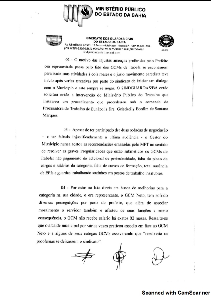 O SINDGUARDAS – BA apresentou Noticia Crime contra o referido Prefeito – doc. em anexo, subscrita pelo Presidente do Sindicato Pedro de Oliveira e o advogado Davi Pedreira. O Promotor Crime da Comarca de Itabela – Luiz Ferreira de Freitas Neto, após oficiar a Procuradora Geral do Ministério Público do Estado da Bahia, e receber autorização expressa da Procuradora de Justiça Drª Sara Mandra Moraes Ruscioelli Souza, apresentou Denuncia Crime contra o Prefeito de Itabela, por infração dos arts. 147 caput e art. 163 § único I, em concurso material (art. 69), ambos do Código Penal Pátrio, que foi acatada pelo Juiz Criminal Dr Heitor Awi Machado de Attayde, estando já expedido Mandado de Citação.