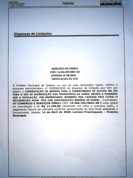Fato é que, a Prefeitura Municipal de Itabela fez uma DISPENSA DE LICITAÇÃO no dia 14/04/2020 no valor de R$ 17.160,00 (dezessete mil cento e sessenta reais) na compra de álcool em gel e a EMPRESA CONTRATADA foi H7 COMERCIO E SERVIÇOS EIRELI, cuja a sede fica na Rua Estados Unidos, 338ª, no bairro Santa Rita na Cidade de EUNAPOLIS, mesmo tendo uma fábrica que produz o mesmo item comprado com o preço mais acessível na Cidade de Itabela.