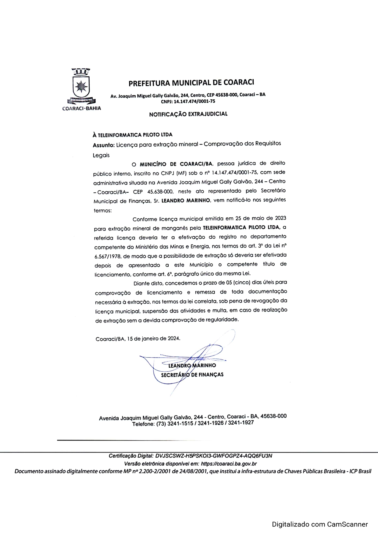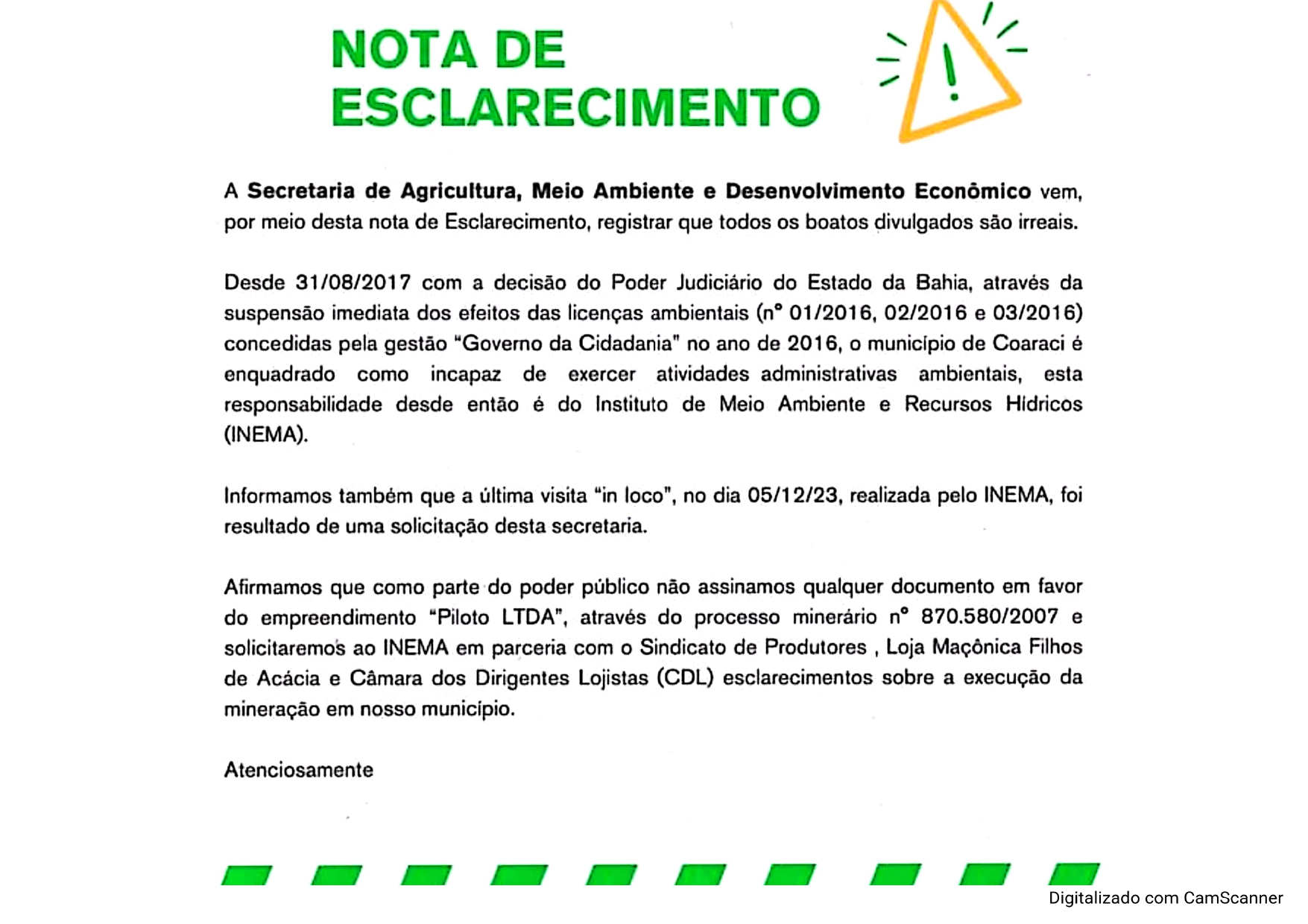 Essa NOTA DE ESCLARECIMENTOS publicada pela Secretaria de Agricultura e Meio Ambiente de Coaraci, contraria com as informações publicadas no diário oficial do município de Coaraci, no dia 18 de Janeiro de 2024, Edição 3.840, NOTIFICAÇÃO EXTRAJUDICIAL – TELEINFORMATICA PILOTO LTDA, onde o Secretário de Finanças Leandro Marinho relata que foi emitida a LICENÇA MUNICIPAL PARA EXTRAÇÃO DE MINERAL DE MAGANÊS PARA TELEINFORMATICA PILOTO LTDA, e dar prazo de 5 dias para a mesma empresa apresentar documentação necessária a extração, sob pena de revogação da Licença Municipal.