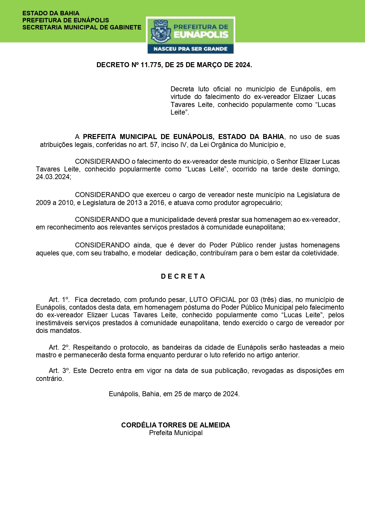 Em gesto de reconhecimento e luto, as bandeiras da cidade de Eunápolis serão hasteadas a meio mastro durante o período de três dias, conforme consta no decreto nº 11.775. “Este gesto oficial reflete a admiração e respeito por uma vida dedicada ao serviço público e ao bem-estar da comunidade local, agora celebrada e lembrada com pesar pela cidade de Eunápolis”, salientou a prefeita de Eunápolis, Cordélia Torres.