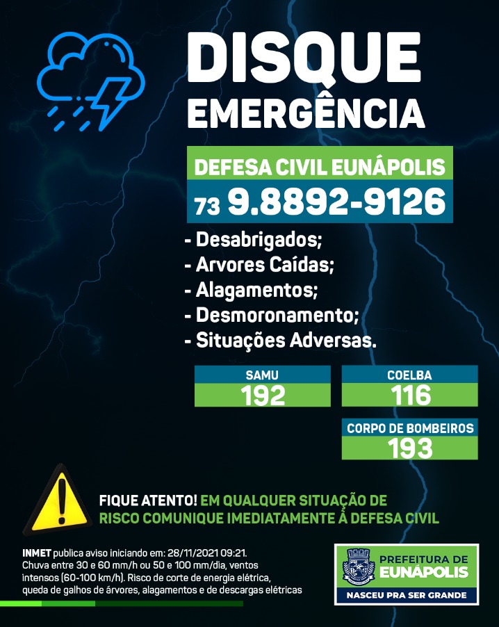 A Prefeitura Municipal de Eunápolis disponibilizou um disque emergência para os cidadãos que sofreram prejuízos com o temporal ocorrido no sábado, dia 27.