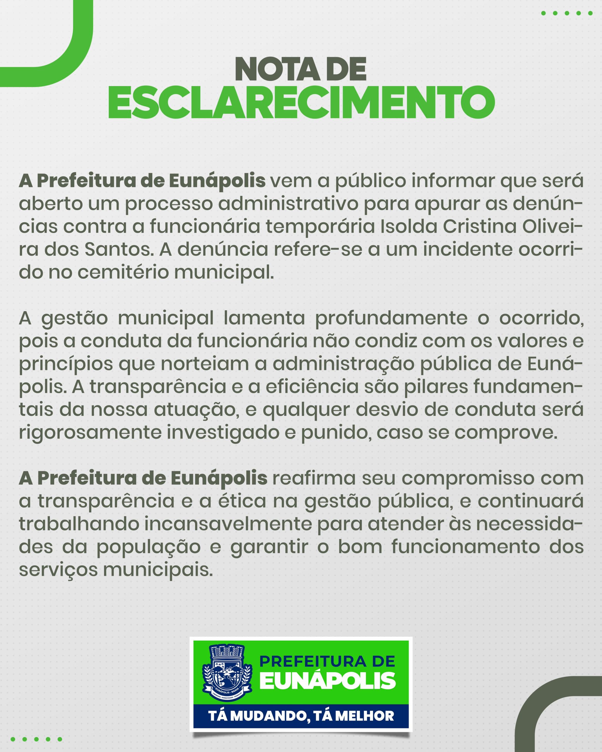 A Prefeitura de Eunápolis vem a público informar que será aberto um processo administrativo para apurar as denúncias contra a funcionária pública Isolda Cristina Oliveira dos Santos. A denúncia refere-se a um incidente ocorrido no cemitério municipal.