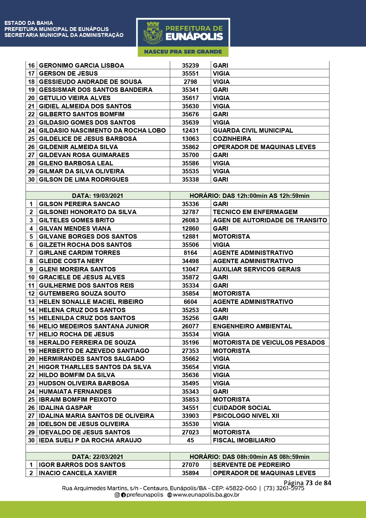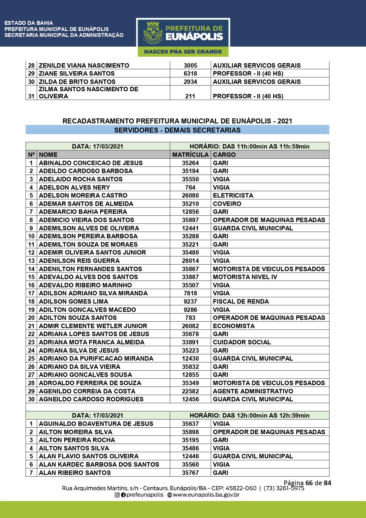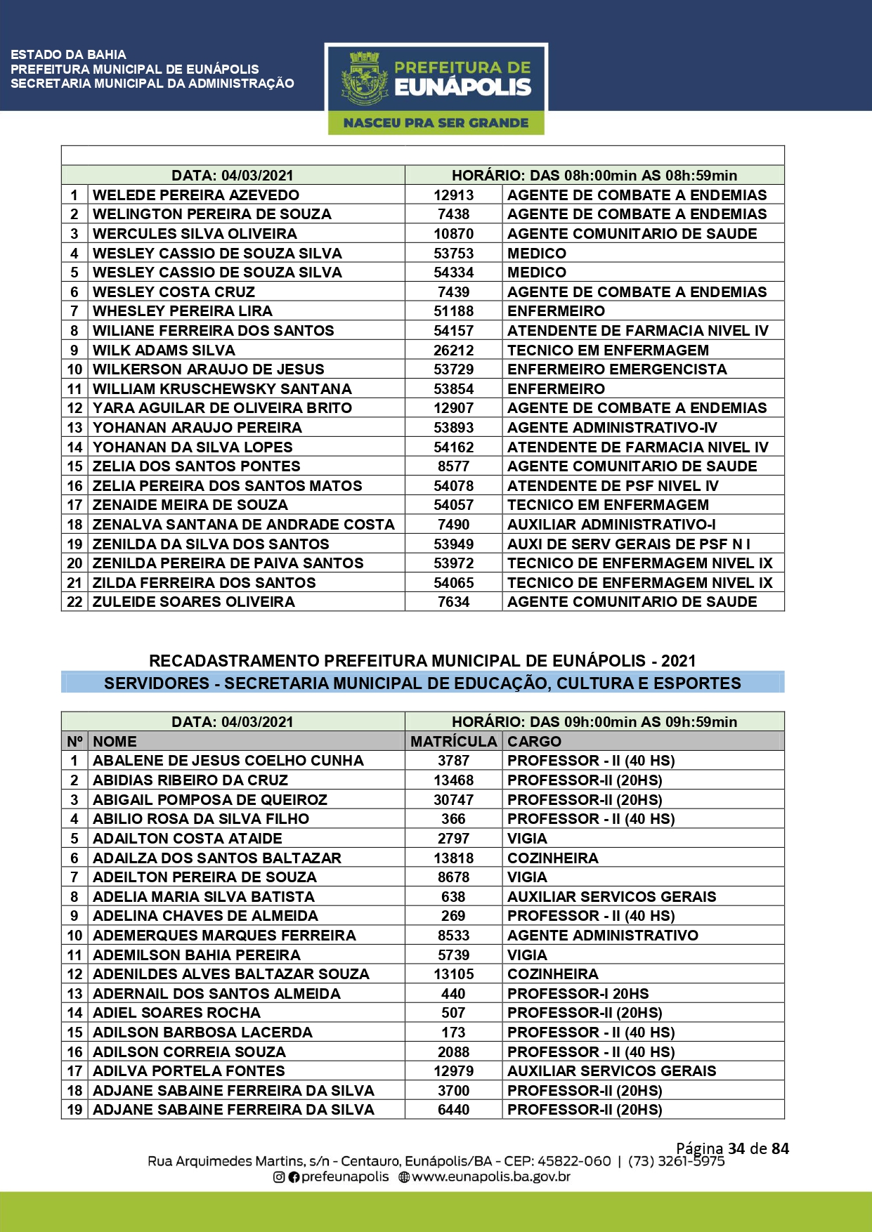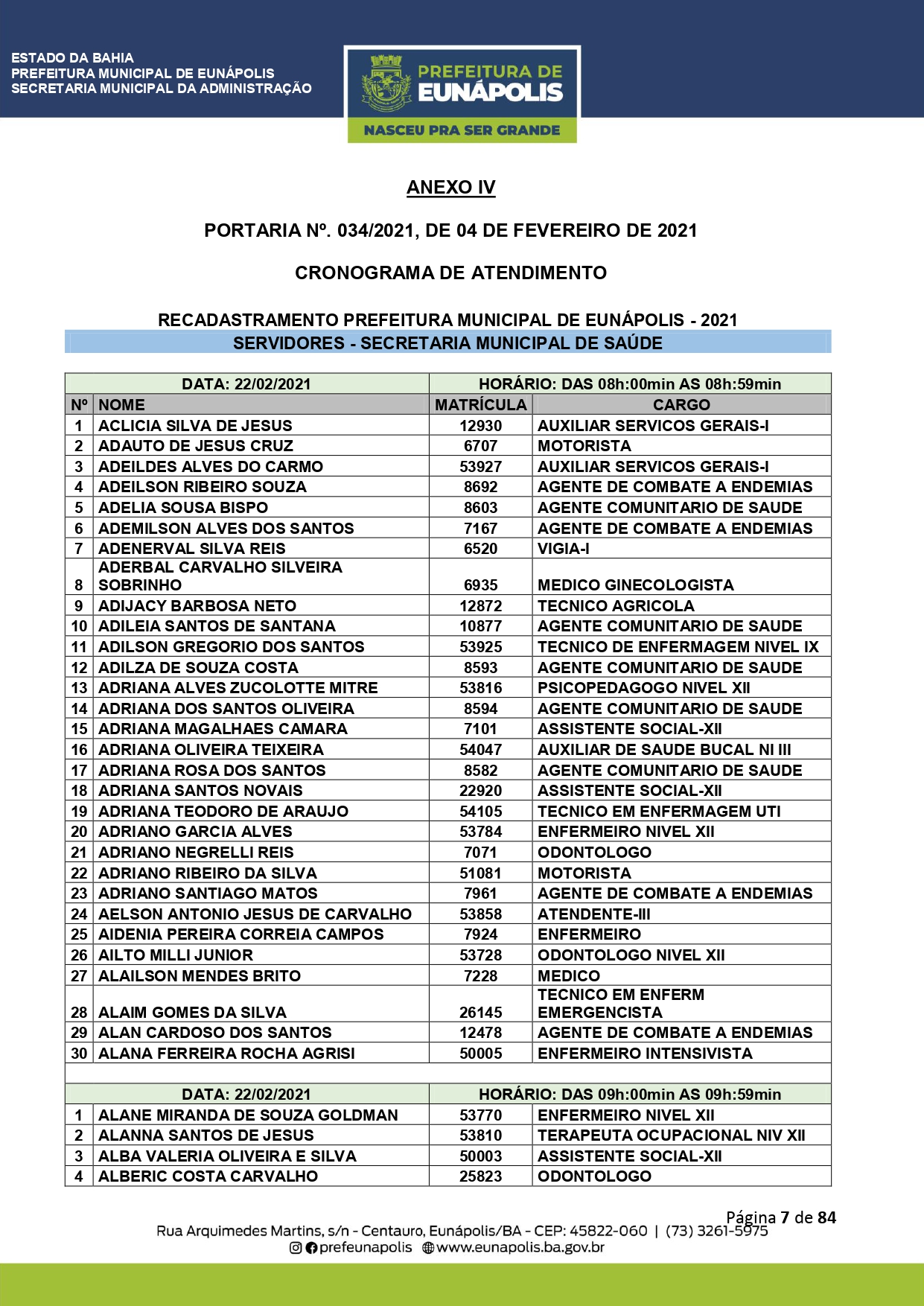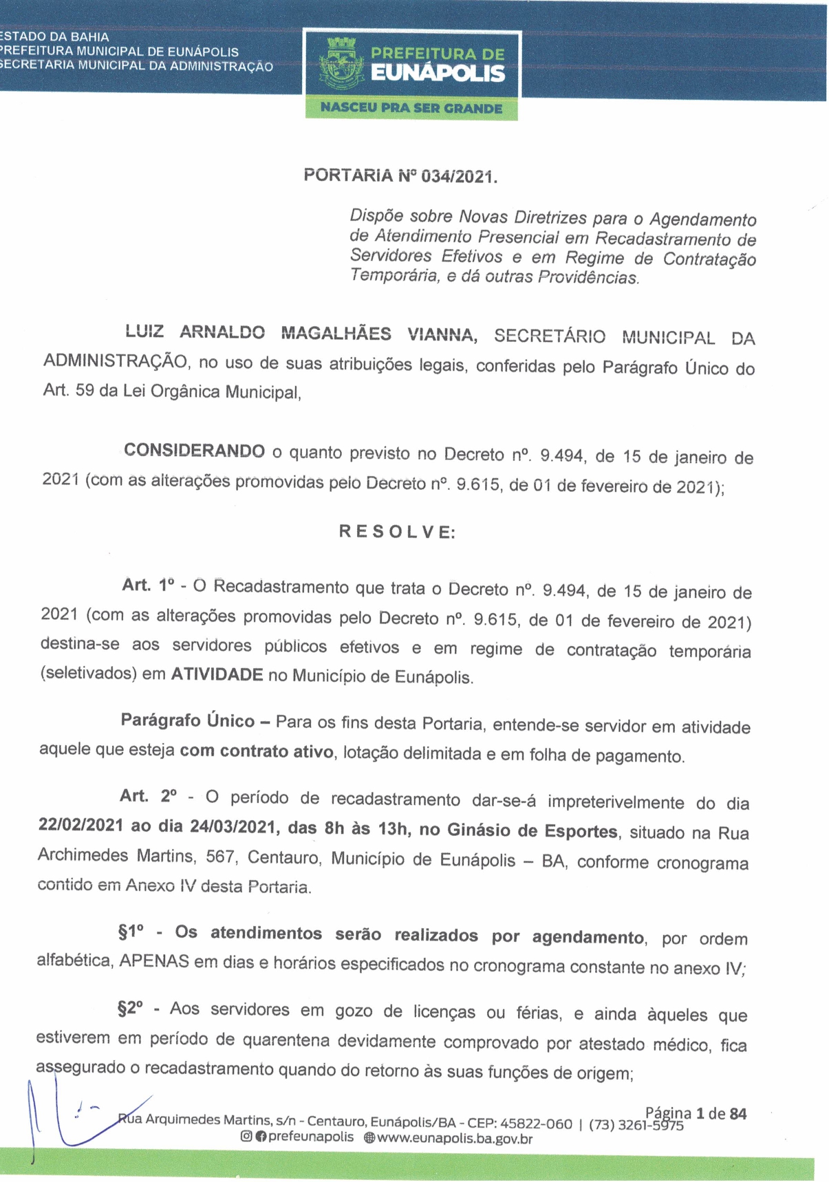 A Prefeitura de Eunápolis informa sobre o recadastramento dos colaboradores efetivos e os que estão em regime de contratação temporária (seletivados). O procedimento, inicialmente programado para o final de janeiro, foi suspenso e agora ocorrerá no período entre 22/02 e 24/03/2021, no horário das 08:00h às 13:00h, no Ginásio de Esportes, situado na Rua Archimedes Martins, 567, bairro Centauro. O atendimento dos servidores será realizado por meio de agendamento, em ordem alfabética, apenas nos dias e horários especificados no cronograma definido por meio da Portaria Nº. 034/2021, publicada hoje, 12, no Diário Oficial do município.