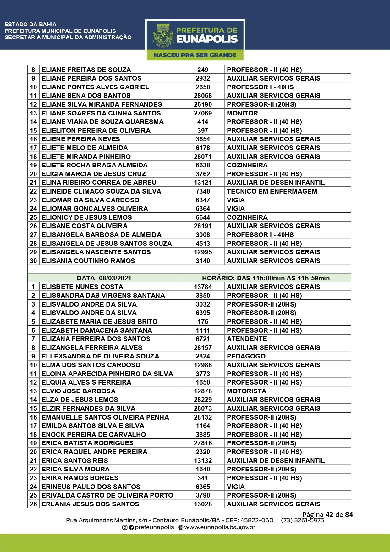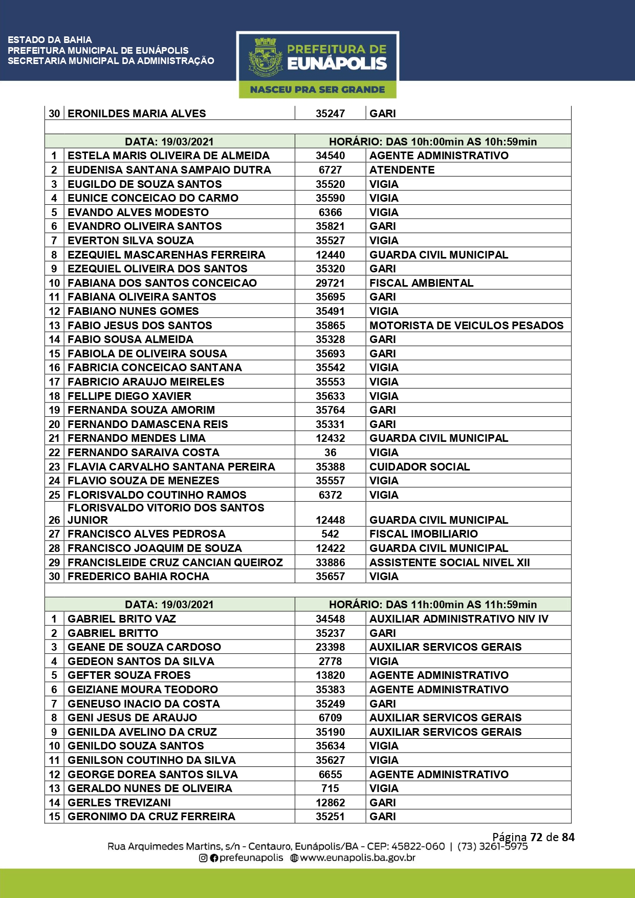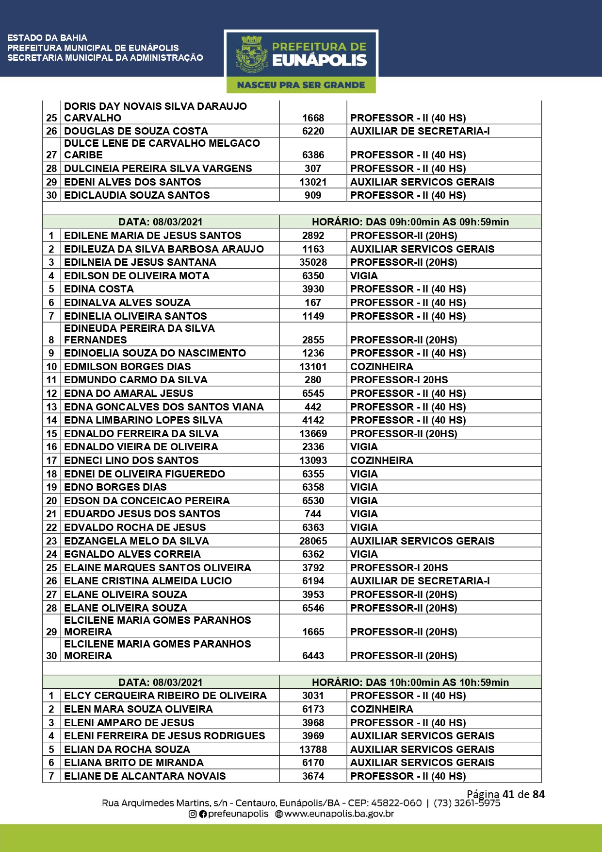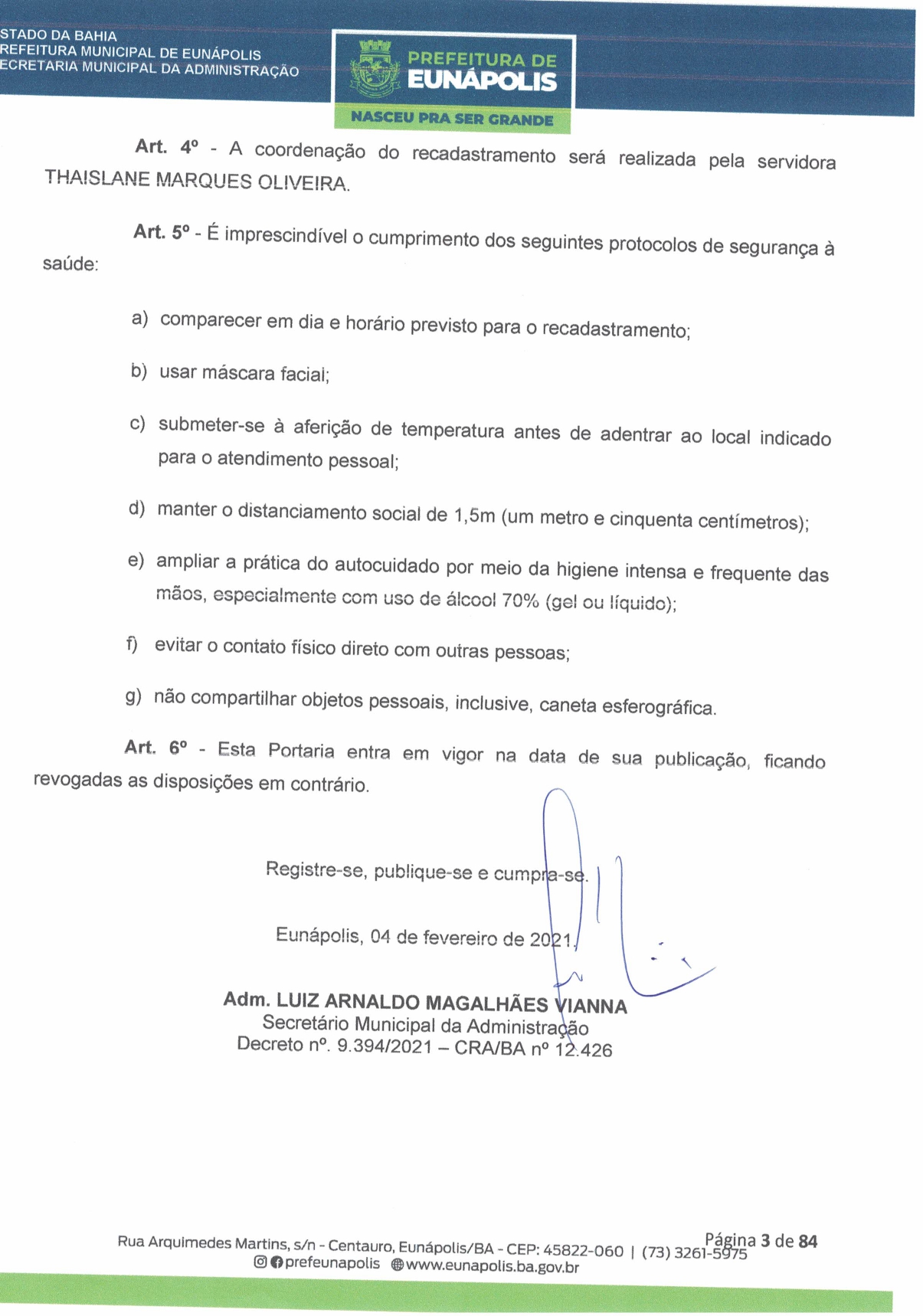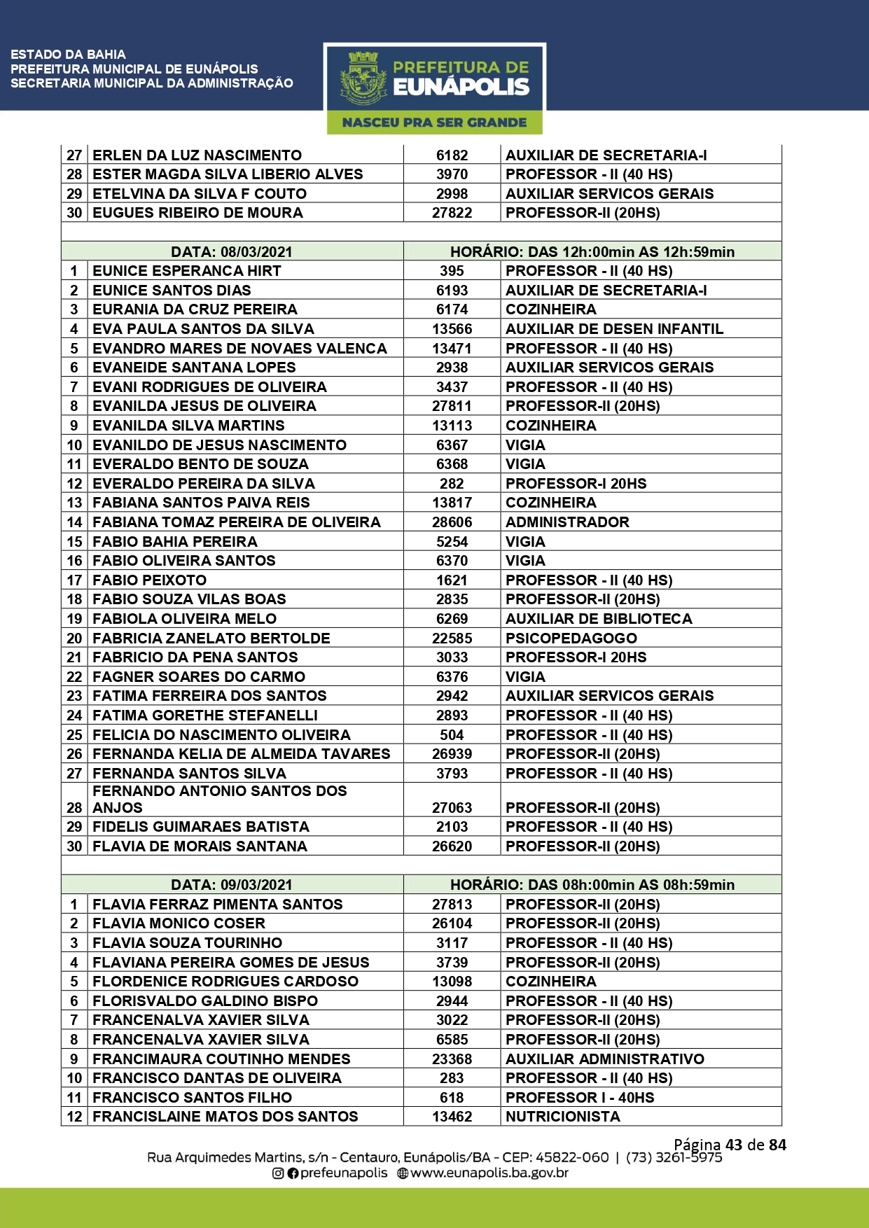A Prefeitura de Eunápolis informa sobre o recadastramento dos colaboradores efetivos e os que estão em regime de contratação temporária (seletivados). O procedimento, inicialmente programado para o final de janeiro, foi suspenso e agora ocorrerá no período entre 22/02 e 24/03/2021, no horário das 08:00h às 13:00h, no Ginásio de Esportes, situado na Rua Archimedes Martins, 567, bairro Centauro. O atendimento dos servidores será realizado por meio de agendamento, em ordem alfabética, apenas nos dias e horários especificados no cronograma definido por meio da Portaria Nº. 034/2021, publicada hoje, 12, no Diário Oficial do município.