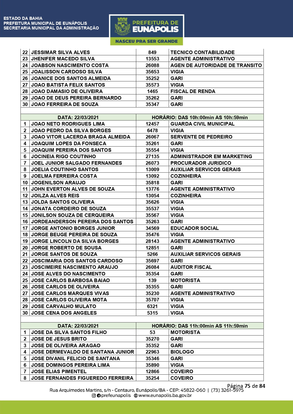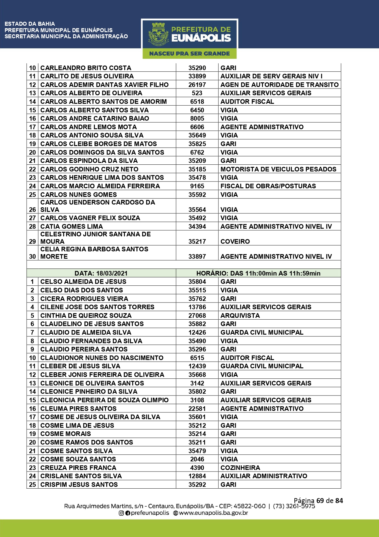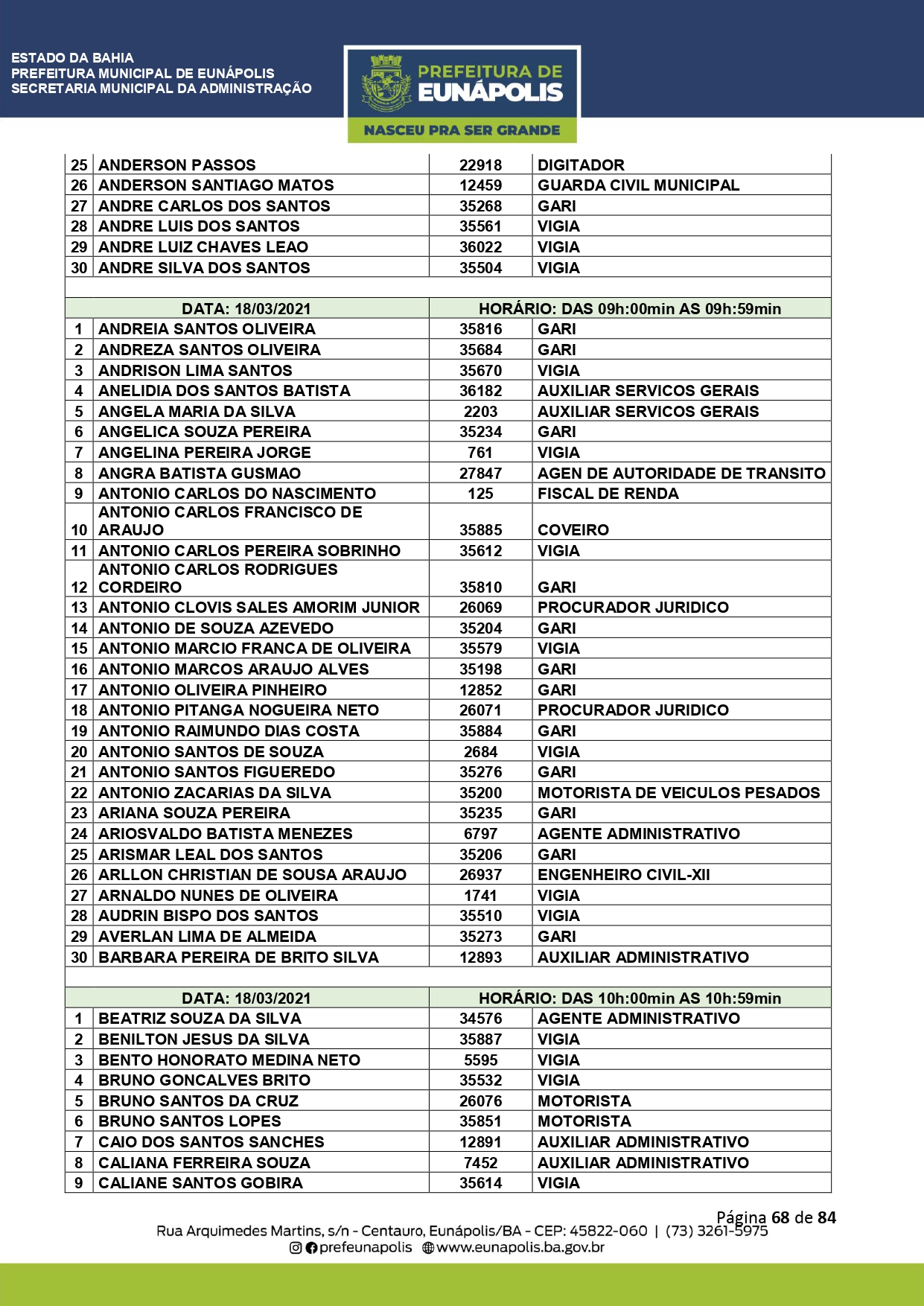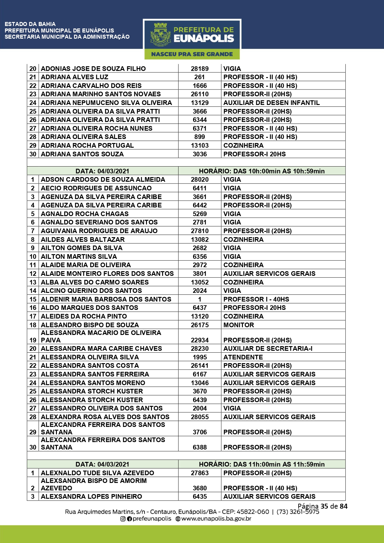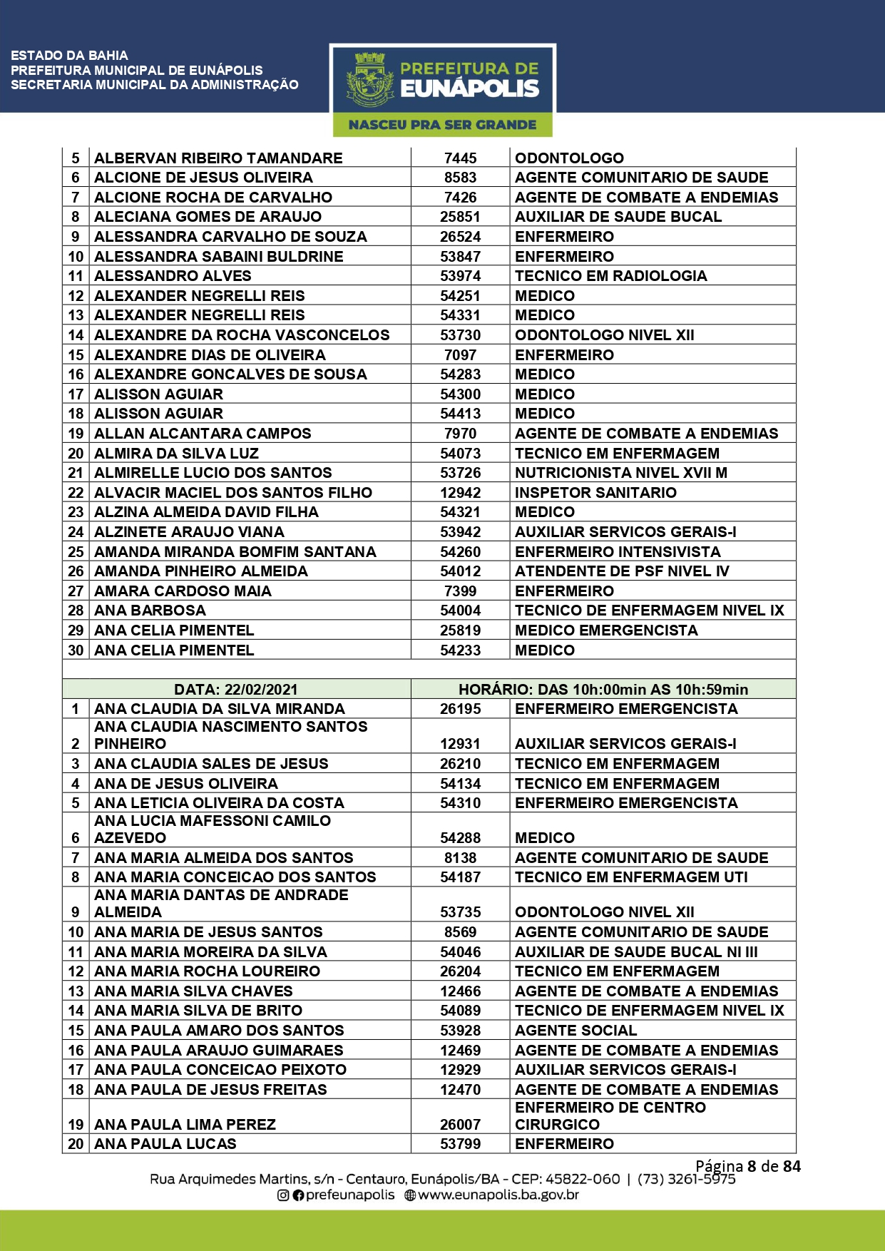 A Prefeitura de Eunápolis informa sobre o recadastramento dos colaboradores efetivos e os que estão em regime de contratação temporária (seletivados). O procedimento, inicialmente programado para o final de janeiro, foi suspenso e agora ocorrerá no período entre 22/02 e 24/03/2021, no horário das 08:00h às 13:00h, no Ginásio de Esportes, situado na Rua Archimedes Martins, 567, bairro Centauro. O atendimento dos servidores será realizado por meio de agendamento, em ordem alfabética, apenas nos dias e horários especificados no cronograma definido por meio da Portaria Nº. 034/2021, publicada hoje, 12, no Diário Oficial do município.