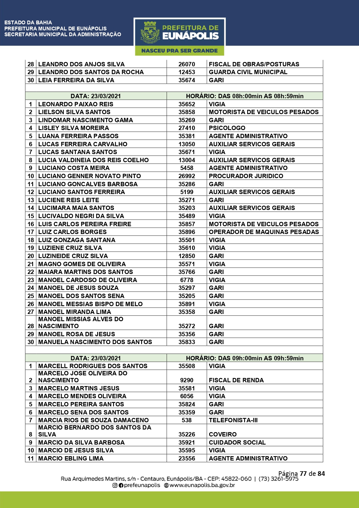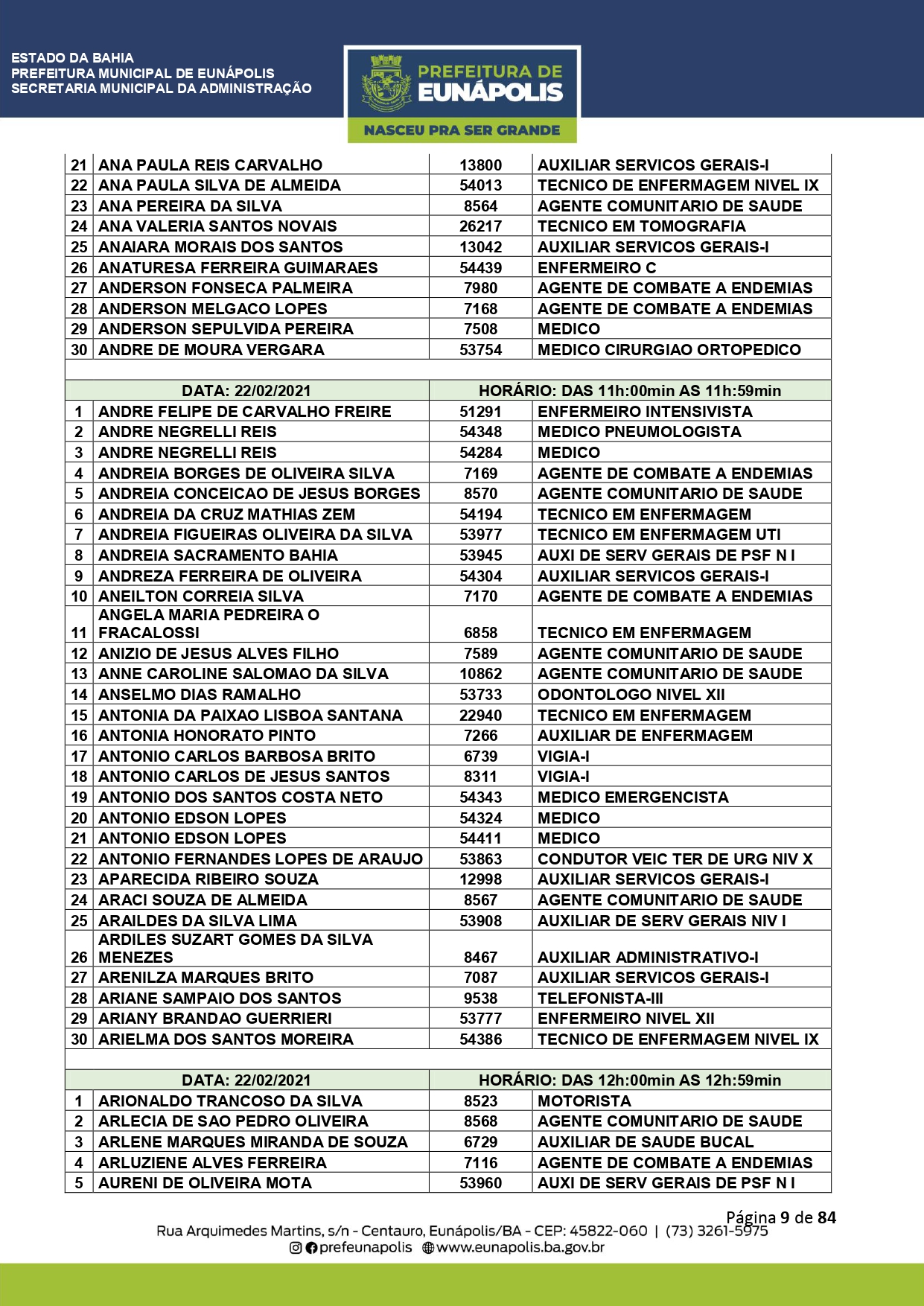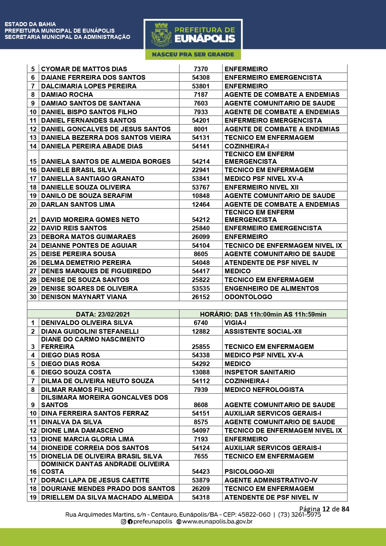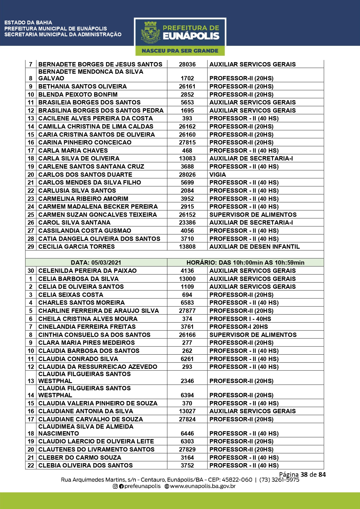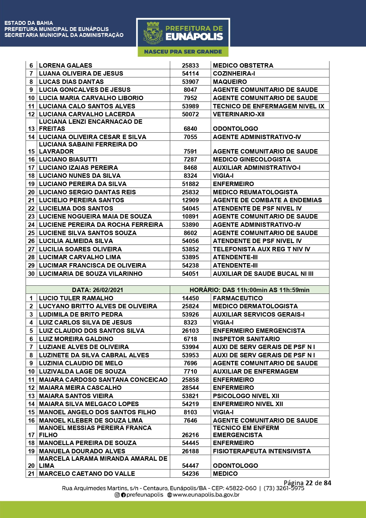 A Prefeitura de Eunápolis informa sobre o recadastramento dos colaboradores efetivos e os que estão em regime de contratação temporária (seletivados). O procedimento, inicialmente programado para o final de janeiro, foi suspenso e agora ocorrerá no período entre 22/02 e 24/03/2021, no horário das 08:00h às 13:00h, no Ginásio de Esportes, situado na Rua Archimedes Martins, 567, bairro Centauro. O atendimento dos servidores será realizado por meio de agendamento, em ordem alfabética, apenas nos dias e horários especificados no cronograma definido por meio da Portaria Nº. 034/2021, publicada hoje, 12, no Diário Oficial do município.