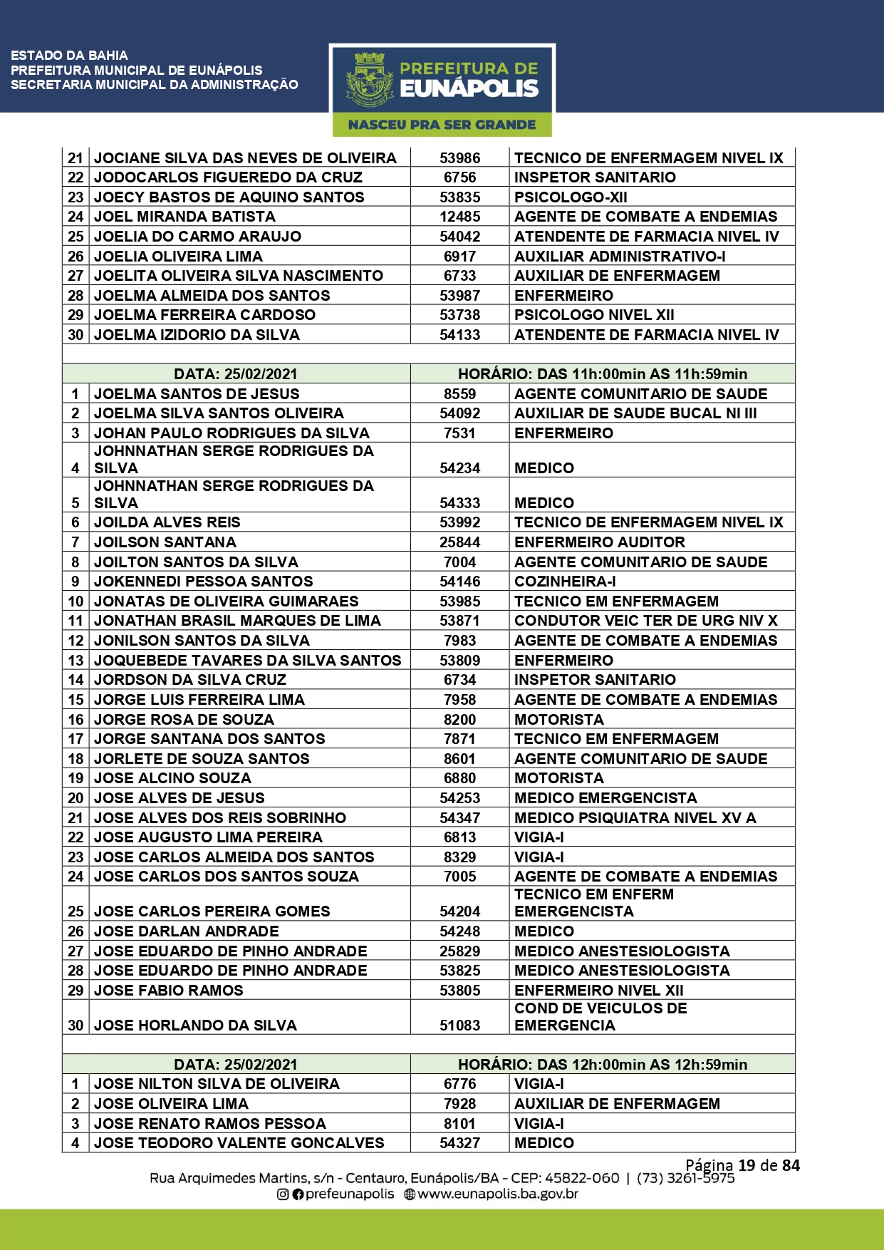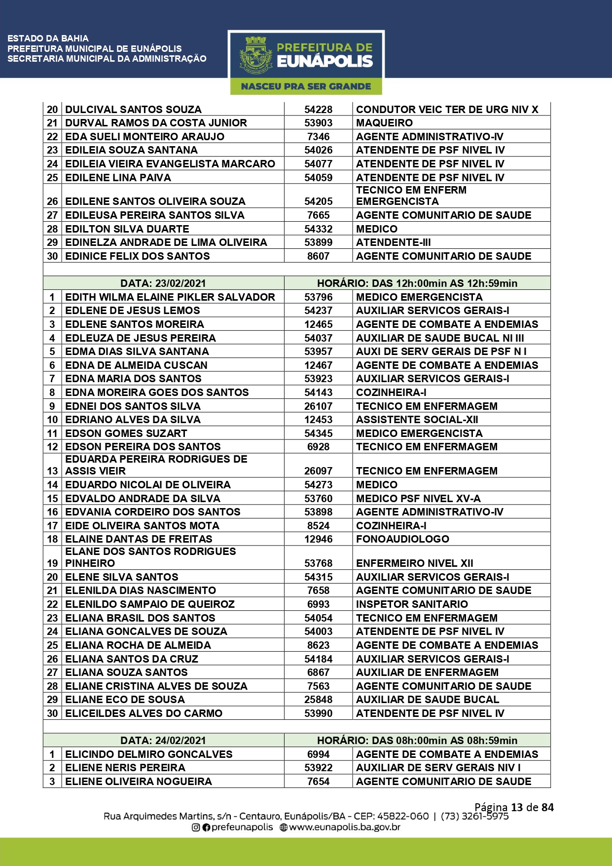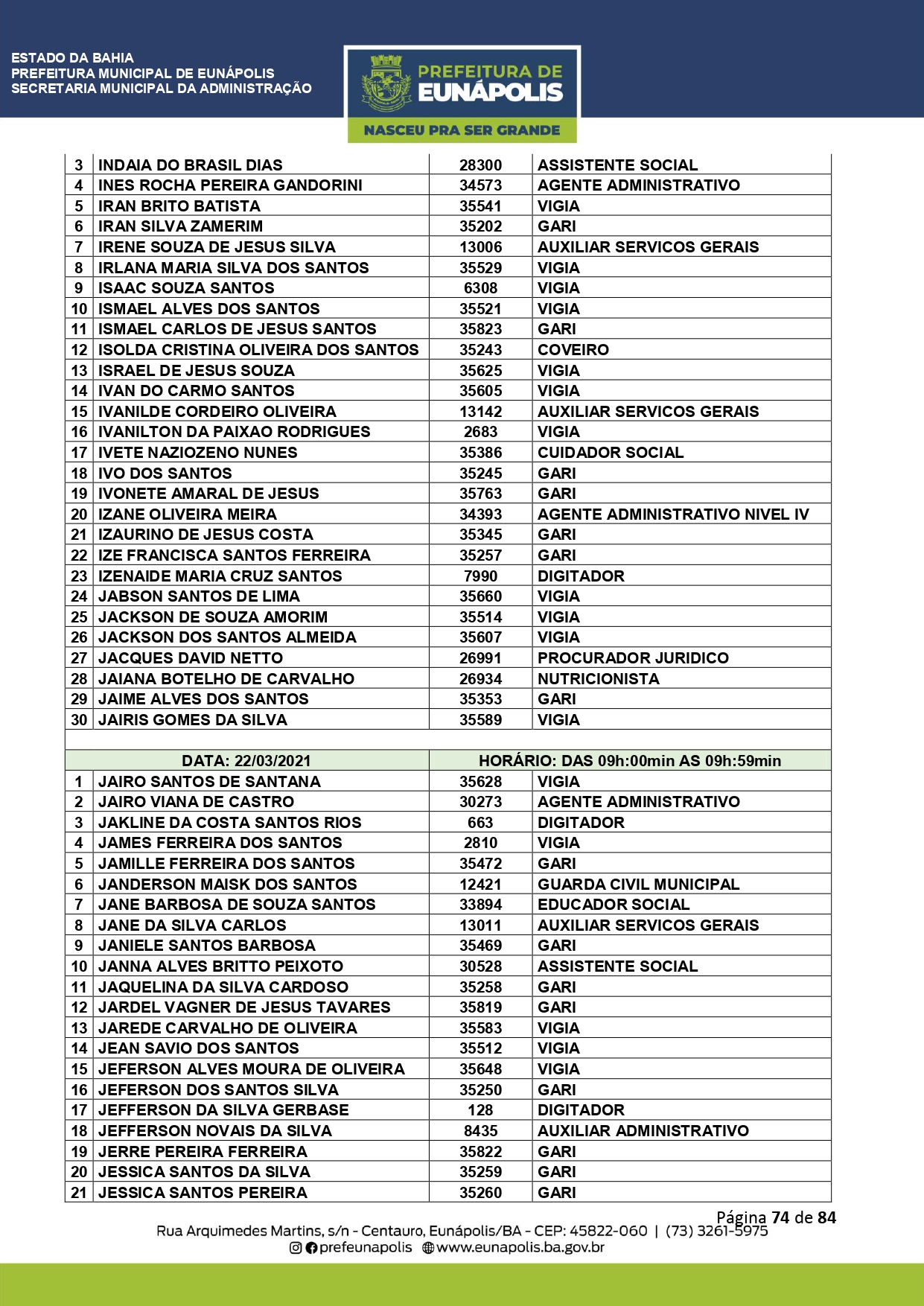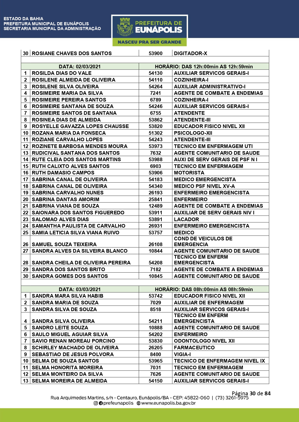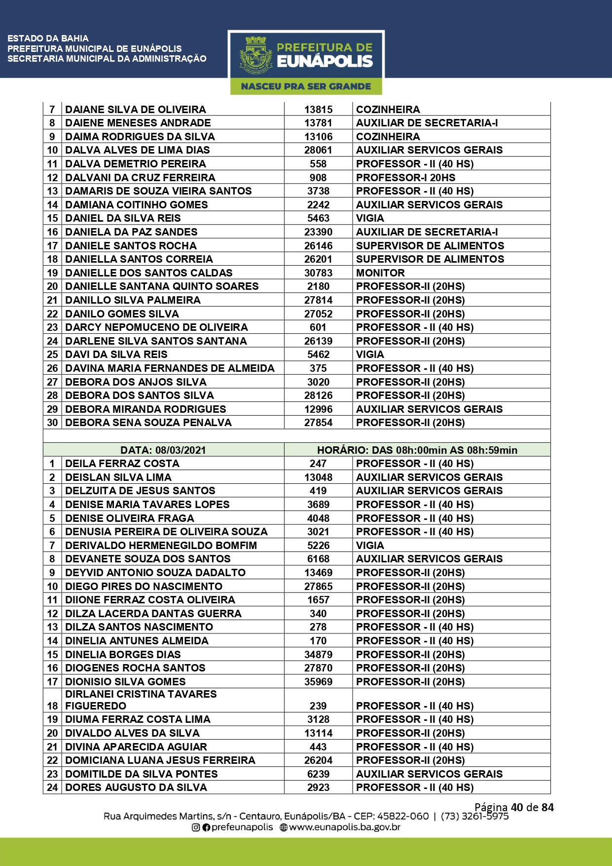 A Prefeitura de Eunápolis informa sobre o recadastramento dos colaboradores efetivos e os que estão em regime de contratação temporária (seletivados). O procedimento, inicialmente programado para o final de janeiro, foi suspenso e agora ocorrerá no período entre 22/02 e 24/03/2021, no horário das 08:00h às 13:00h, no Ginásio de Esportes, situado na Rua Archimedes Martins, 567, bairro Centauro. O atendimento dos servidores será realizado por meio de agendamento, em ordem alfabética, apenas nos dias e horários especificados no cronograma definido por meio da Portaria Nº. 034/2021, publicada hoje, 12, no Diário Oficial do município.