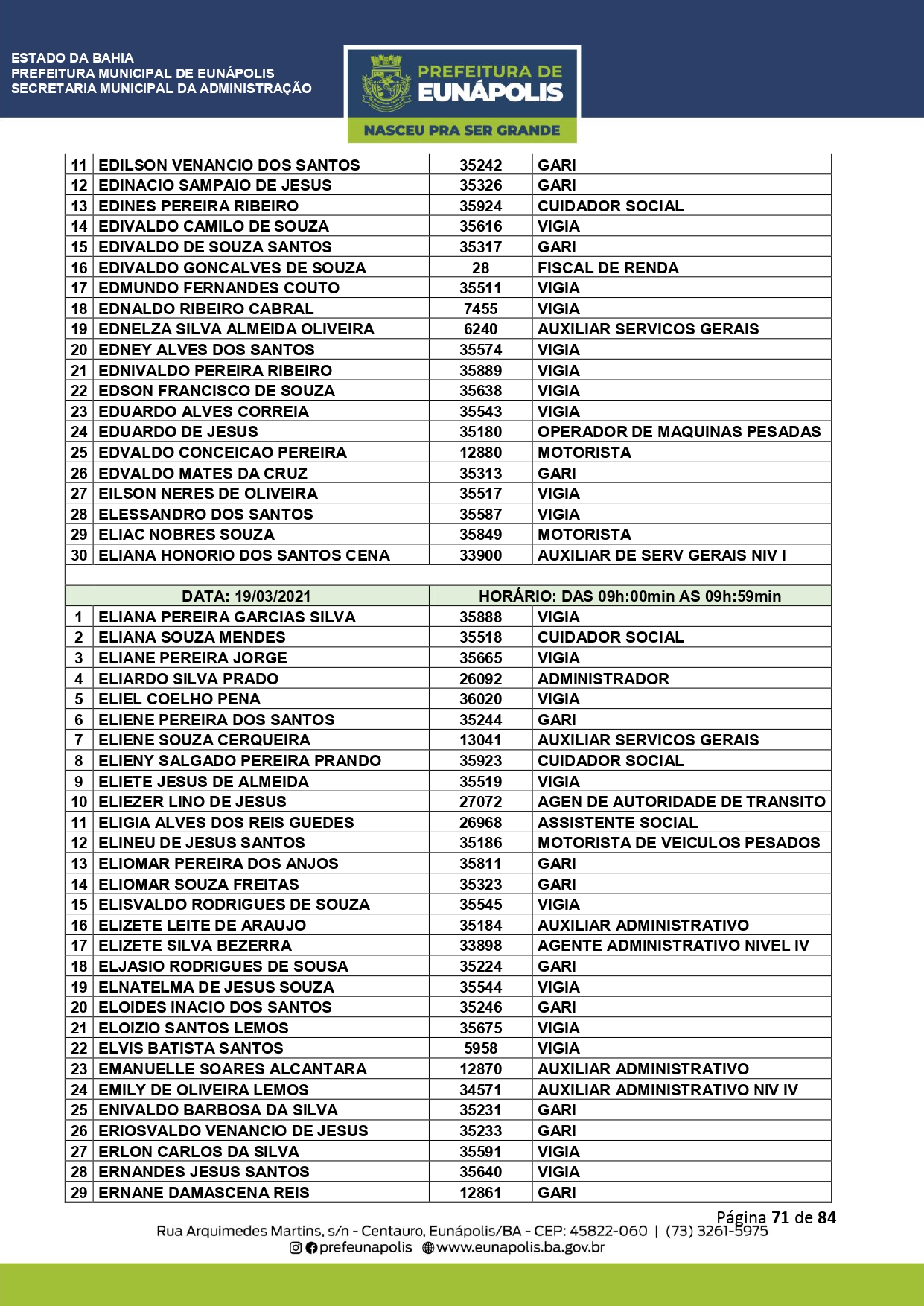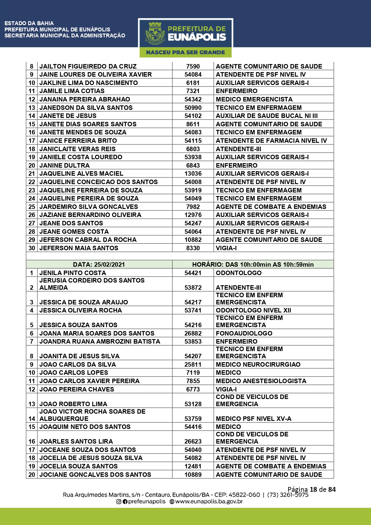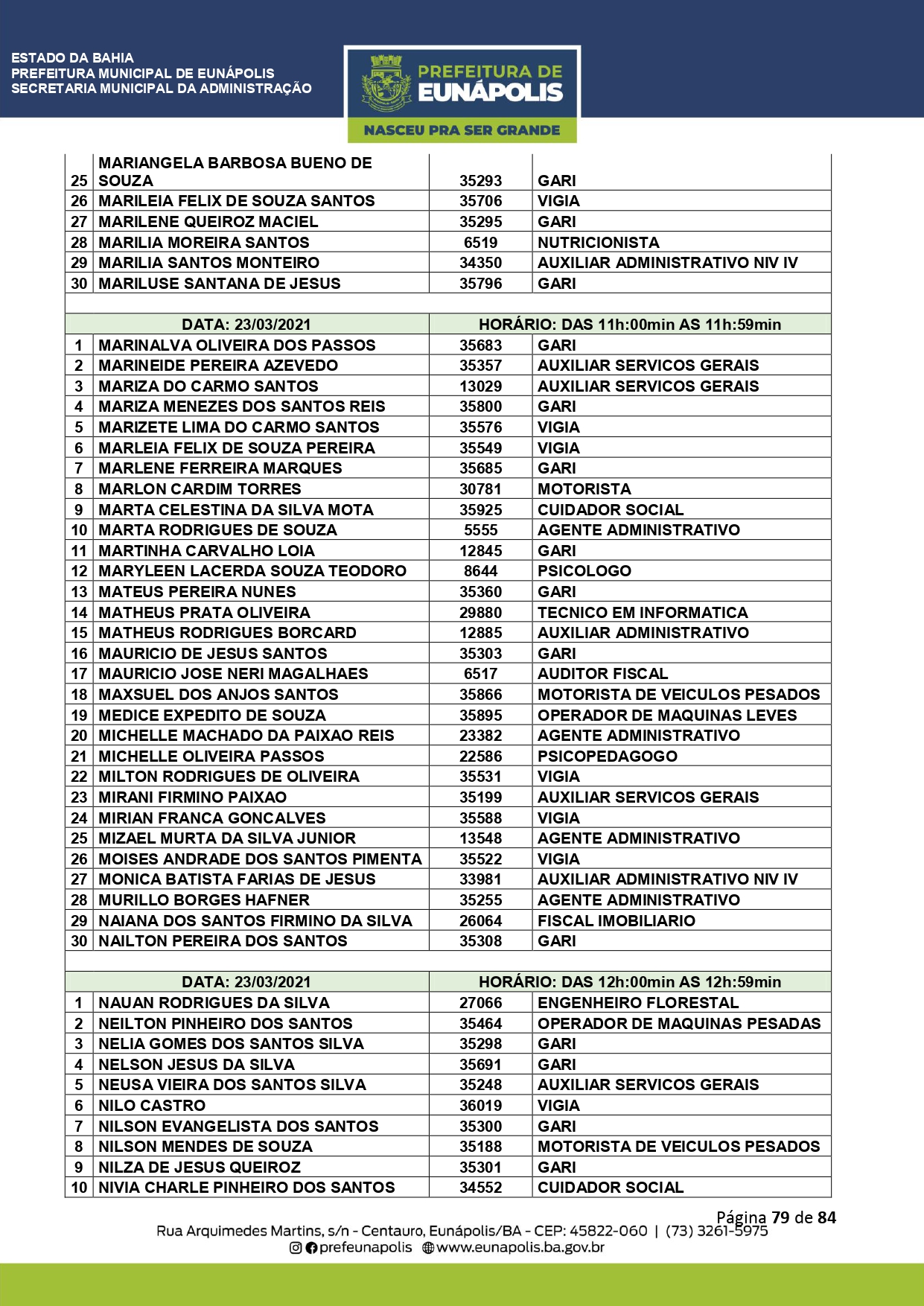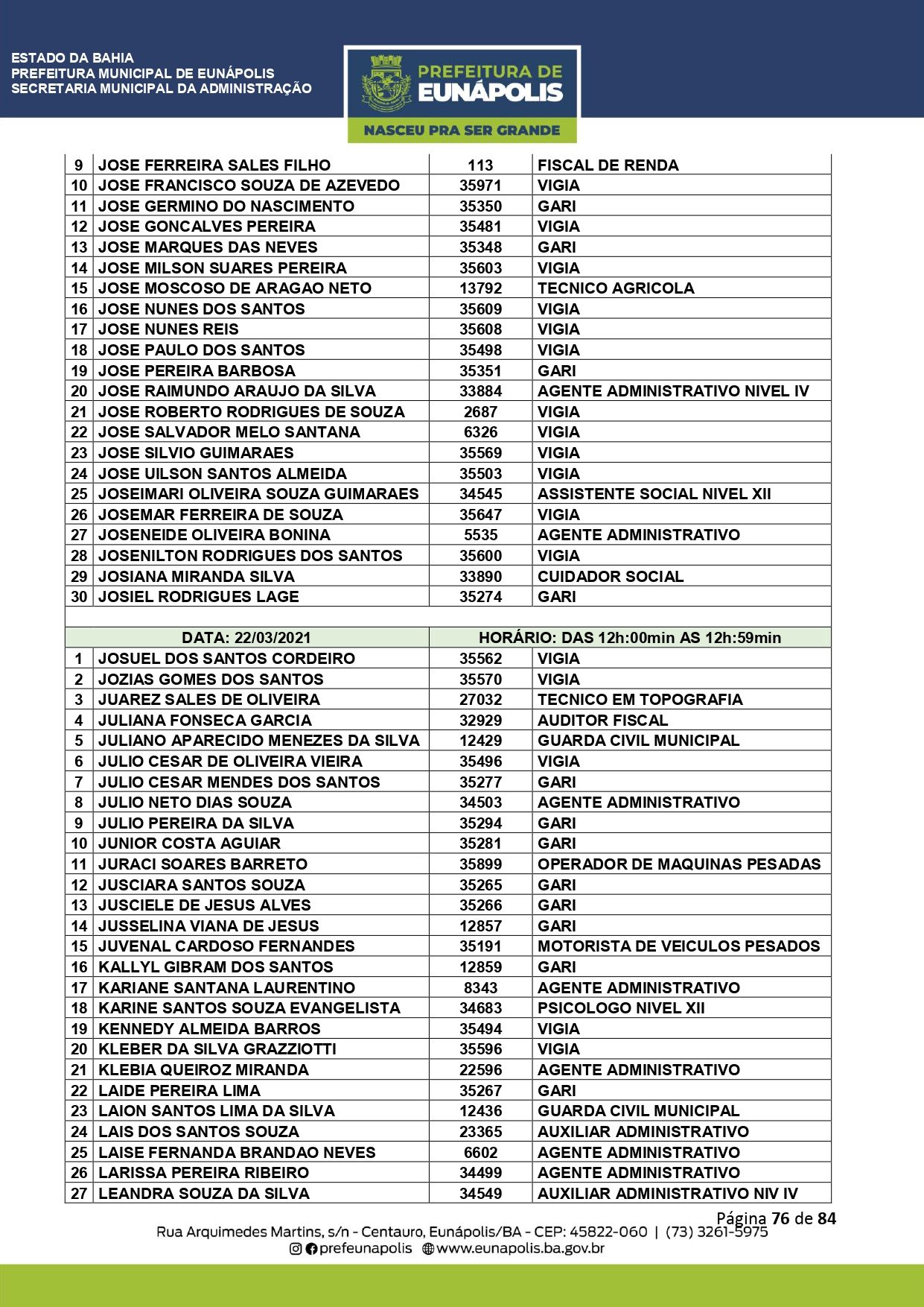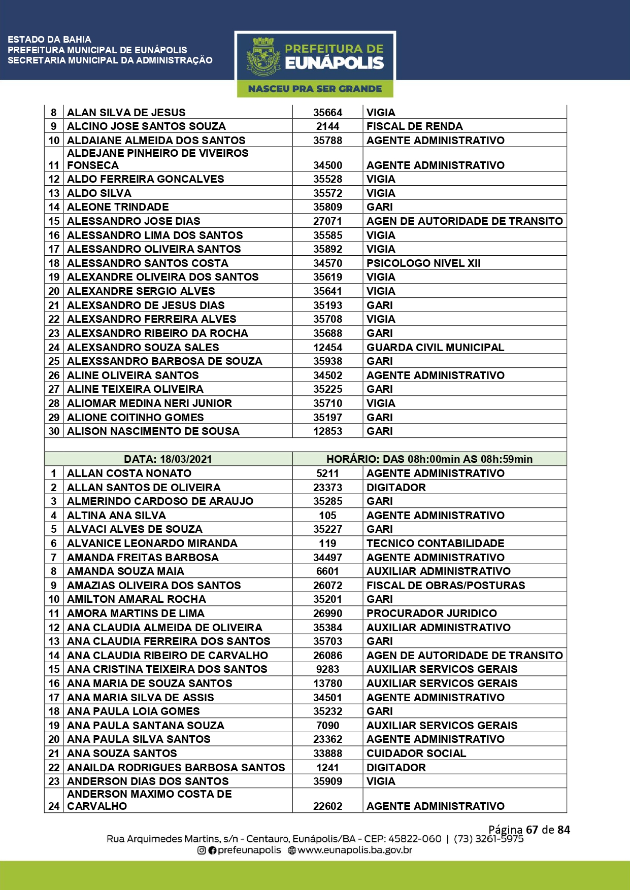 A Prefeitura de Eunápolis informa sobre o recadastramento dos colaboradores efetivos e os que estão em regime de contratação temporária (seletivados). O procedimento, inicialmente programado para o final de janeiro, foi suspenso e agora ocorrerá no período entre 22/02 e 24/03/2021, no horário das 08:00h às 13:00h, no Ginásio de Esportes, situado na Rua Archimedes Martins, 567, bairro Centauro. O atendimento dos servidores será realizado por meio de agendamento, em ordem alfabética, apenas nos dias e horários especificados no cronograma definido por meio da Portaria Nº. 034/2021, publicada hoje, 12, no Diário Oficial do município.