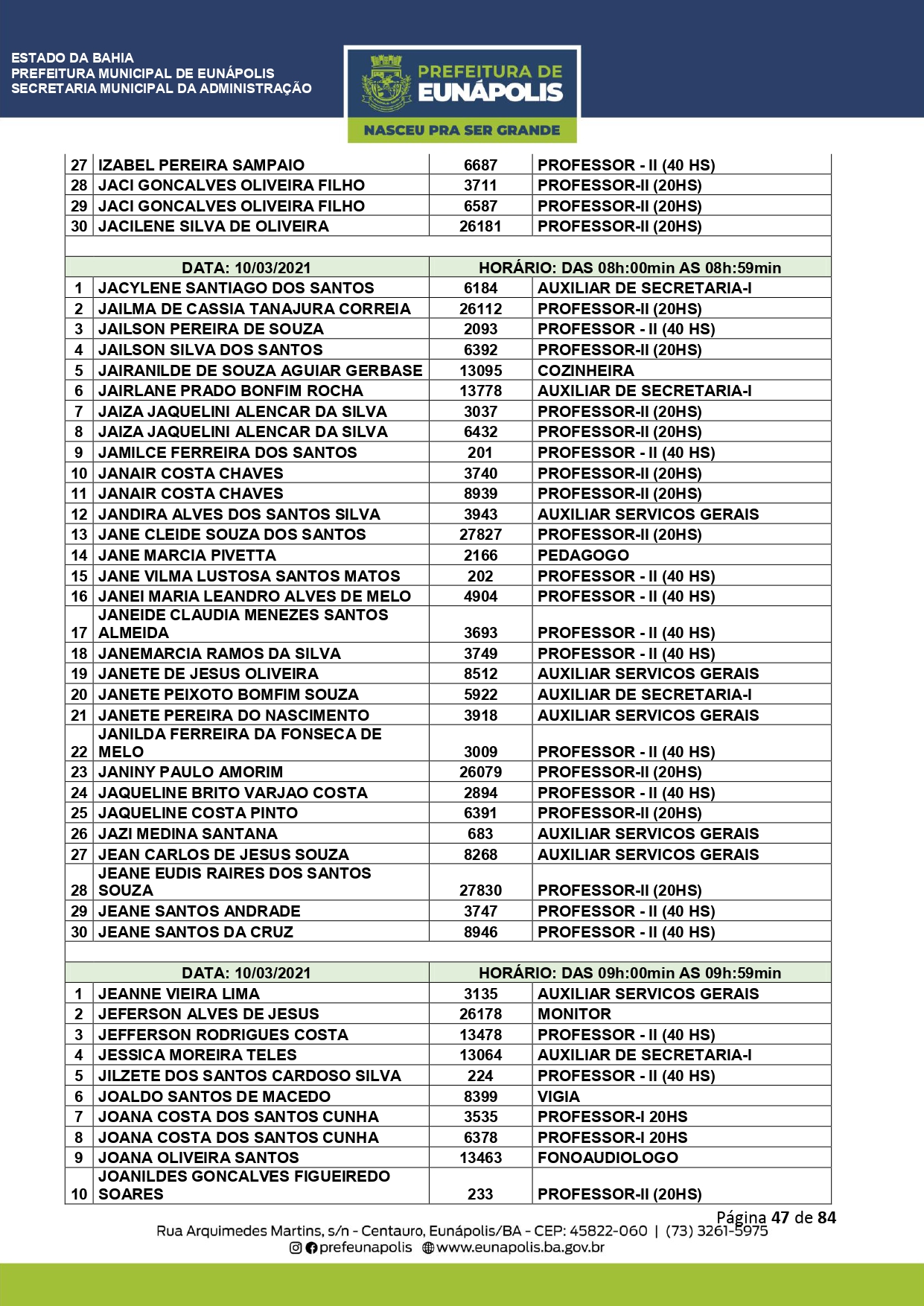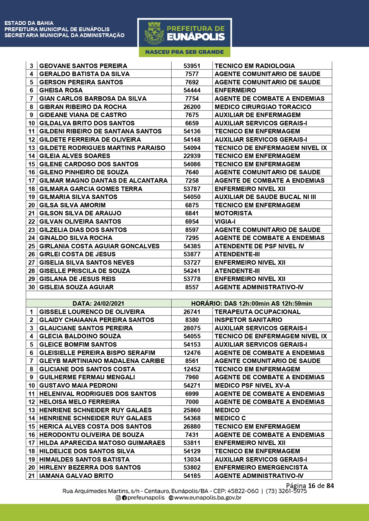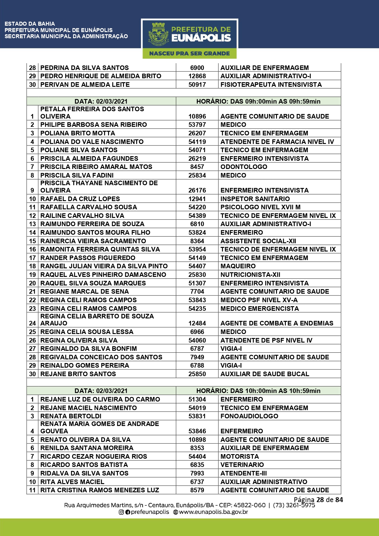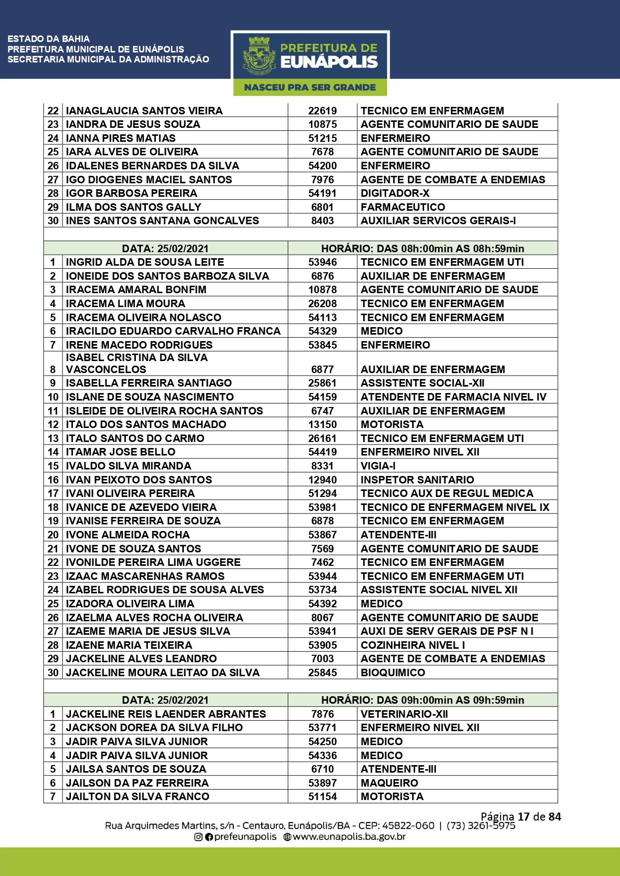 A Prefeitura de Eunápolis informa sobre o recadastramento dos colaboradores efetivos e os que estão em regime de contratação temporária (seletivados). O procedimento, inicialmente programado para o final de janeiro, foi suspenso e agora ocorrerá no período entre 22/02 e 24/03/2021, no horário das 08:00h às 13:00h, no Ginásio de Esportes, situado na Rua Archimedes Martins, 567, bairro Centauro. O atendimento dos servidores será realizado por meio de agendamento, em ordem alfabética, apenas nos dias e horários especificados no cronograma definido por meio da Portaria Nº. 034/2021, publicada hoje, 12, no Diário Oficial do município.
