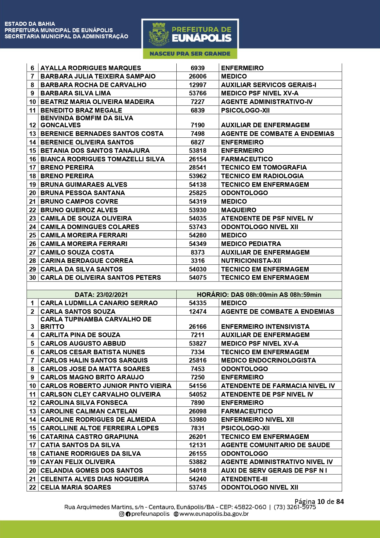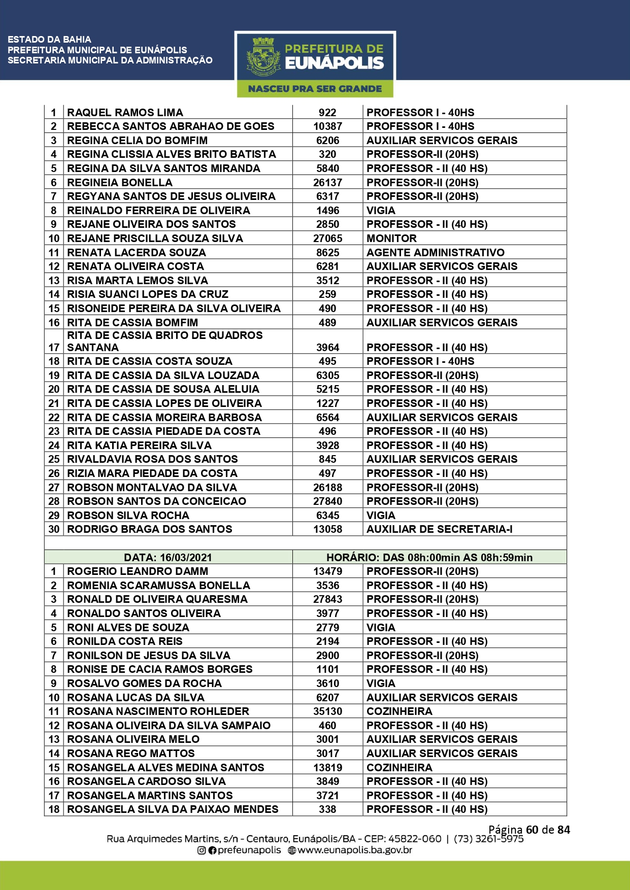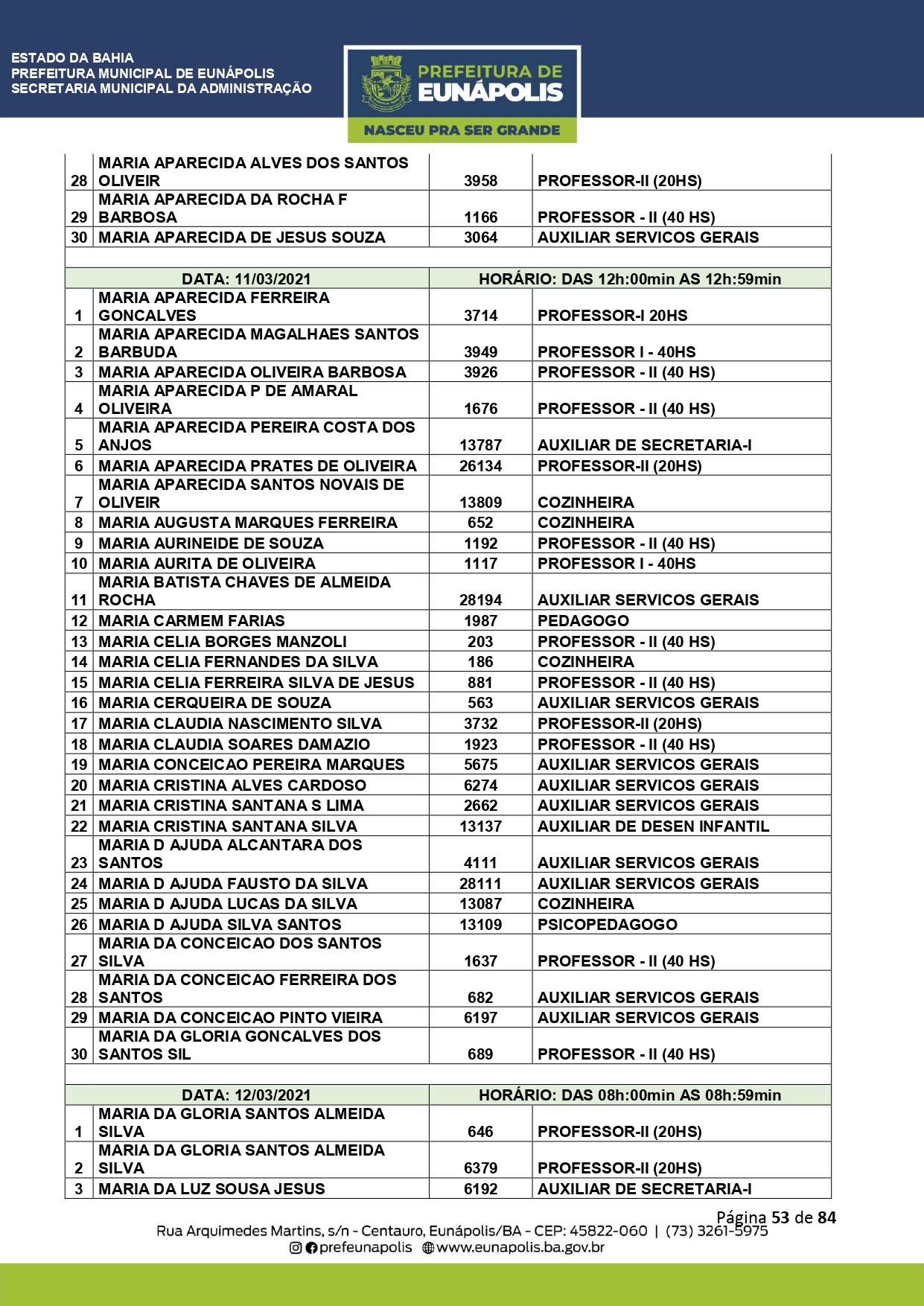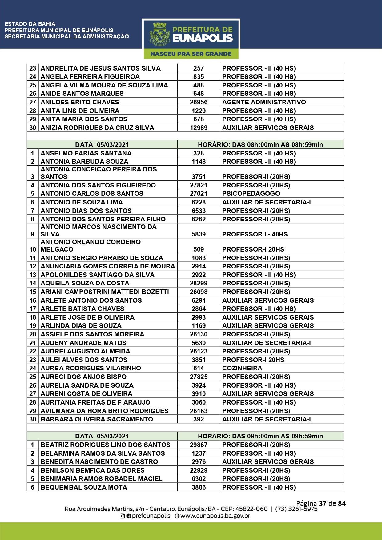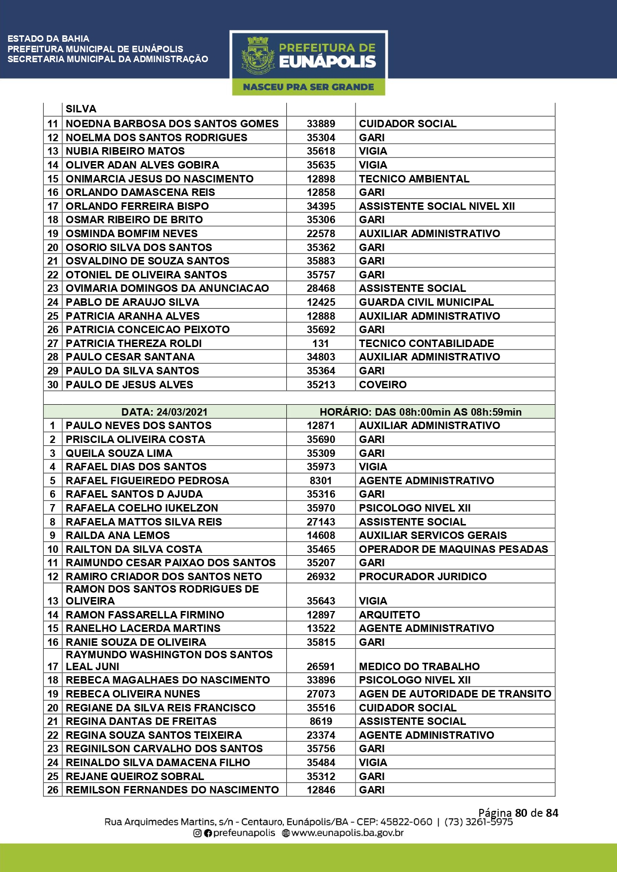 A Prefeitura de Eunápolis informa sobre o recadastramento dos colaboradores efetivos e os que estão em regime de contratação temporária (seletivados). O procedimento, inicialmente programado para o final de janeiro, foi suspenso e agora ocorrerá no período entre 22/02 e 24/03/2021, no horário das 08:00h às 13:00h, no Ginásio de Esportes, situado na Rua Archimedes Martins, 567, bairro Centauro. O atendimento dos servidores será realizado por meio de agendamento, em ordem alfabética, apenas nos dias e horários especificados no cronograma definido por meio da Portaria Nº. 034/2021, publicada hoje, 12, no Diário Oficial do município.