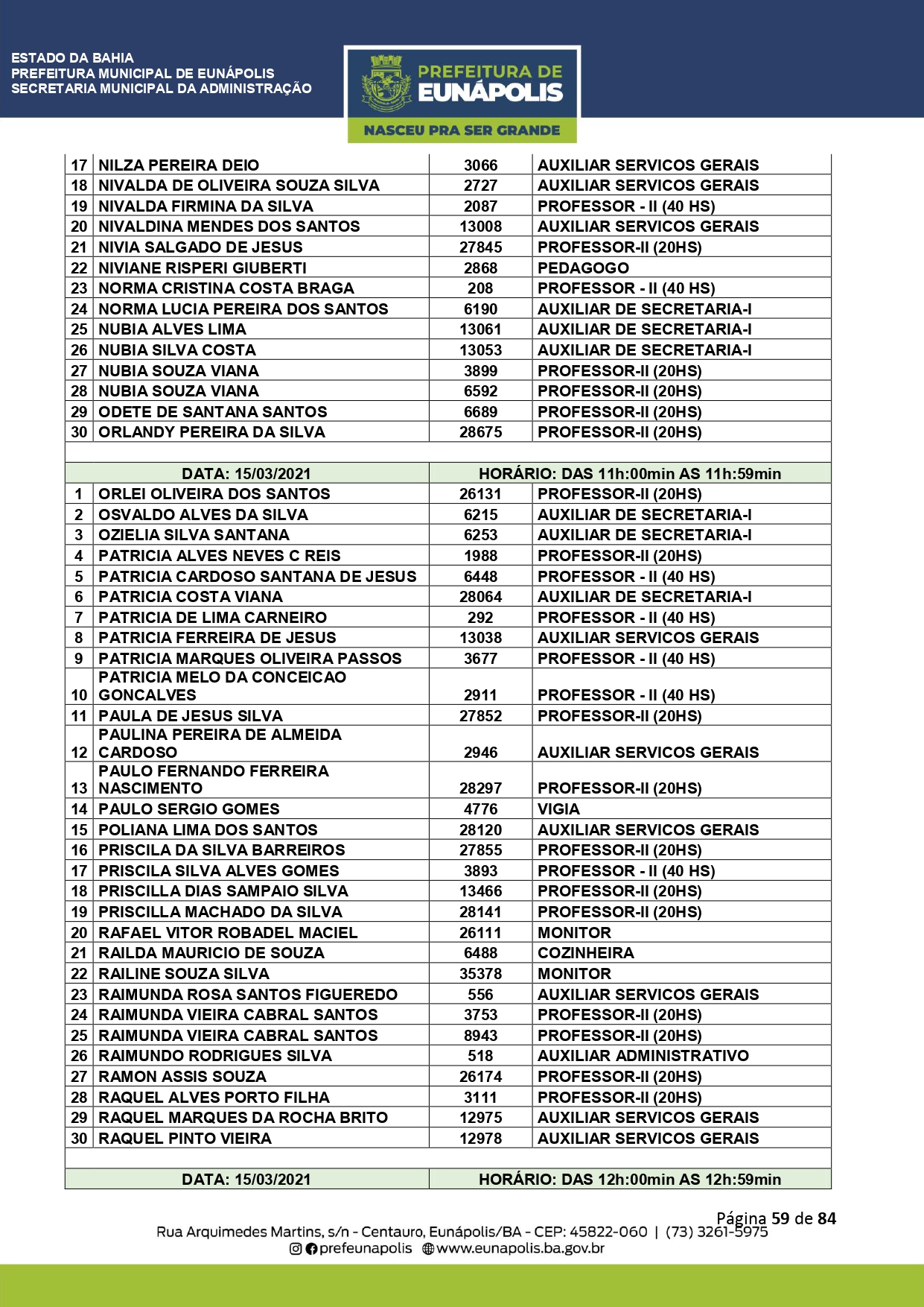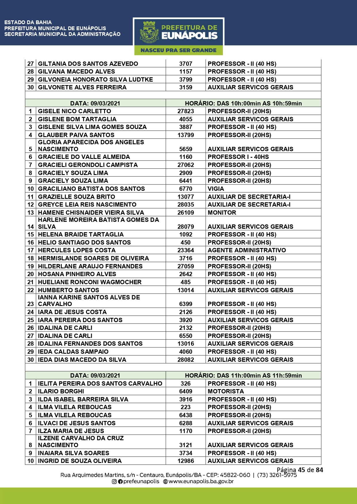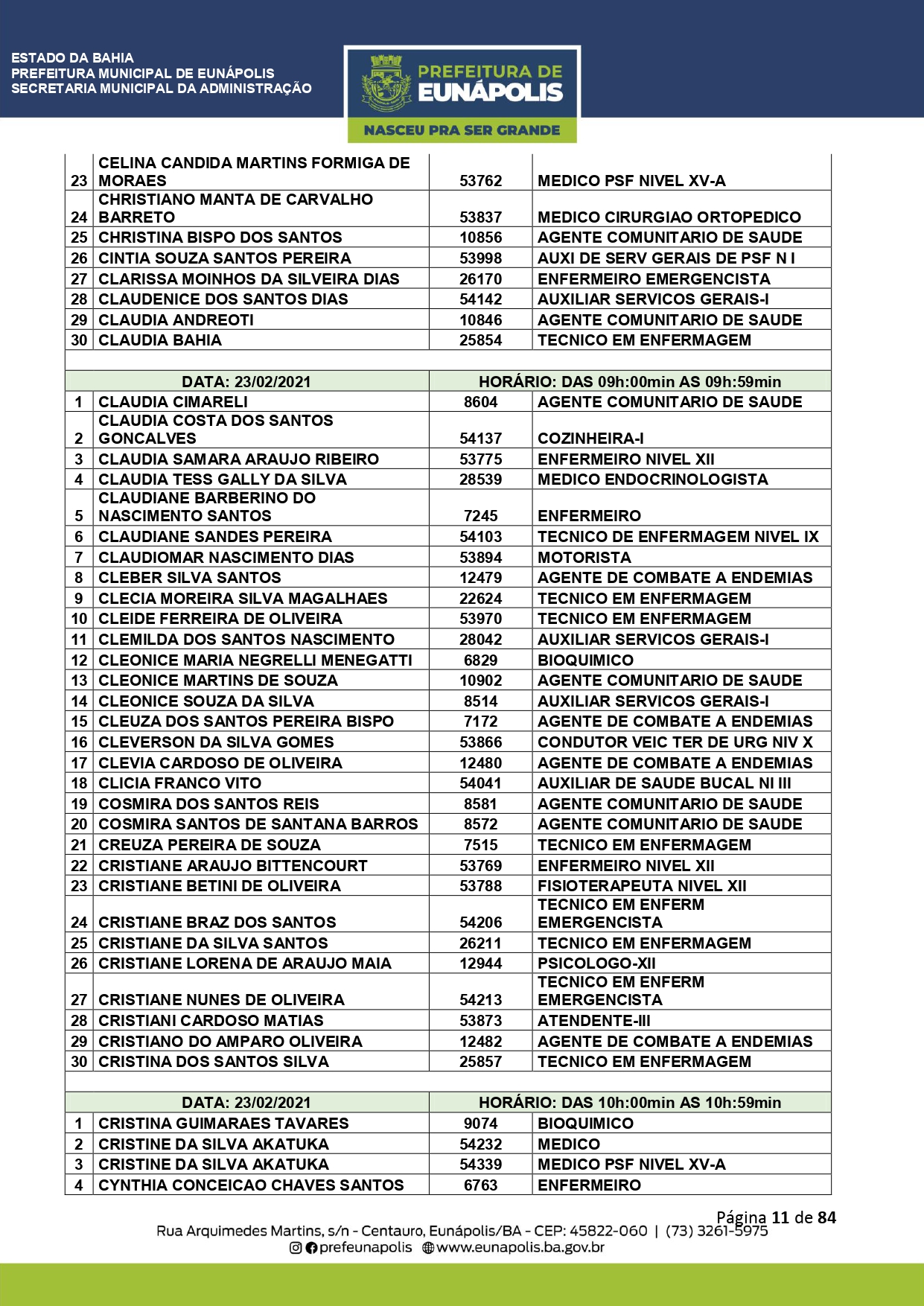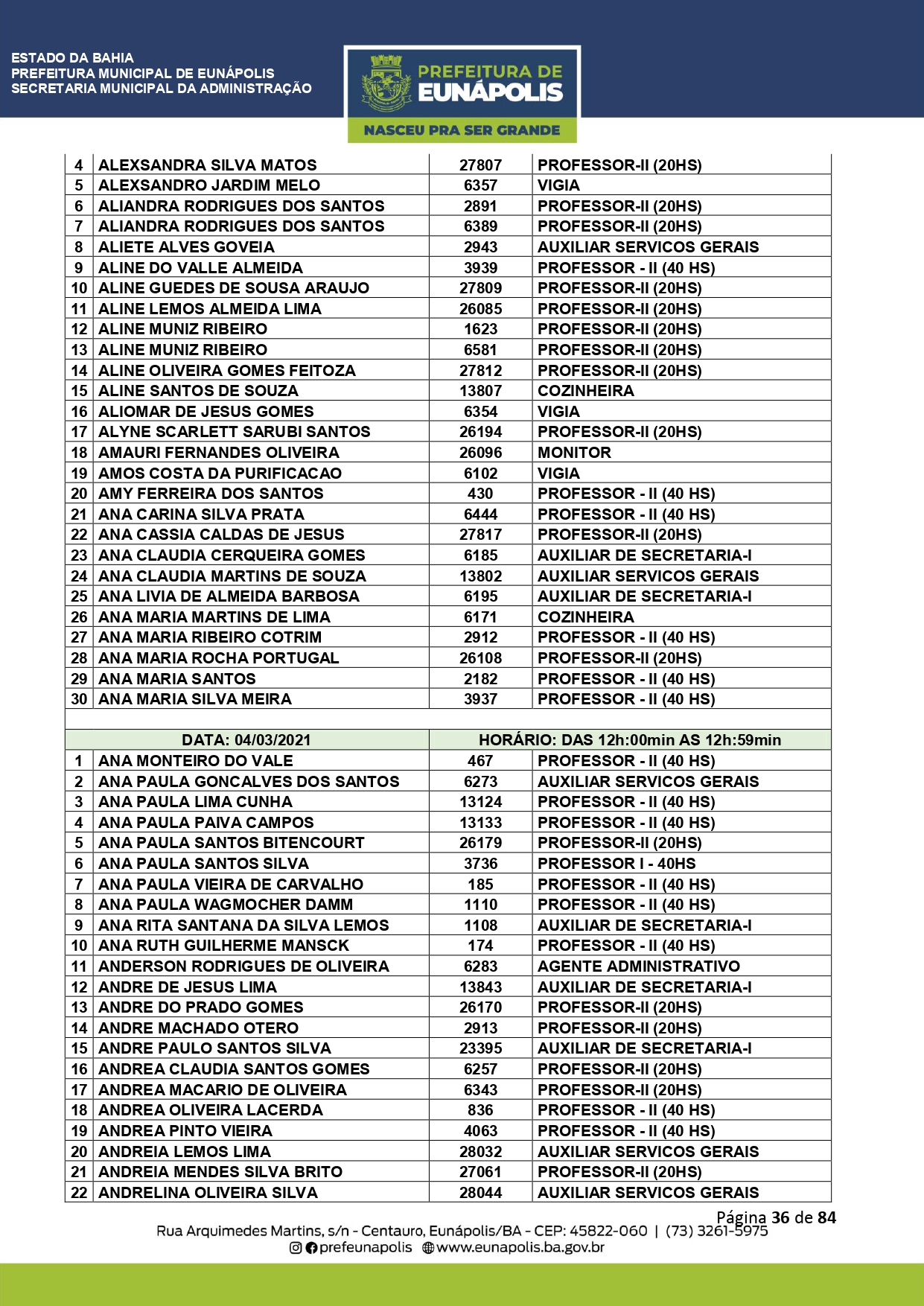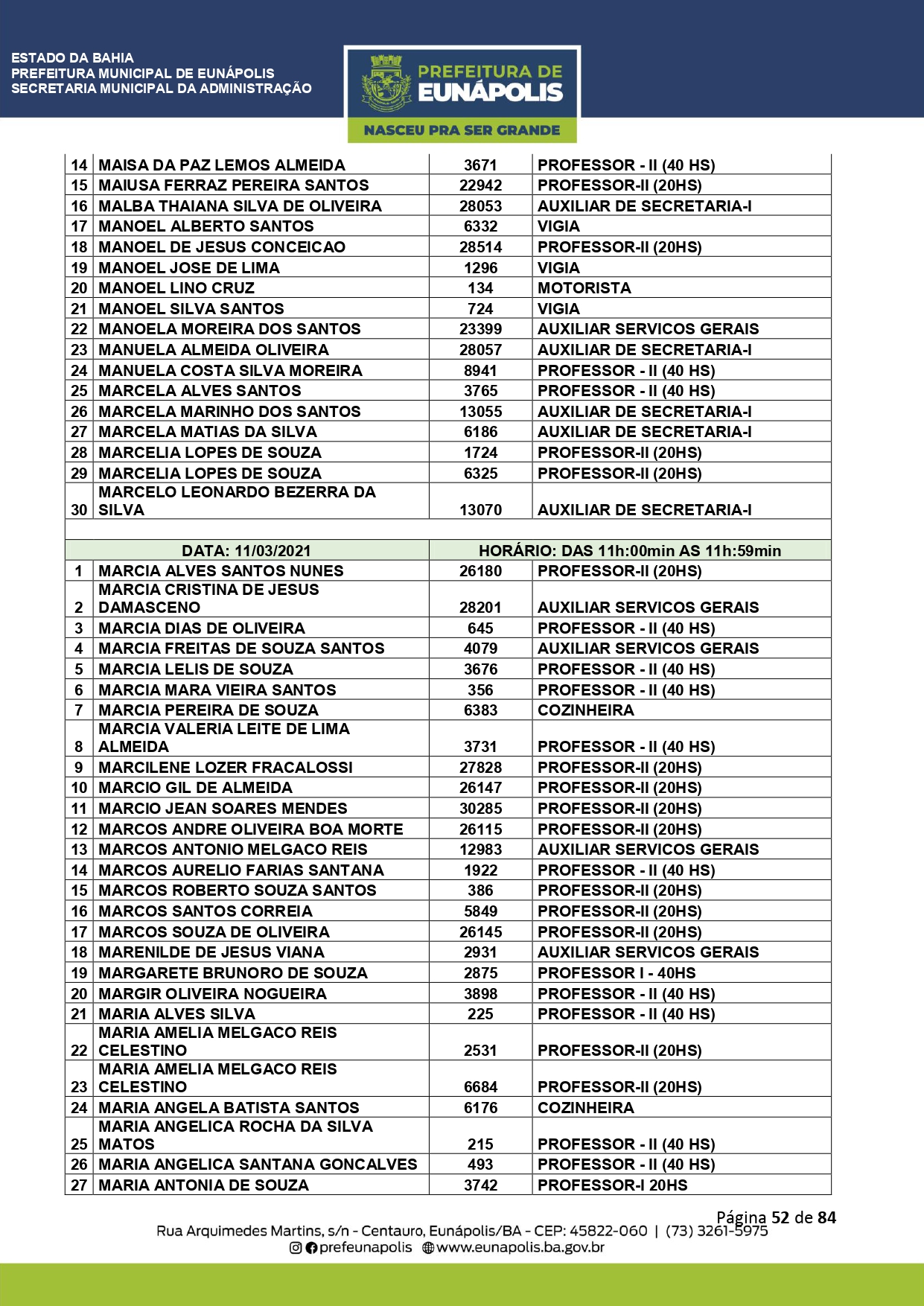A Prefeitura de Eunápolis informa sobre o recadastramento dos colaboradores efetivos e os que estão em regime de contratação temporária (seletivados). O procedimento, inicialmente programado para o final de janeiro, foi suspenso e agora ocorrerá no período entre 22/02 e 24/03/2021, no horário das 08:00h às 13:00h, no Ginásio de Esportes, situado na Rua Archimedes Martins, 567, bairro Centauro. O atendimento dos servidores será realizado por meio de agendamento, em ordem alfabética, apenas nos dias e horários especificados no cronograma definido por meio da Portaria Nº. 034/2021, publicada hoje, 12, no Diário Oficial do município.