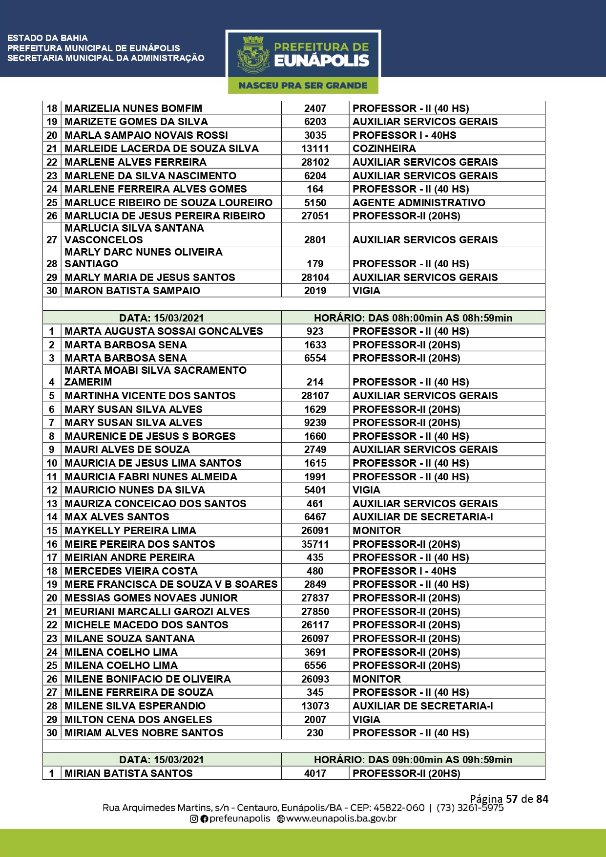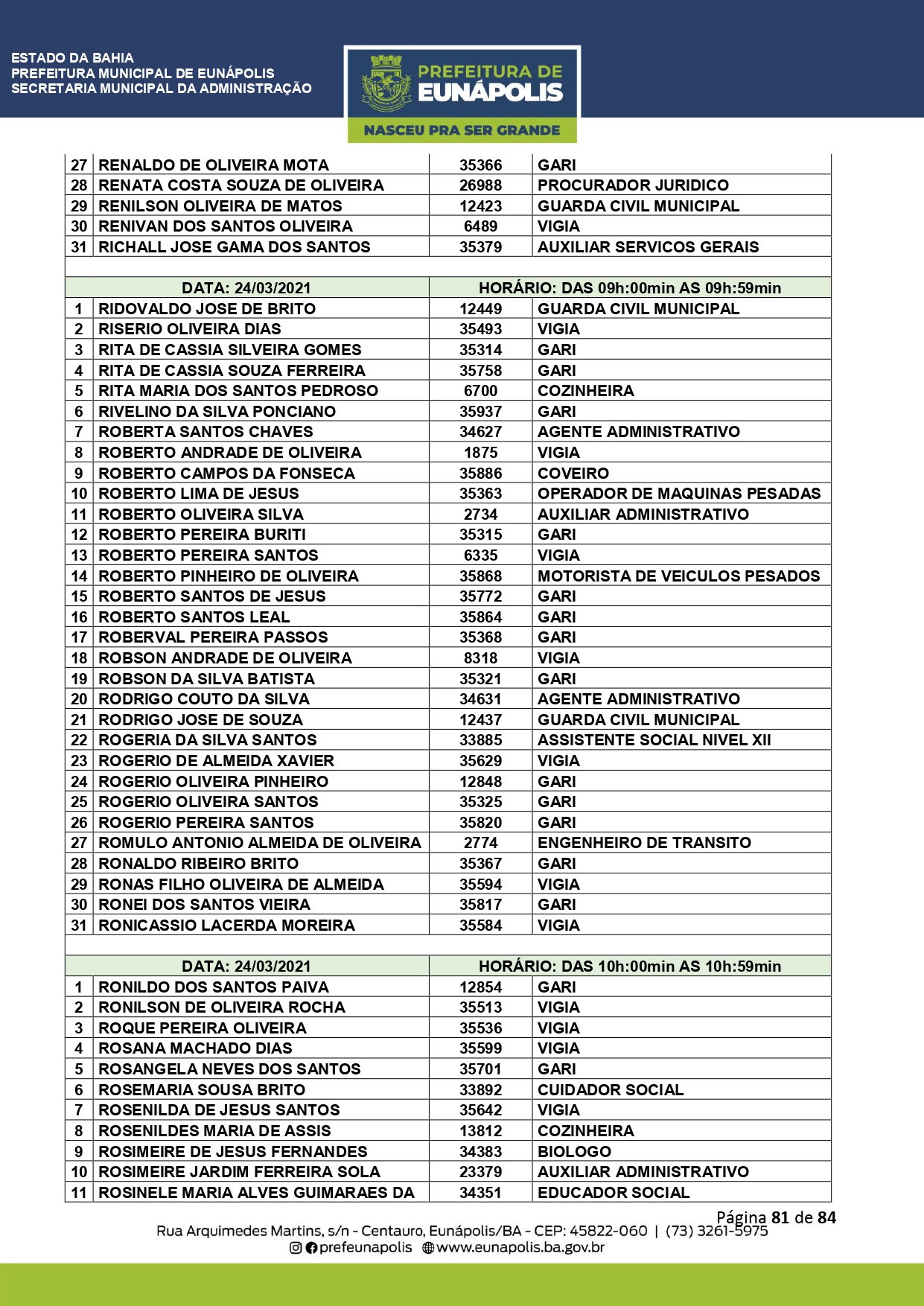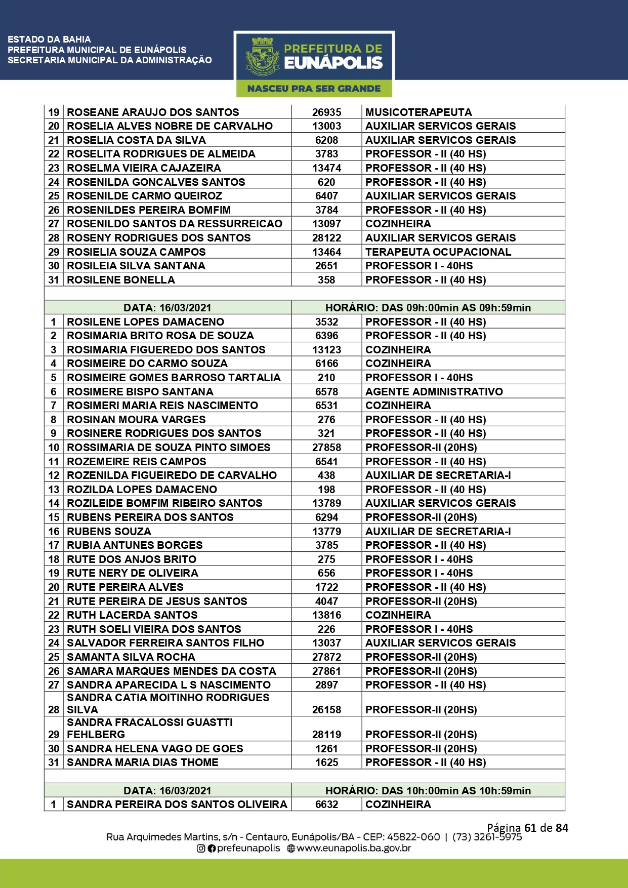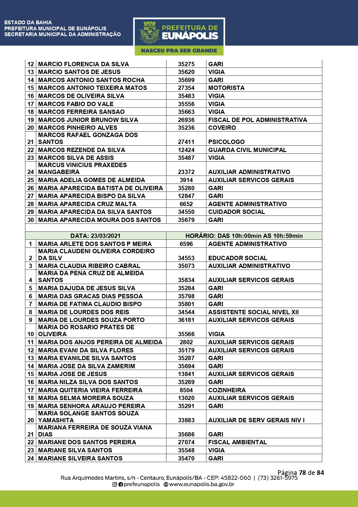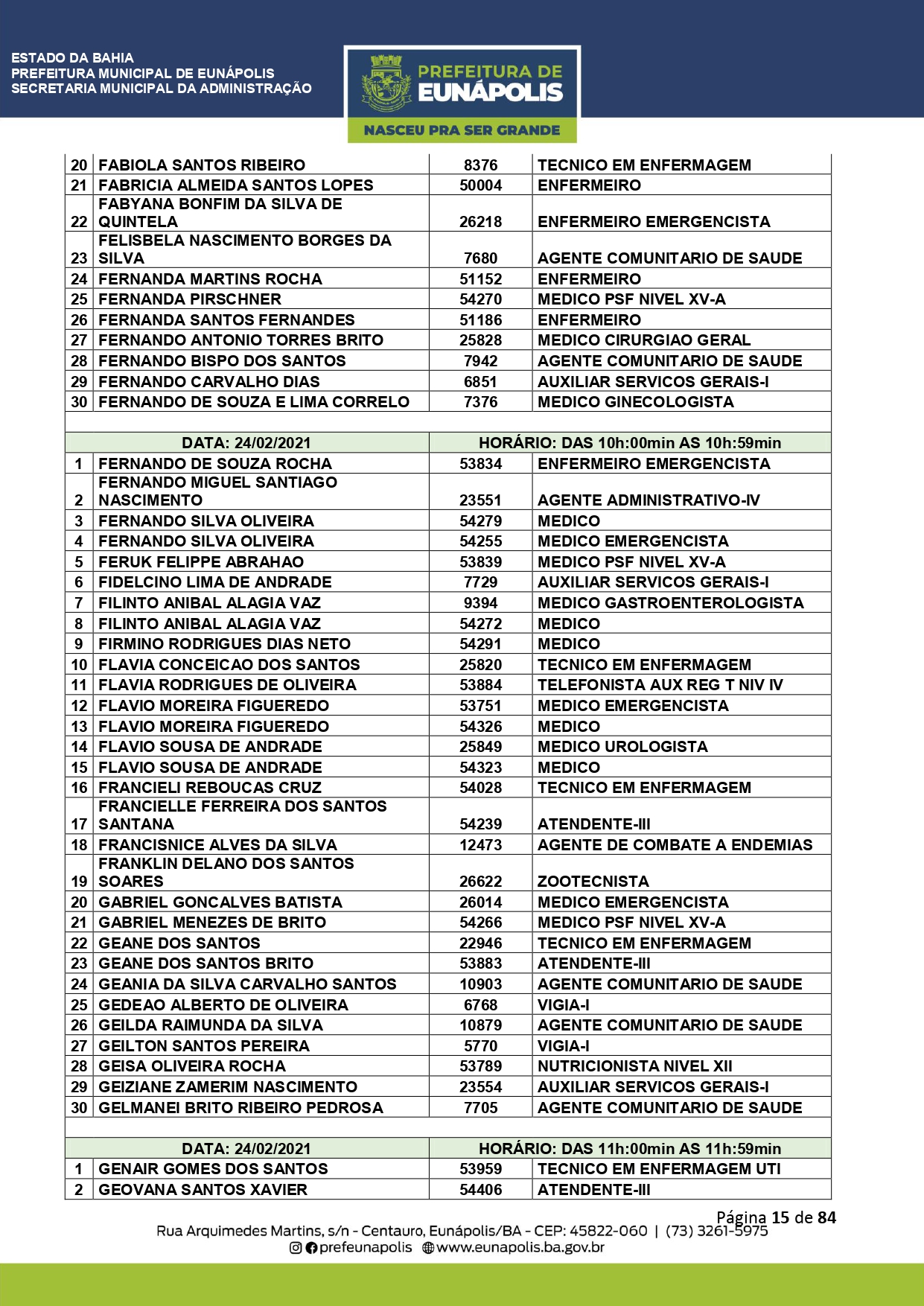 A Prefeitura de Eunápolis informa sobre o recadastramento dos colaboradores efetivos e os que estão em regime de contratação temporária (seletivados). O procedimento, inicialmente programado para o final de janeiro, foi suspenso e agora ocorrerá no período entre 22/02 e 24/03/2021, no horário das 08:00h às 13:00h, no Ginásio de Esportes, situado na Rua Archimedes Martins, 567, bairro Centauro. O atendimento dos servidores será realizado por meio de agendamento, em ordem alfabética, apenas nos dias e horários especificados no cronograma definido por meio da Portaria Nº. 034/2021, publicada hoje, 12, no Diário Oficial do município.