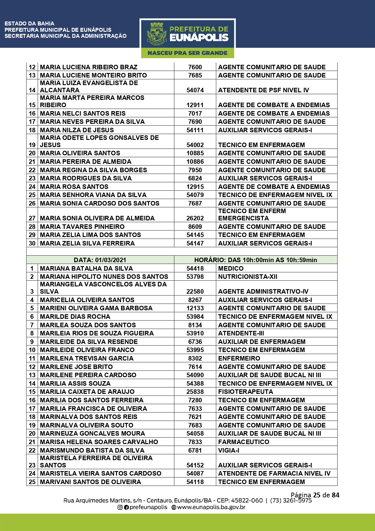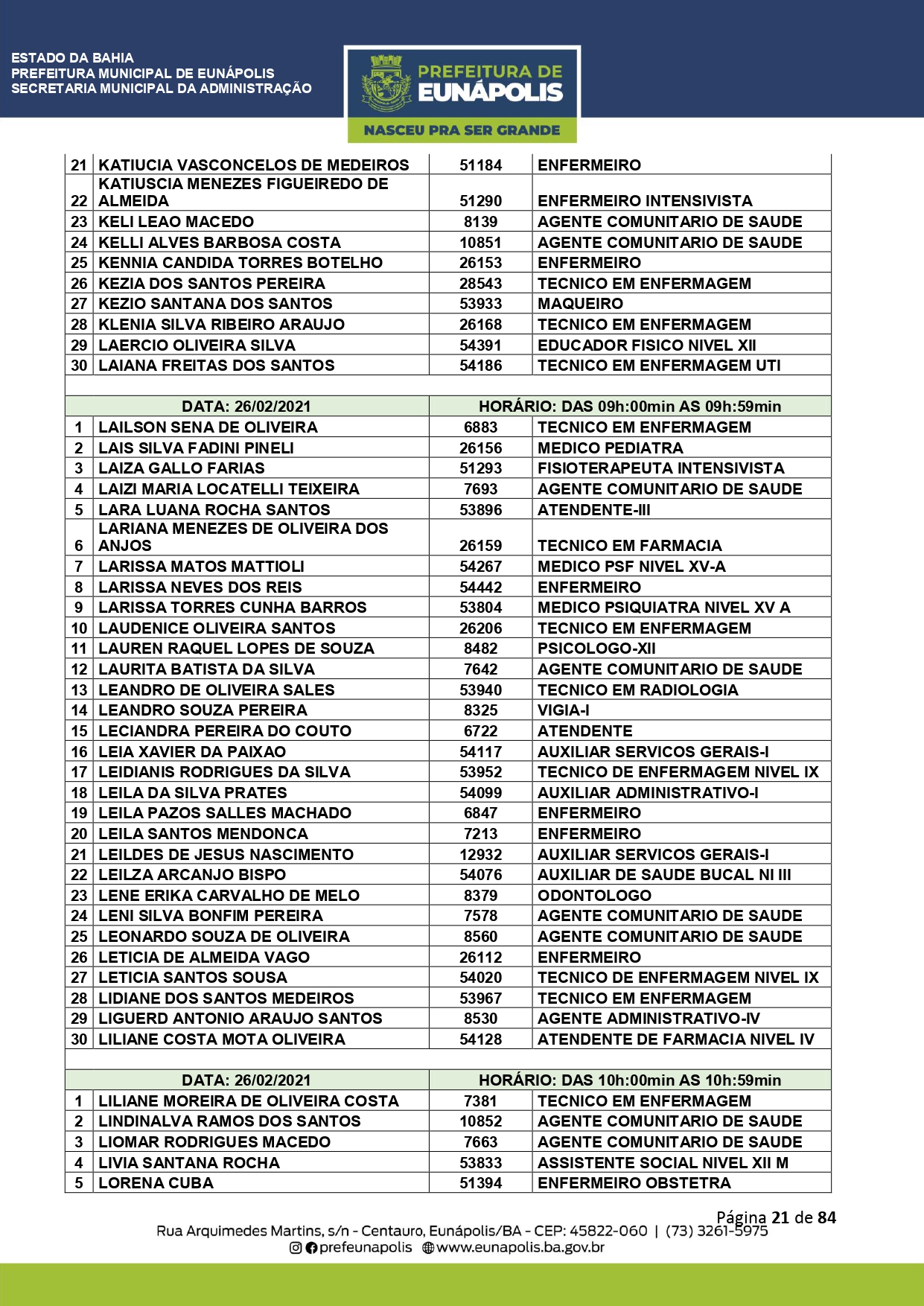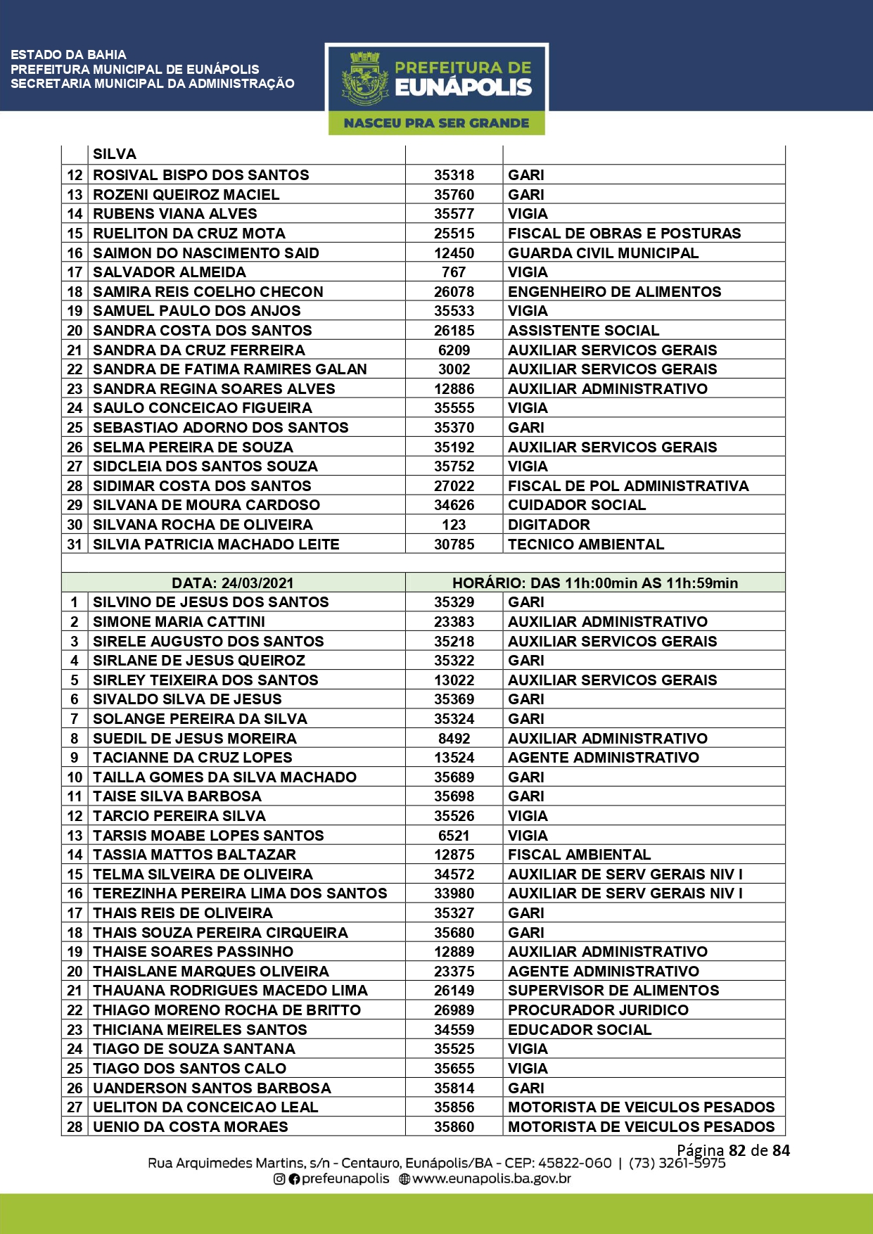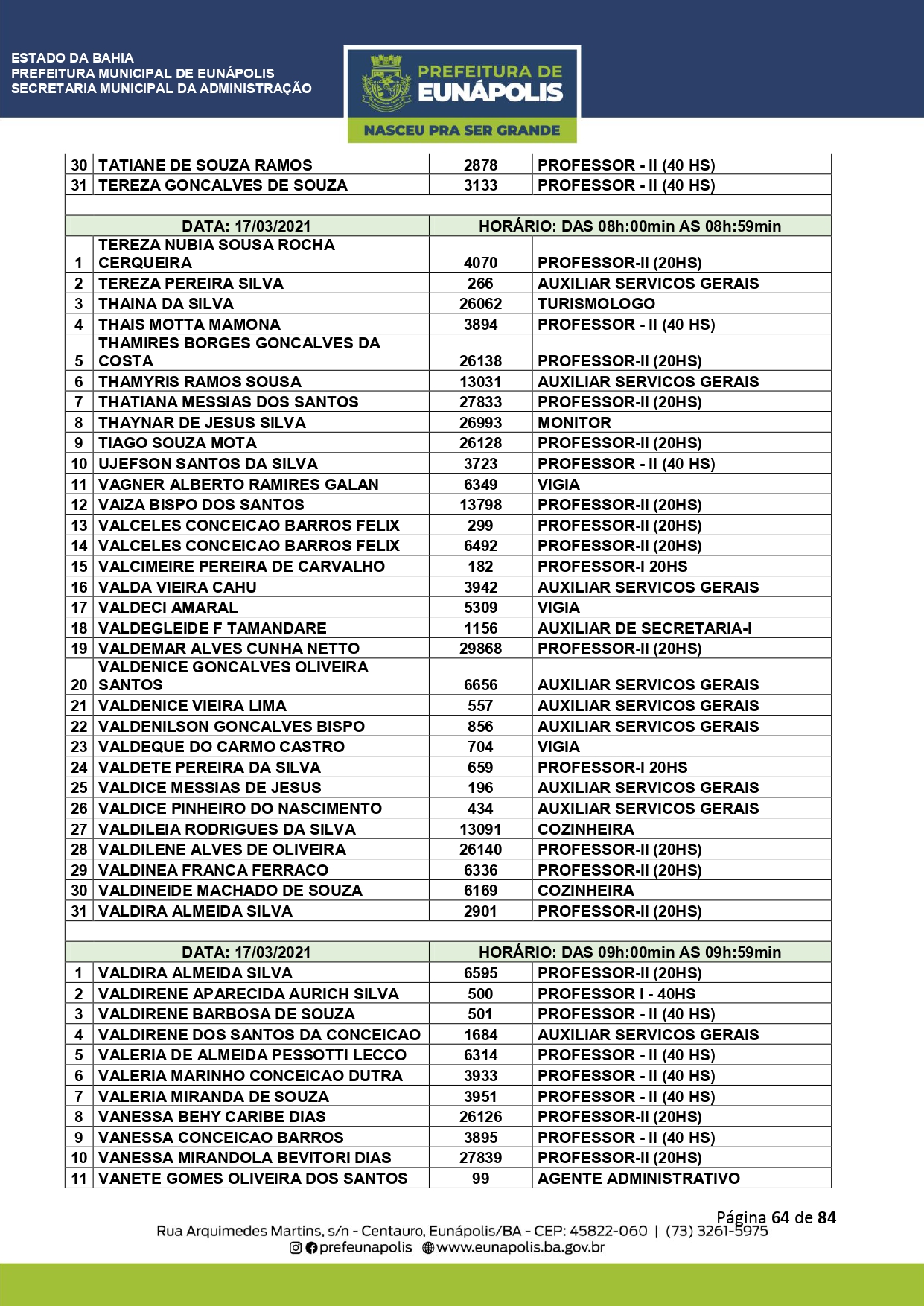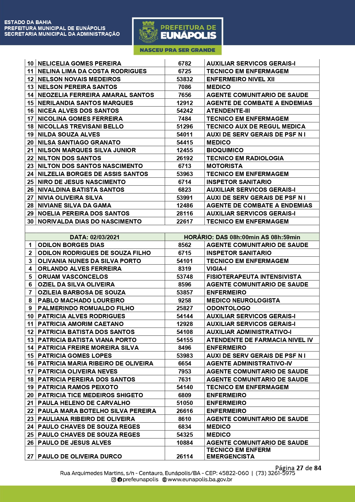 A Prefeitura de Eunápolis informa sobre o recadastramento dos colaboradores efetivos e os que estão em regime de contratação temporária (seletivados). O procedimento, inicialmente programado para o final de janeiro, foi suspenso e agora ocorrerá no período entre 22/02 e 24/03/2021, no horário das 08:00h às 13:00h, no Ginásio de Esportes, situado na Rua Archimedes Martins, 567, bairro Centauro. O atendimento dos servidores será realizado por meio de agendamento, em ordem alfabética, apenas nos dias e horários especificados no cronograma definido por meio da Portaria Nº. 034/2021, publicada hoje, 12, no Diário Oficial do município.