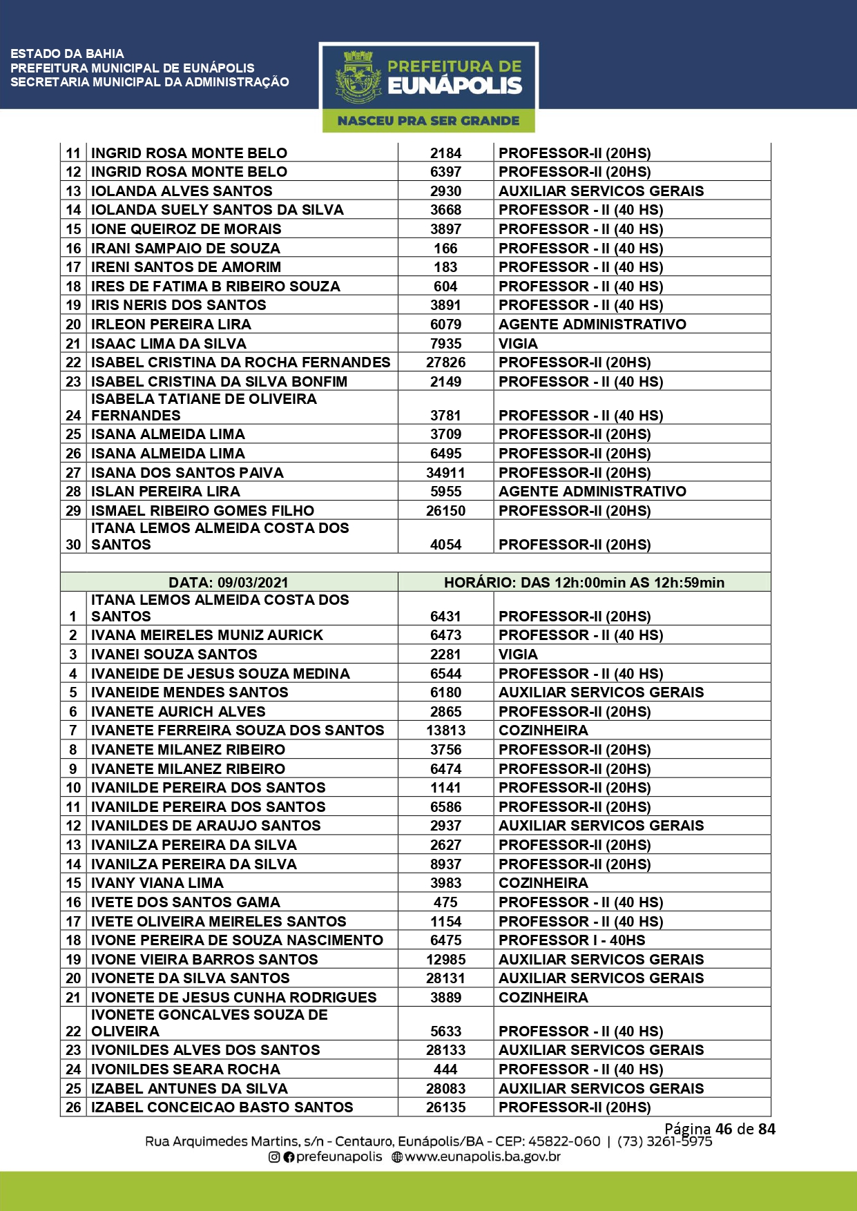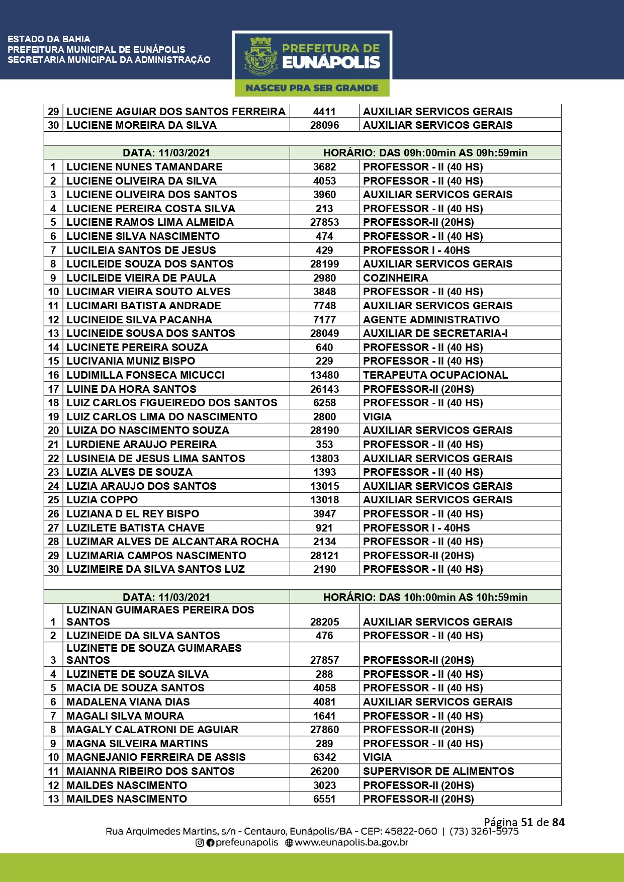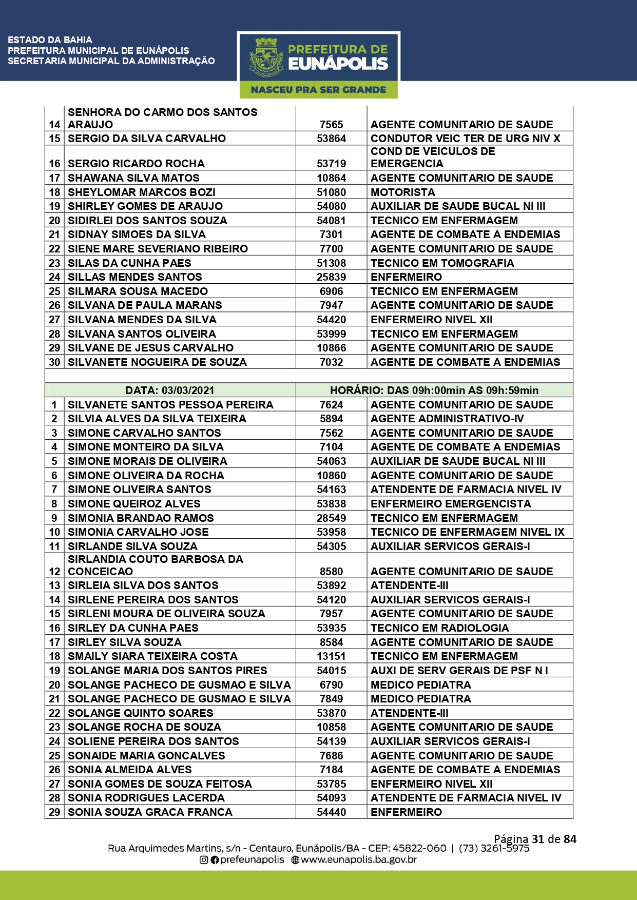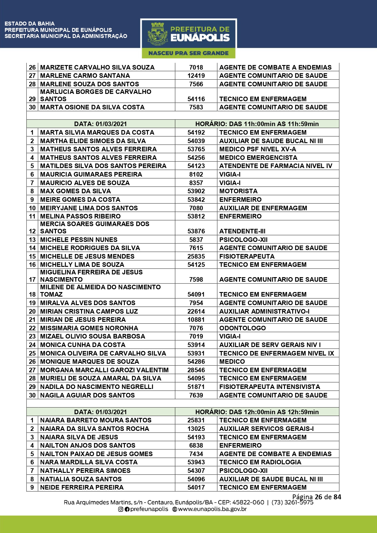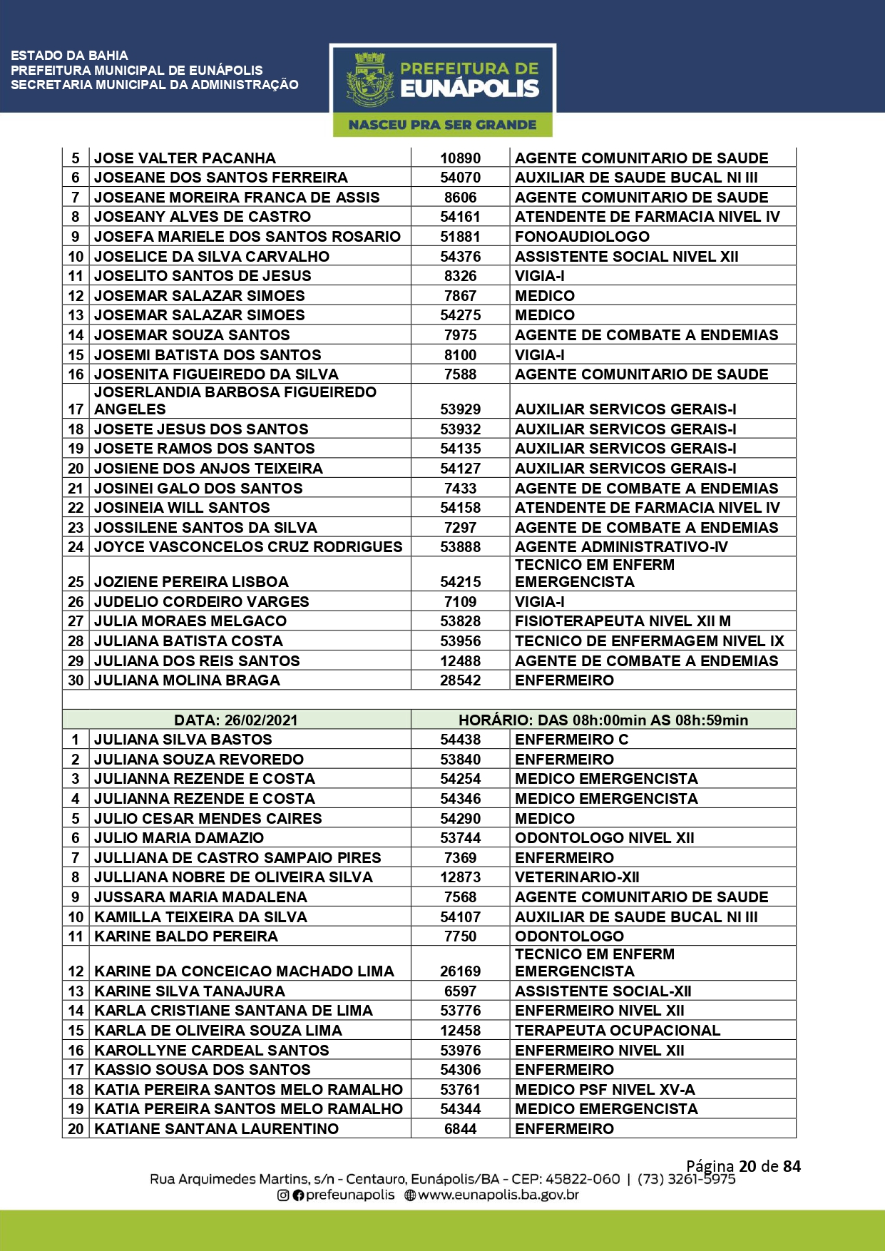 A Prefeitura de Eunápolis informa sobre o recadastramento dos colaboradores efetivos e os que estão em regime de contratação temporária (seletivados). O procedimento, inicialmente programado para o final de janeiro, foi suspenso e agora ocorrerá no período entre 22/02 e 24/03/2021, no horário das 08:00h às 13:00h, no Ginásio de Esportes, situado na Rua Archimedes Martins, 567, bairro Centauro. O atendimento dos servidores será realizado por meio de agendamento, em ordem alfabética, apenas nos dias e horários especificados no cronograma definido por meio da Portaria Nº. 034/2021, publicada hoje, 12, no Diário Oficial do município.