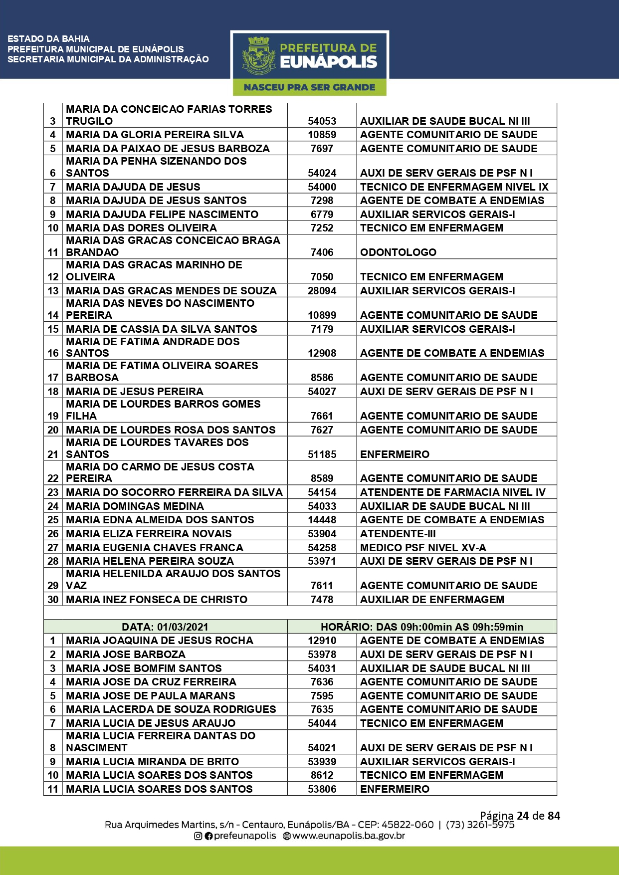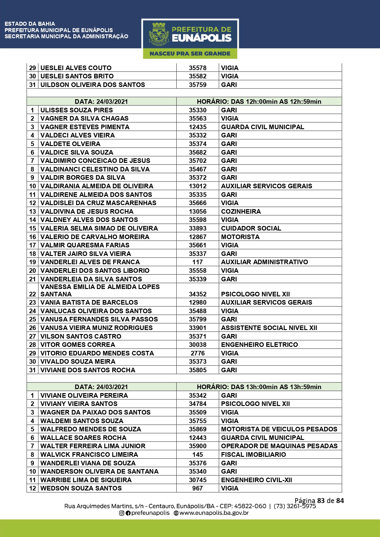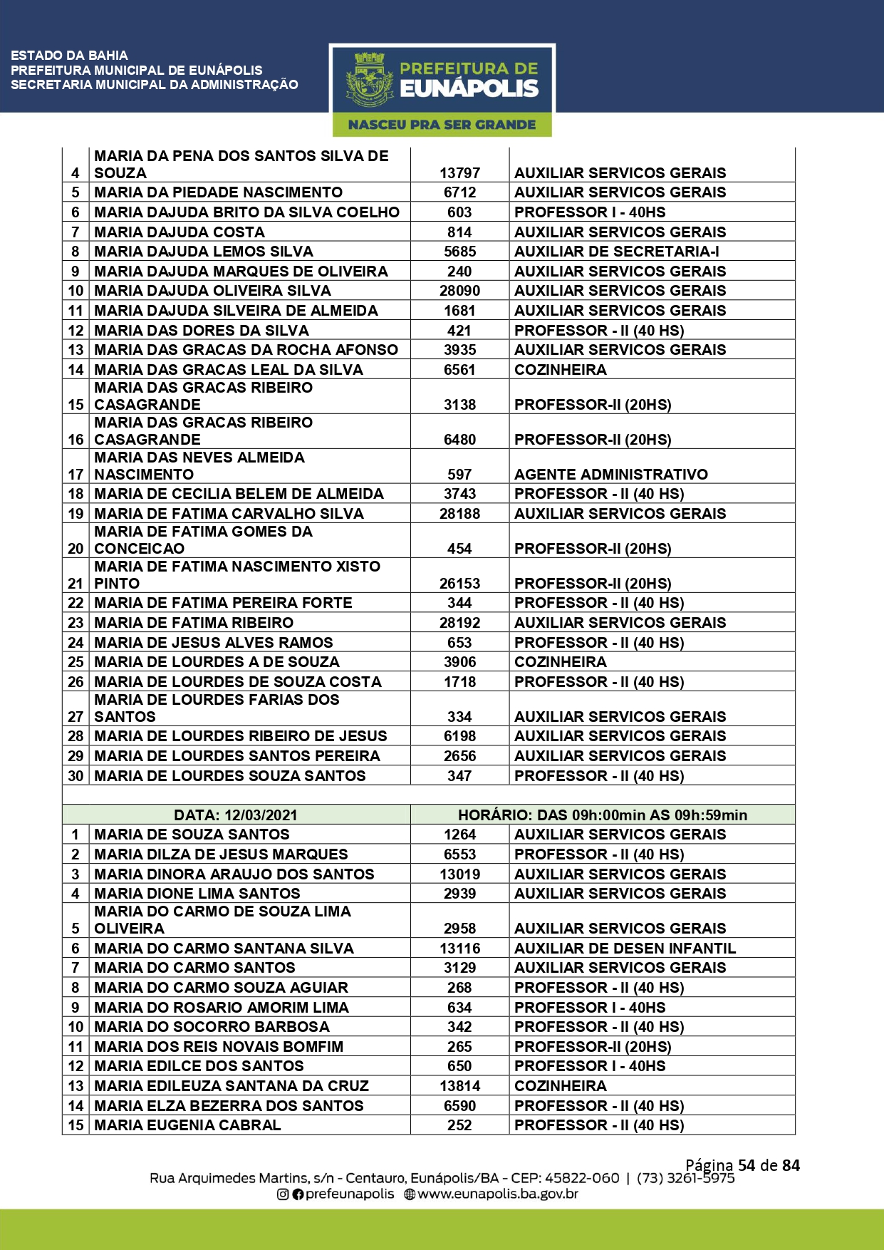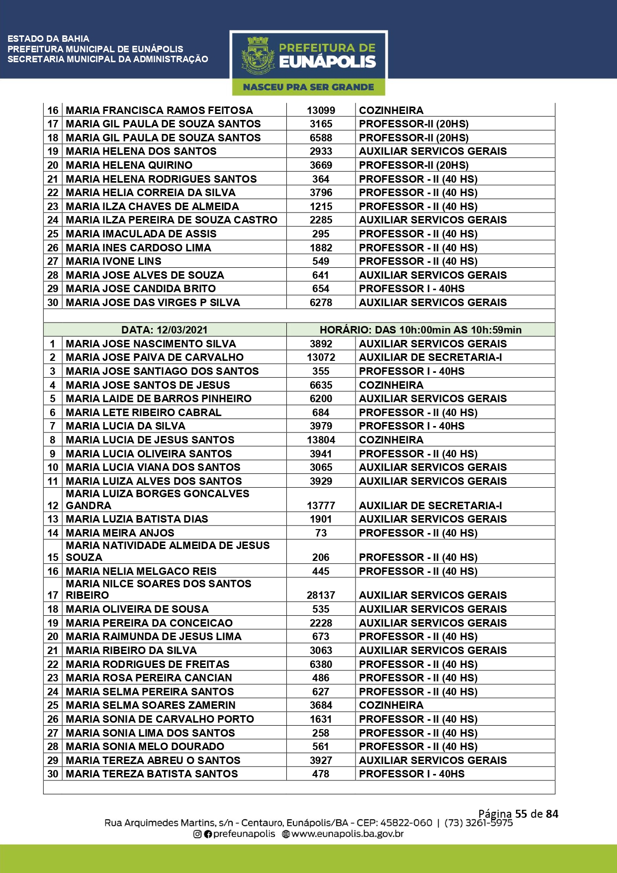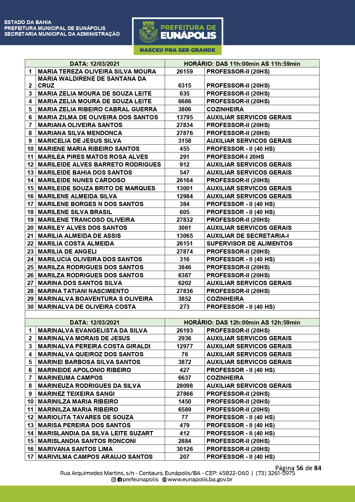 A Prefeitura de Eunápolis informa sobre o recadastramento dos colaboradores efetivos e os que estão em regime de contratação temporária (seletivados). O procedimento, inicialmente programado para o final de janeiro, foi suspenso e agora ocorrerá no período entre 22/02 e 24/03/2021, no horário das 08:00h às 13:00h, no Ginásio de Esportes, situado na Rua Archimedes Martins, 567, bairro Centauro. O atendimento dos servidores será realizado por meio de agendamento, em ordem alfabética, apenas nos dias e horários especificados no cronograma definido por meio da Portaria Nº. 034/2021, publicada hoje, 12, no Diário Oficial do município.