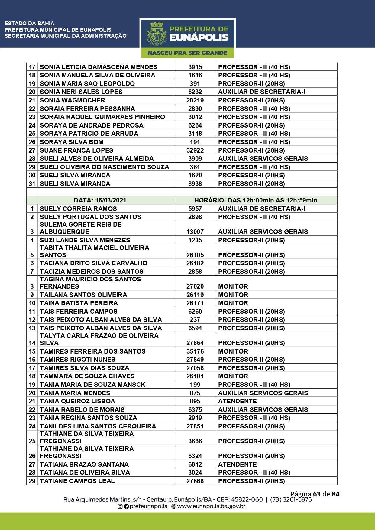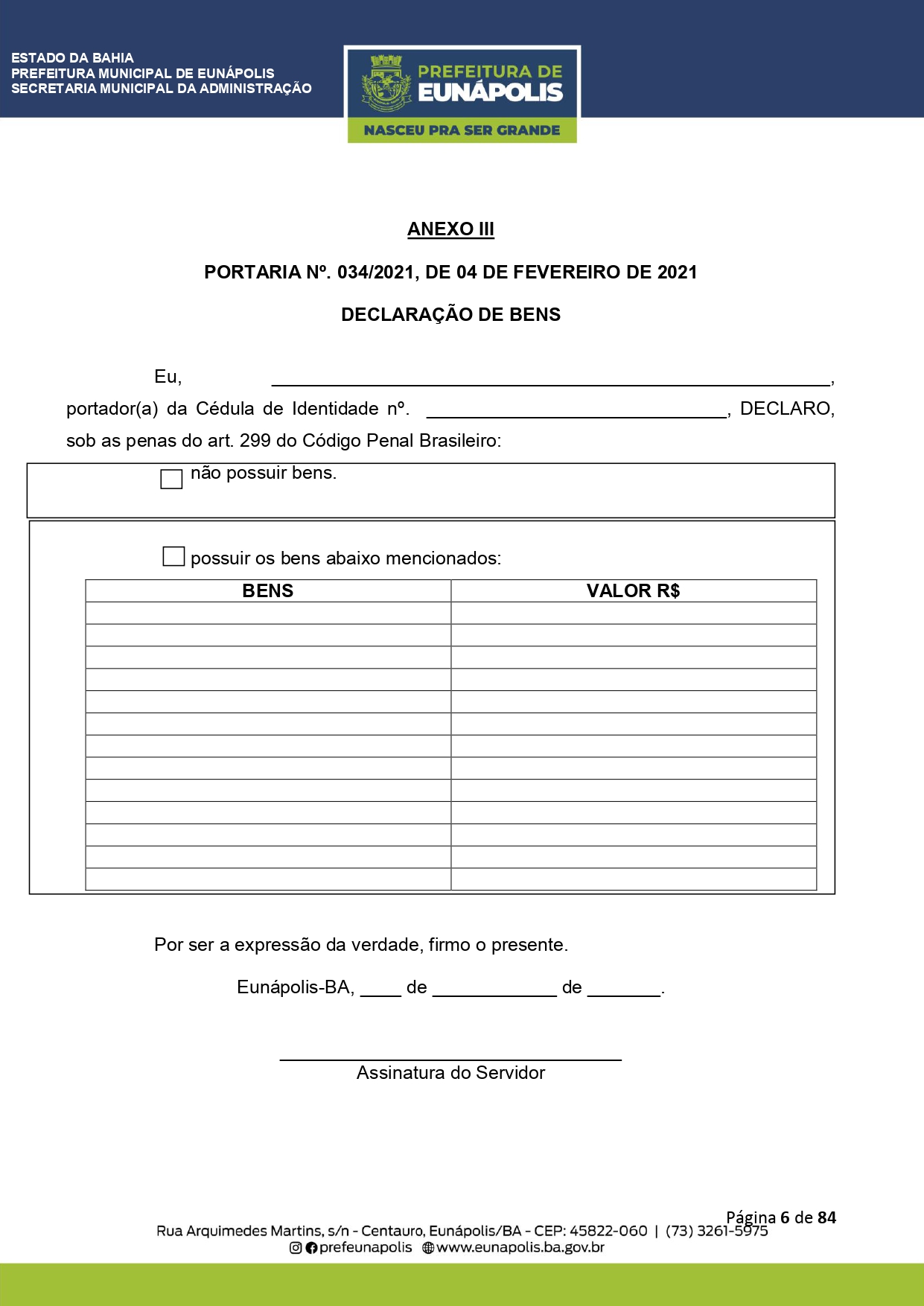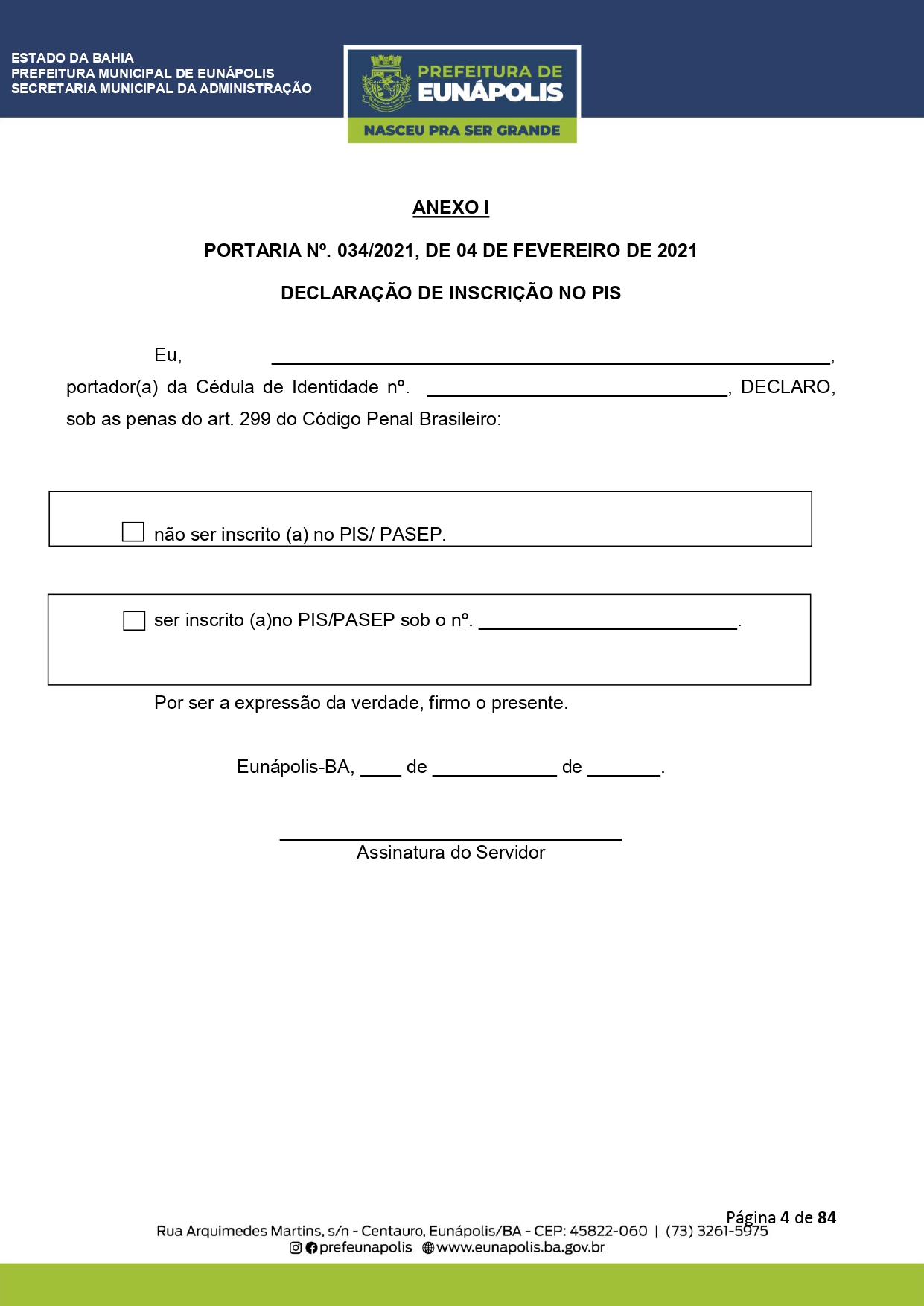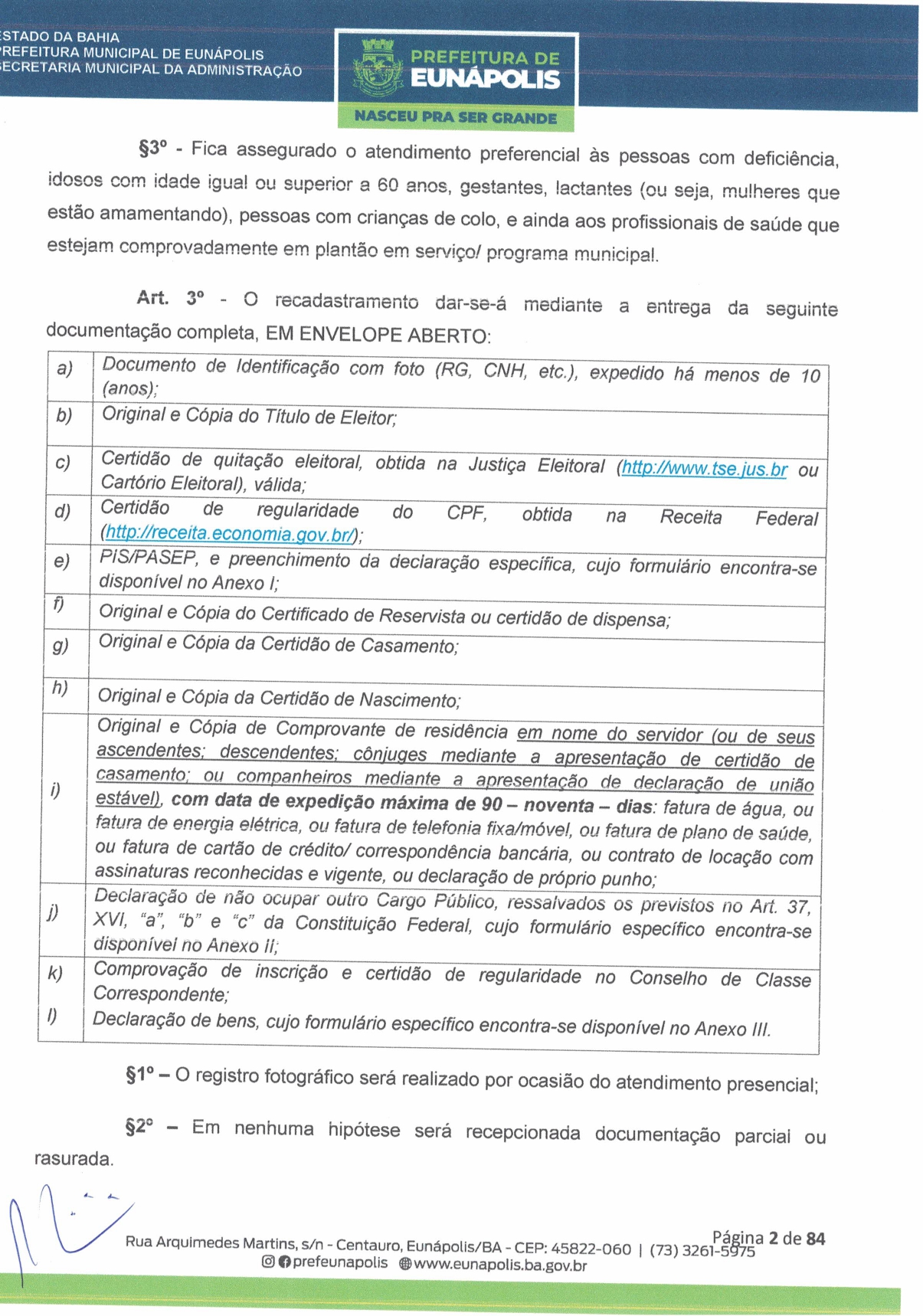 Documentação a ser levada e todos os demais detalhes que visam a atualização dos dados cadastrais dos servidores públicos municipais, você encontra acessando eunapolis.ba.gov.br/Site/ DiarioOficial.