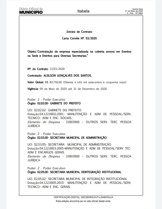 O caso que chamou a atenção foi de a Prefeitura ter contratado serviço de som em meio à crise de uma pandemia que ocasionou a demissão de diversos contratados no município. Por R$ 83.750,00 (oitenta e três mil setecentos e cinquenta reais), o prefeito contratou uma empresa especializada na cobertura sonora em Eventos na Sede e Distritos para Diversas Secretarias, até aí tudo bem, no entanto diversos decretos foram assinados pelo gestor no intuito de evitar aglomerações e ações relativas à prevenção e enfrentamento do coronavírus, além disso muitas famílias do município vem passando por necessidades urgentes, como falta de alimentação, remédios e serviço médico de qualidade.