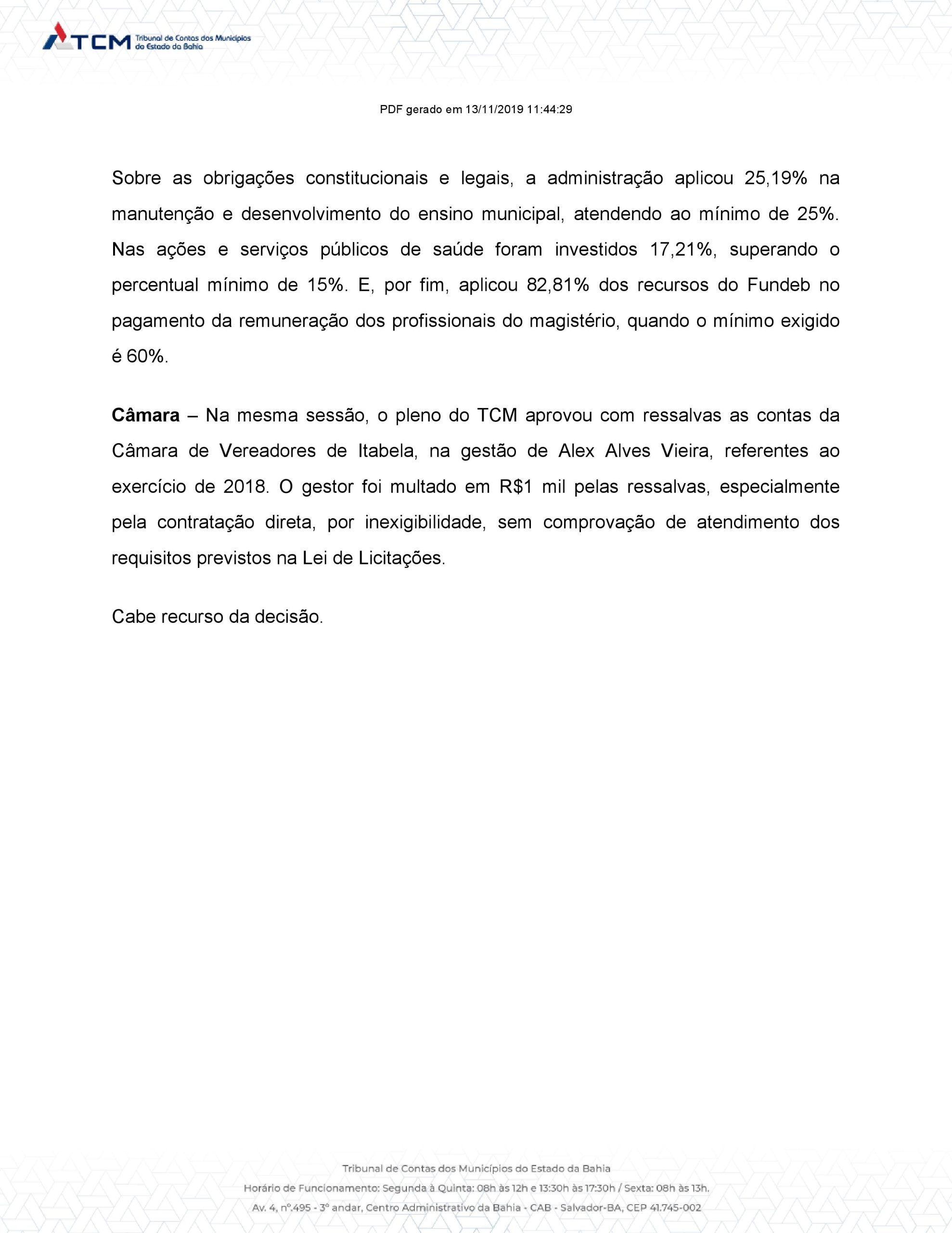 Câmara – Na mesma sessão, o pleno do TCM aprovou com ressalvas as contas da Câmara de Vereadores de Itabela, na gestão de Alex Alves Vieira, referentes ao exercício de 2018. O gestor foi multado em R$1 mil pelas ressalvas, especialmente pela contratação direta, por inexigibilidade, sem comprovação de atendimento dos requisitos previstos na Lei de Licitações.