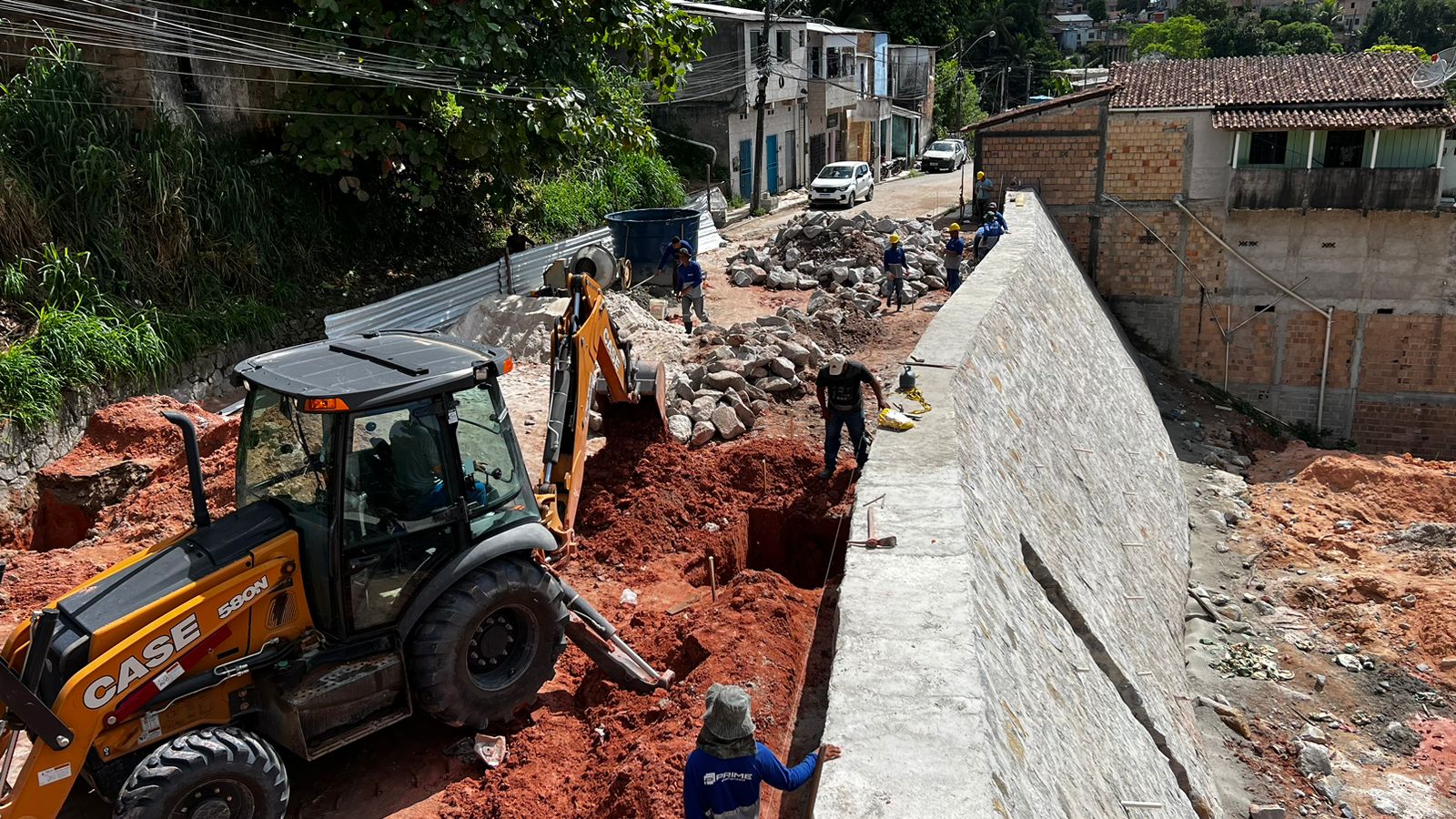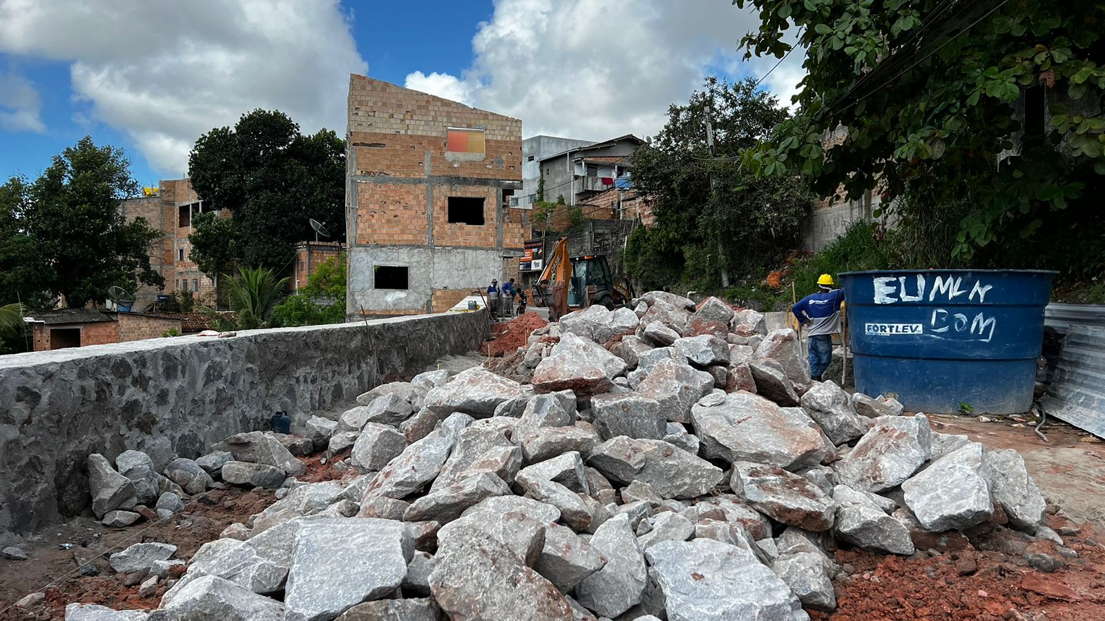Seguem em ritmo acelerado as obras da nova Ladeira do Paraguai. Concluída a etapa de construção do muro de contenção, estamos finalizando o sistema de drenagem, para o escoamento adequado das águas pluviais.