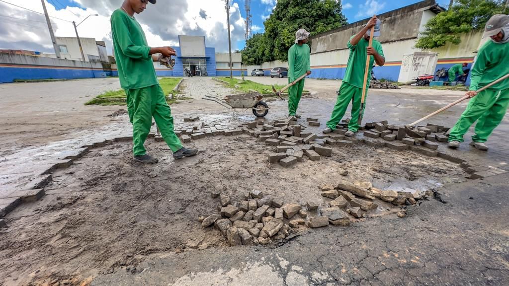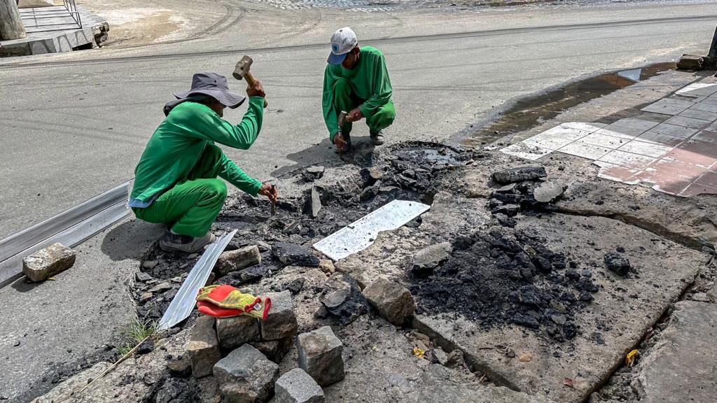 Os trabalhos estão concentrados na infraestrutura, com recuperação de meio-fio, calçadas e pavimentos que foram danificados com o grande volume de chuva.