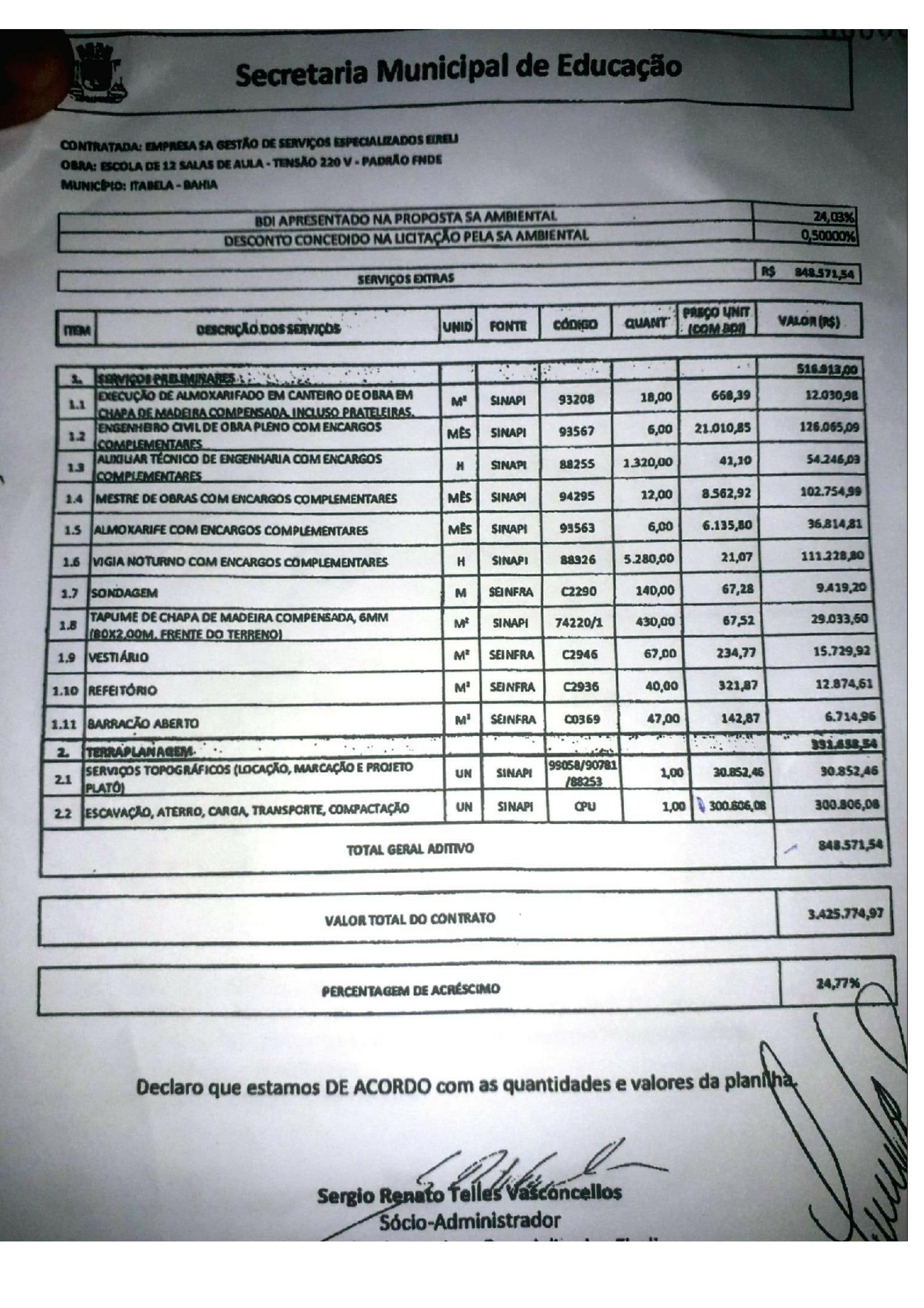 O prefeito mal iniciou a obra do colégio do distrito e concedeu um aditivo de mais de R$ 800 mil, enquanto uma a outra escola no mesmo distrito, Manoel Ribeiro Carneiro, está quase desabando, são infiltrações, parte elétrica e hidráulica danificada e muito mofo. O que não é diferente na sede do município, enquanto gasta milhões em um colégio modelo, outras escolas a exemplo do Maria D´ajuda, Lions Clube e a escola Municipal Abdias Martins Pereira, ambas localizadas na cidade de Itabela, continuam Deus dará.