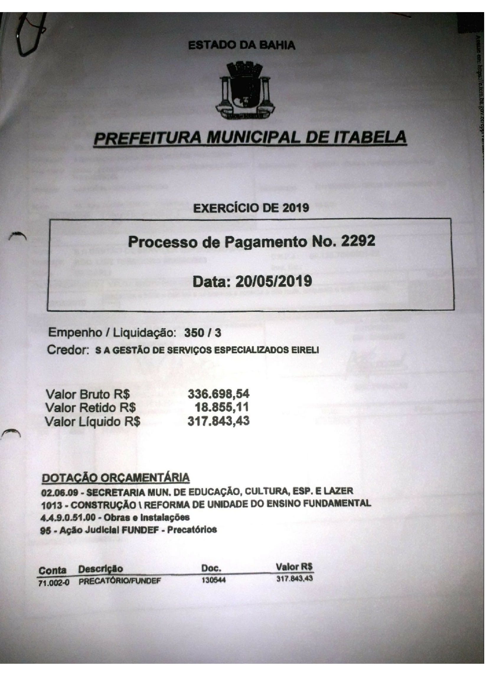 A Prefeitura de Itabela, mal terminou os serviços de terraplanagem no terreno onde será construída uma escola, no distrito de Monte Pascoal e já pagou R$ 830.861,47 e colocou R$ 848.571,54 de ativo. A empresa que venceu o certame licitatório deixou a obra e passou para uma segunda empresa S.A Gestão de Serviços Especializados Eireli, da Cidade de Aracruz-ES.