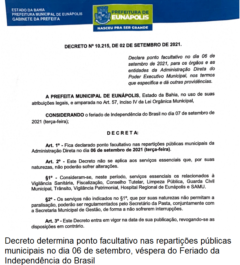 Levando em consideração o feriado de Independência do Brasil, na terça-feira, dia 07, a Prefeitura de Eunápolis decretou ponto facultativo nas repartições públicas municipais na segunda-feira, dia 06.