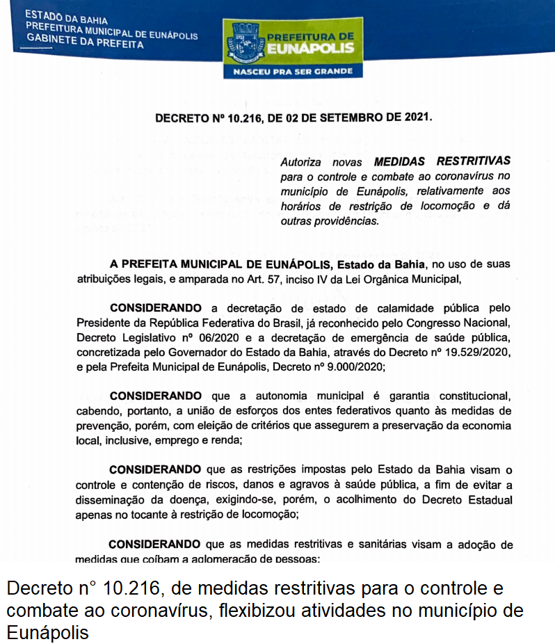A Prefeitura de Eunápolis publicou no Diário Oficial do Município, na quinta-feira, dia 03, o decreto n° 10.216, com novas medidas de flexibilização em relação ao controle e combate ao coronavírus.