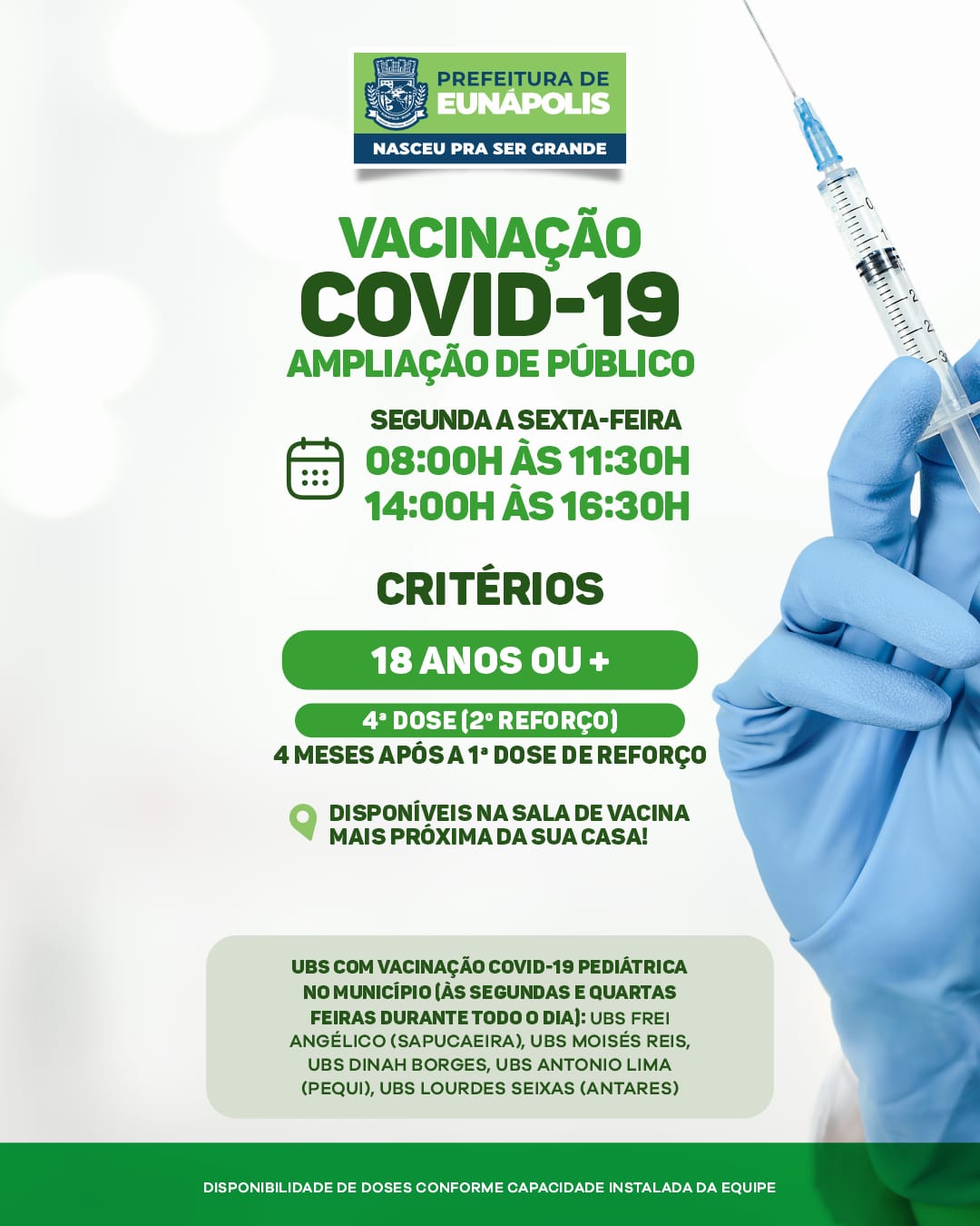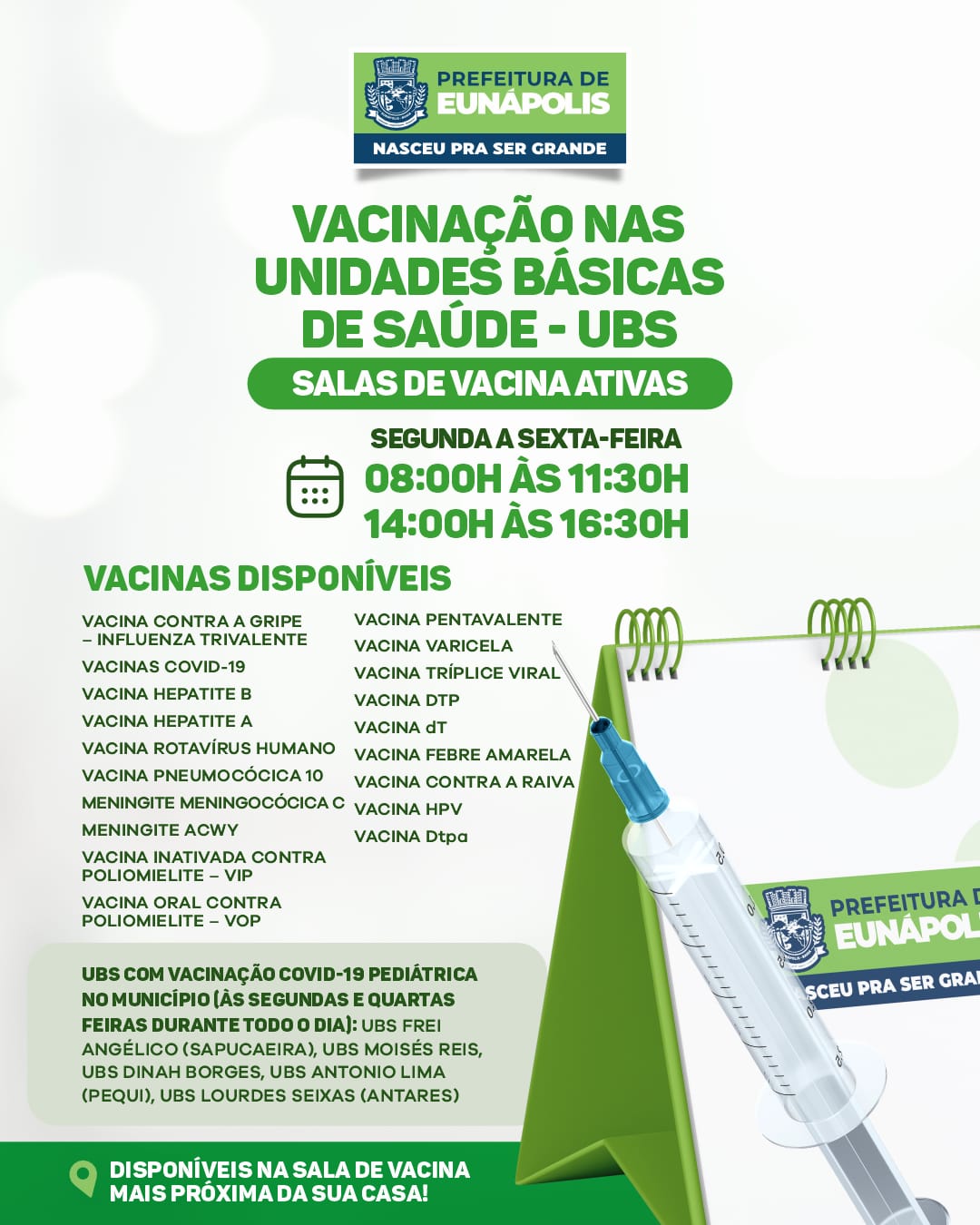 A Prefeitura de Eunápolis, por meio da Secretaria Municipal de Saúde, reforça à população eunapolitana a importância da imunização e atualização da situação vacinal de todas as faixas etárias.
