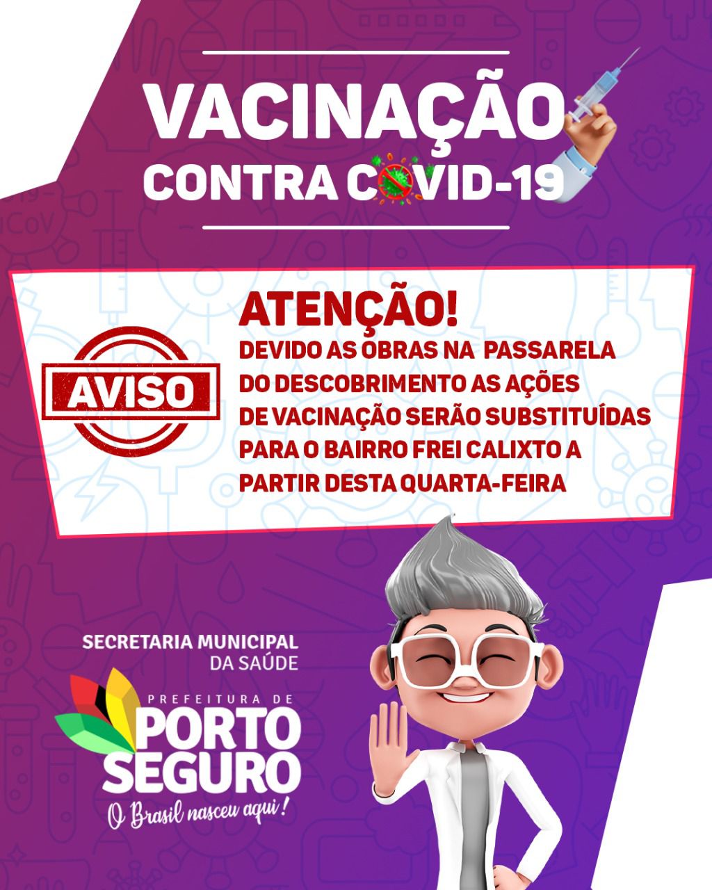 🚨ATENÇÃO: Devido as obras 🚧 na Passarela do Descobrimento, as ações de vacinação serão substituídas para o bairro Frei Calixto a partir desta quarta-feira.🚨