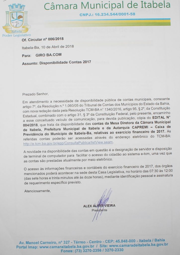 ITABELA- O presidente da câmera de vereadores, Alex Alves Vieira prestando pela transparência, e obedecendo ao quer reges as leis dos tribunais de contas dos municípios e do estado da Bahia vem pública as suas contas relativas aos exercícios financeiros de 2017 da câmera de vereadores.