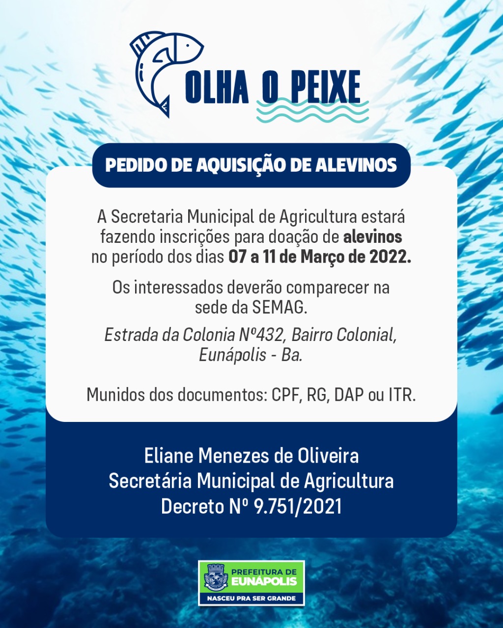 O produtor que tiver interesse adquirir as doações dos alevinos basta procurar a secretaria Municipal de Agricultura, ou na sede da SEMAG, localizado na estrada da colônia Nº 432, Bairro Colonial, em Eunápolis – Ba.
