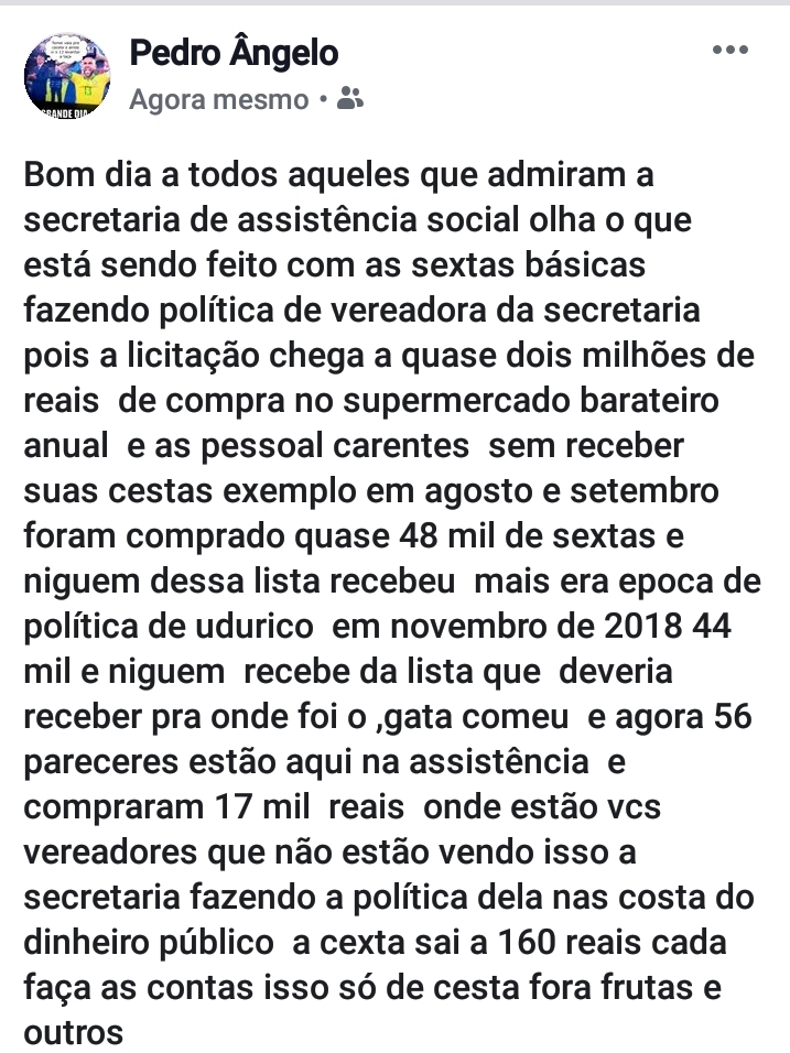 Bastante chateada com a situação, a secretária repudia a matéria que foi veiculada que afirma que certamente tal material tem conteúdo e conotação política, infelizmente eu não tenho como saber quem foi que redigiu o material, pois, quem o fez, agiu com muita malicia, mas a profissional afirma que nenhuma das situações procede. Eu apenas não posso expor a vida pessoal das pessoas que recebem as cestas básicas.
